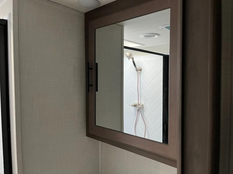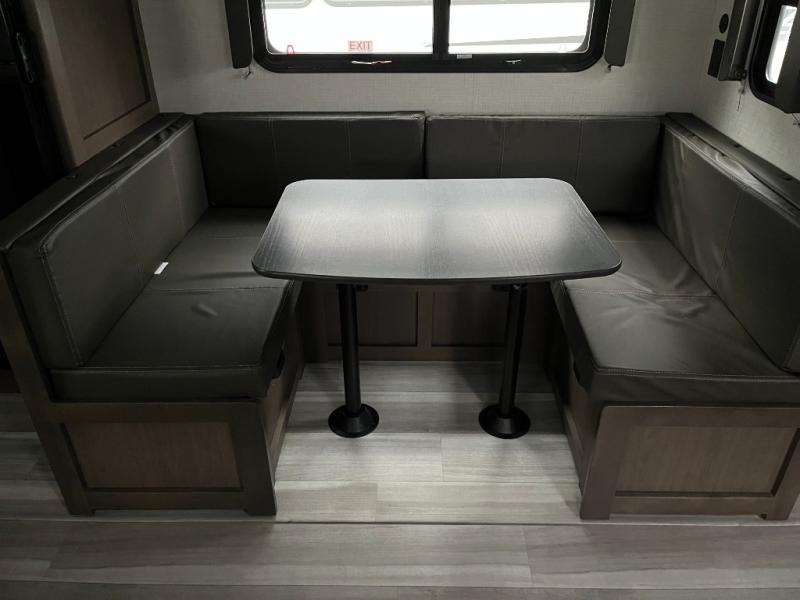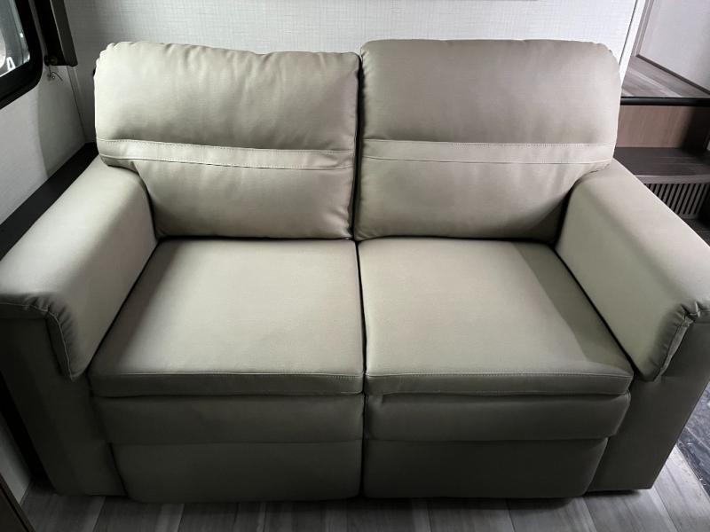 Step inside the Cougar Sport 2700BH and instantly enjoy a bright, open living area. Large panoramic windows bring in natural light and create an inviting space that feels larger than its footprint. The comfortable sofa and dinette provide flexible seating for meals, games, and quality time with family or friends. The smart layout keeps every inch functional and free of clutter, giving you room to relax and enjoy the journey.