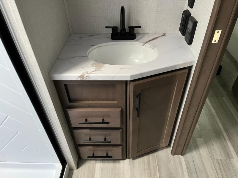 Enjoy the convenience of your own full bathroom with a shower, toilet, and vanity — no need to rely on shared campground facilities. The functional layout and quality fixtures make daily routines easier and more comfortable, enhancing your overall travel experience.