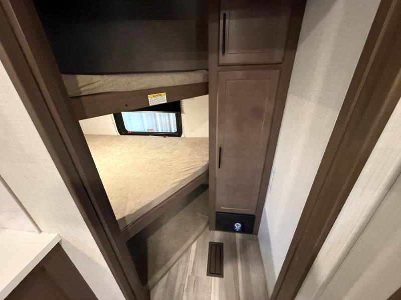 This lightweight Cougar Sport bunk model features sleeping for ten or more with triple stacked bed bunks in the rear bunkhouse, a large U-shaped dinette that can be transformed into sleep space, as well as a tri-fold sofa sleeper and a queen bed in the private bedroom up front. A fully equipped kitchen with an overhead microwave, a three burner range, and large sink plus storage will make it easy to keep everyone fed and happy. A 10.4 Cu. Ft. 12 volt refrigerator will keep all of your perishable items fresh, and there are plenty of cabinets for storing snacks and dry goods as well. Head up the steps to the bathroom featuring a shower with a skylight, sink with an overhead medicine cabinet, and toilet. The private front bedroom takes you away from the hustle and bustle of the main living area and bunkhouse to provide a relaxing retreat including a comfy queen bed, dual nightstands and a wardrobe for clothes!