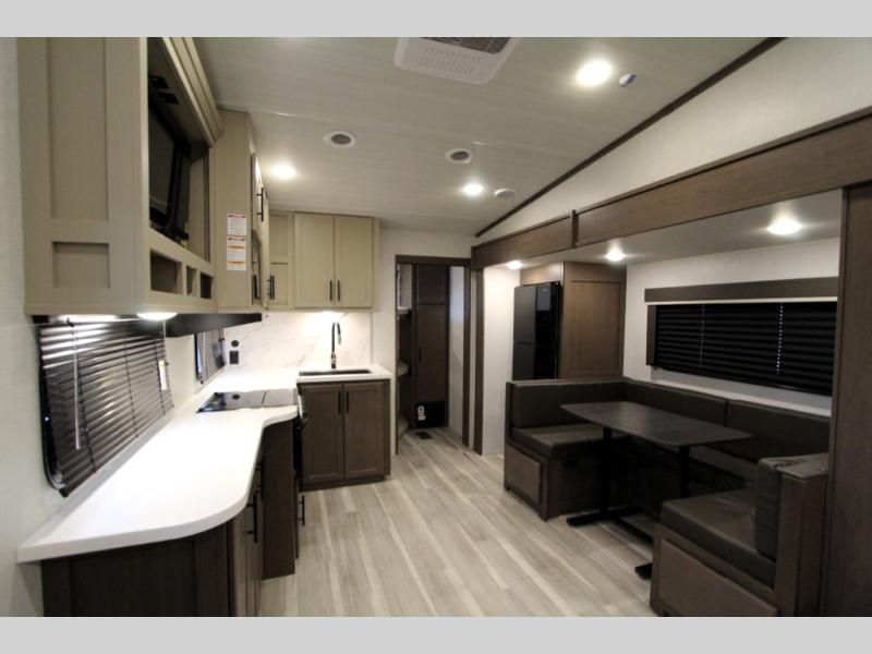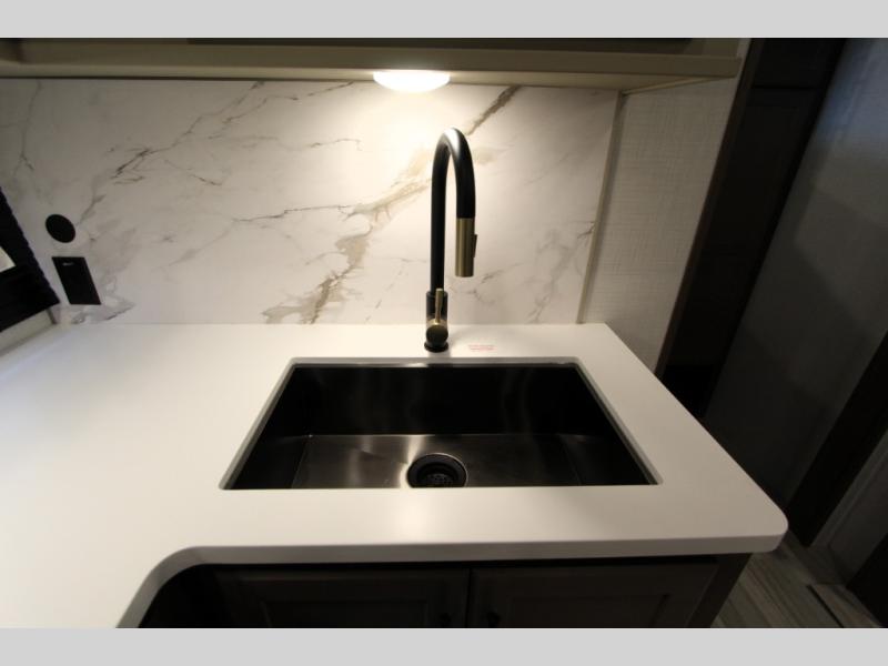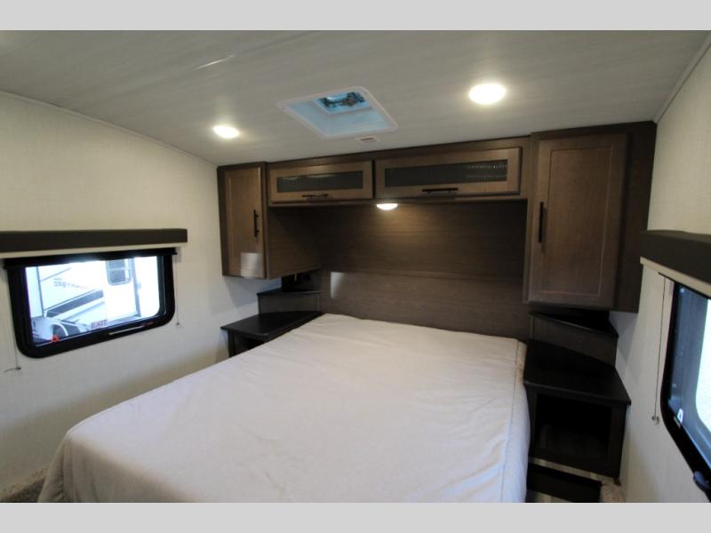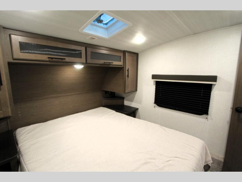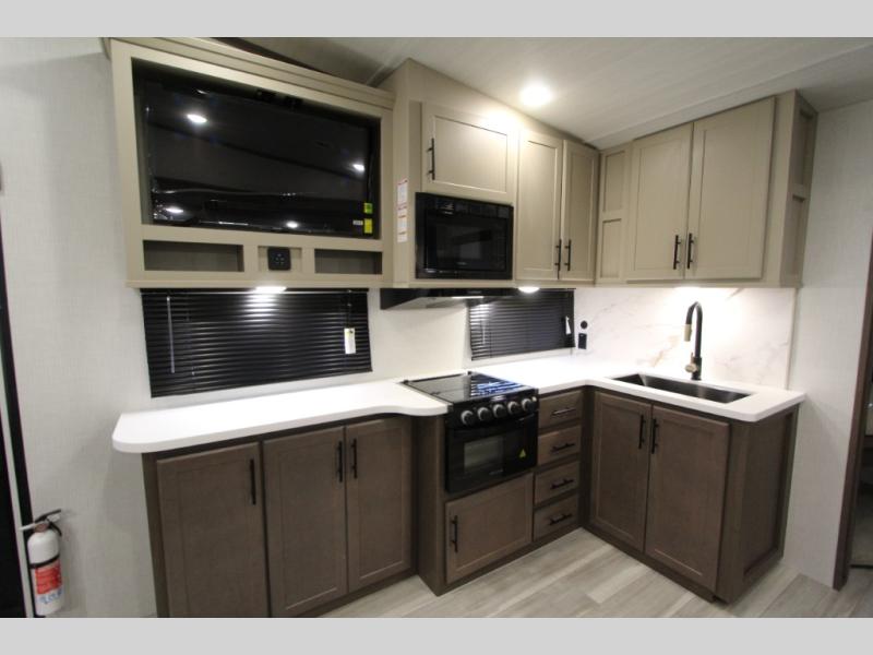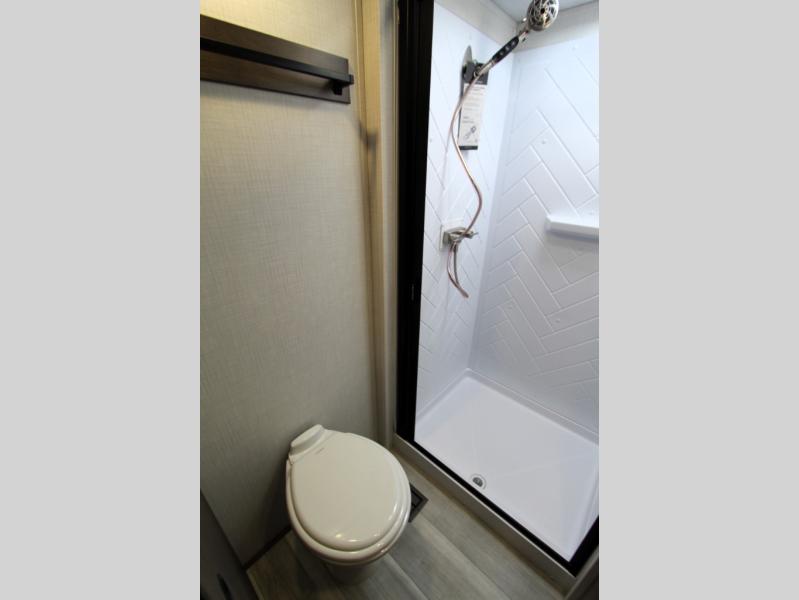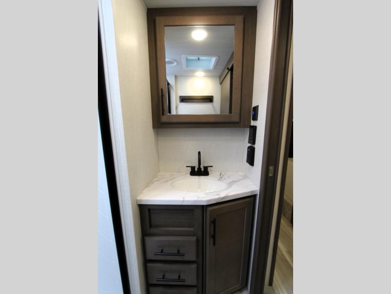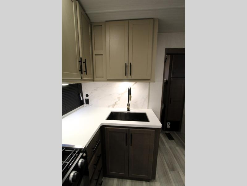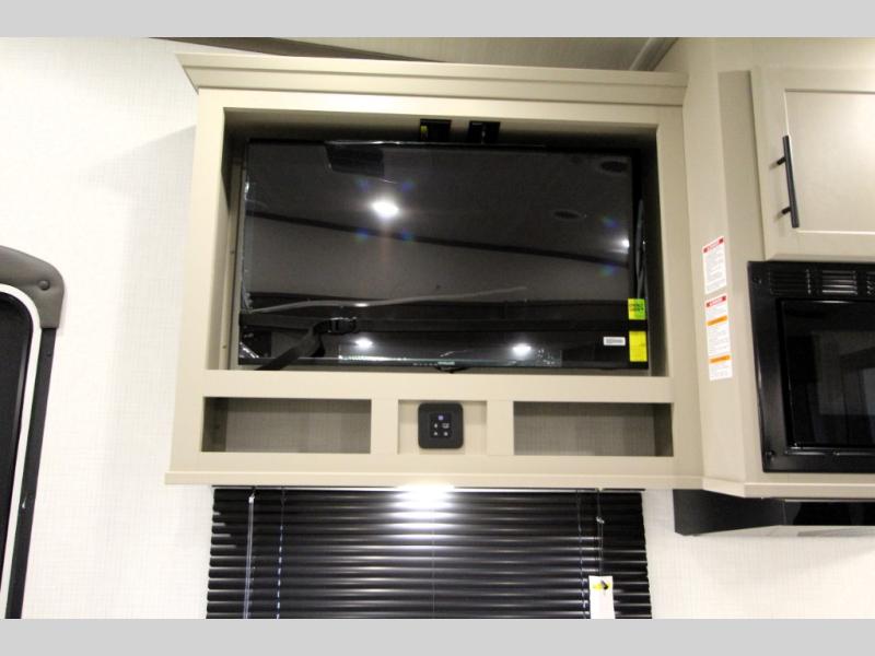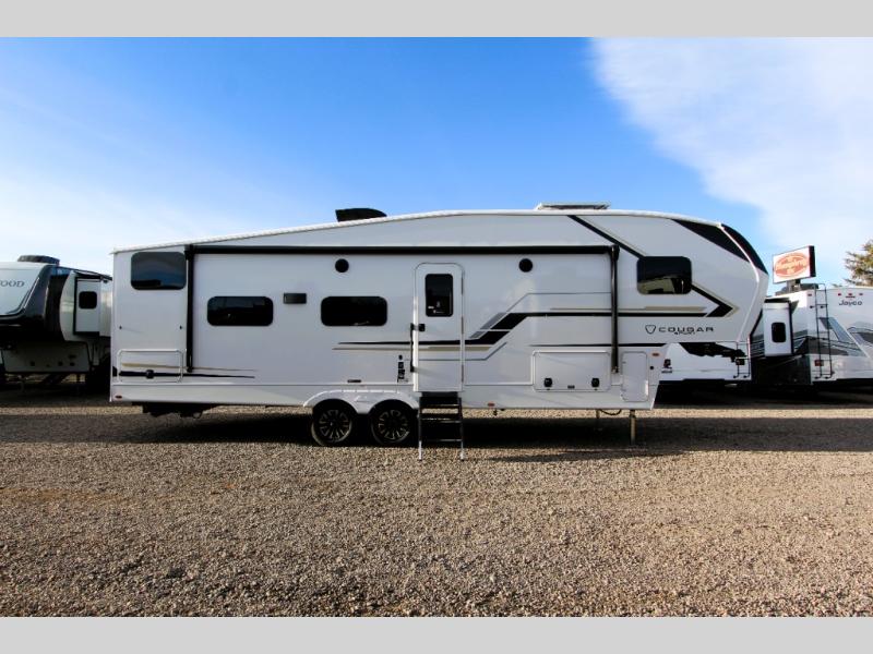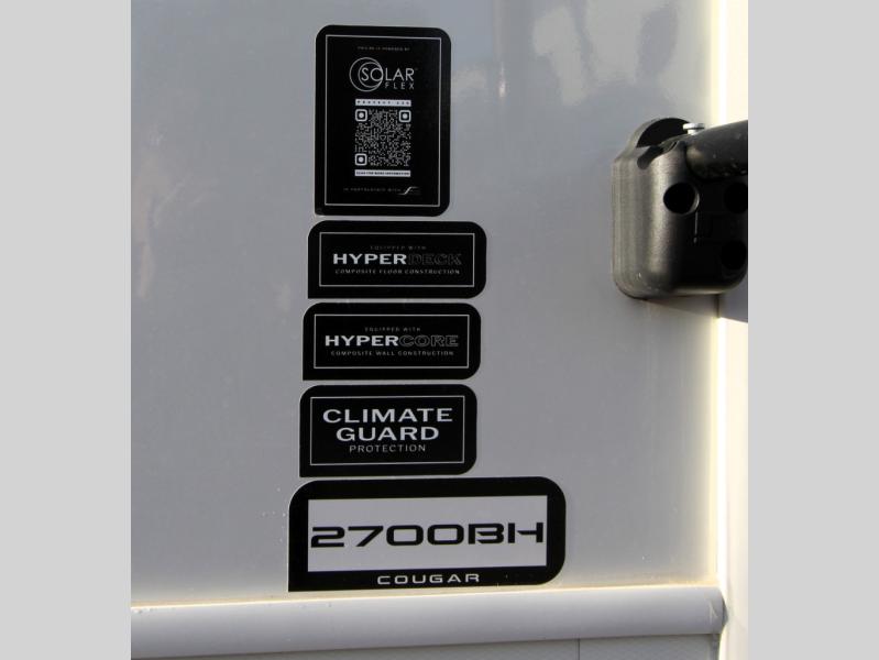 The Cougar Sport structural I-beam frame with stamped steel cross-members and outriggers, plus its AlphaPly roof membrane are what active RVers love about the construction of the Cougar line. The Cougar Sport models are no exception when it comes to a great package, as well as being smaller and lighter weight than their big brother Cougar models. A one-piece, heated and enclosed polypropylene underbelly will add protection against the elements, and the electric stabilizer jacks will provide more stability. On the inside, residential shaker style hardwood cabinet doors and decorative crown molding, plus seamless pressed countertops and an on-demand water heater will make your unit feel even more like home. You are also sure to appreciate the shiplap style decorative accent wall behind the bed, a porcelain foot flush toilet in the bathroom, plus residential kitchen hardware, and so much more.