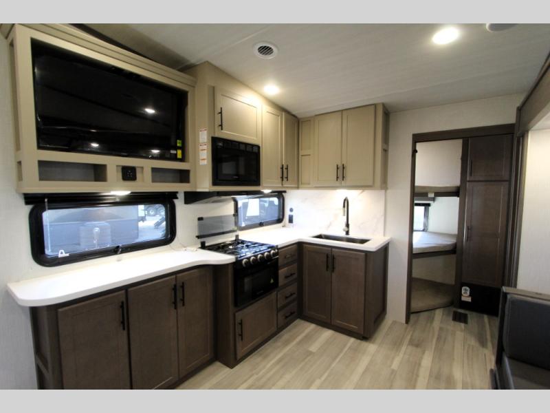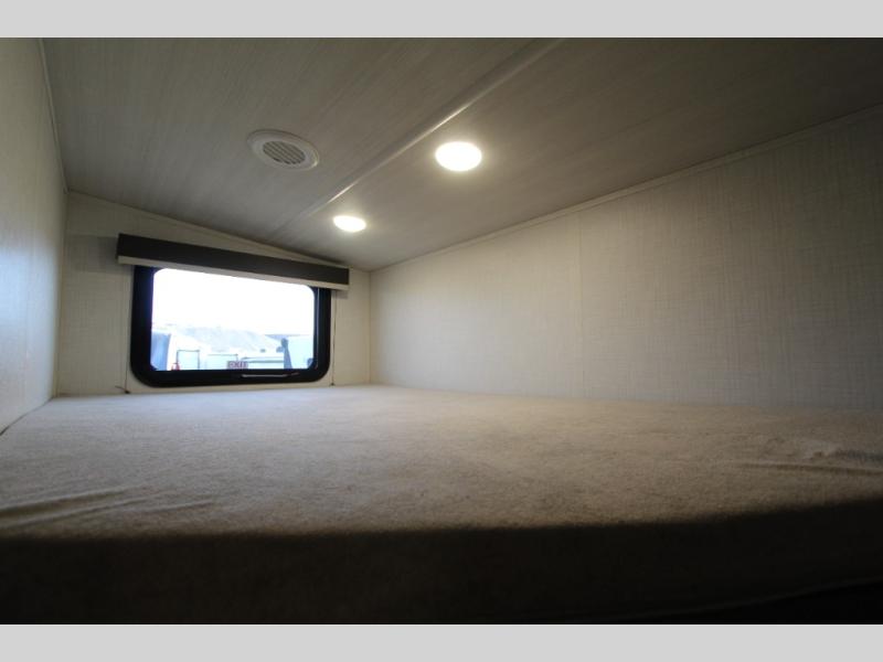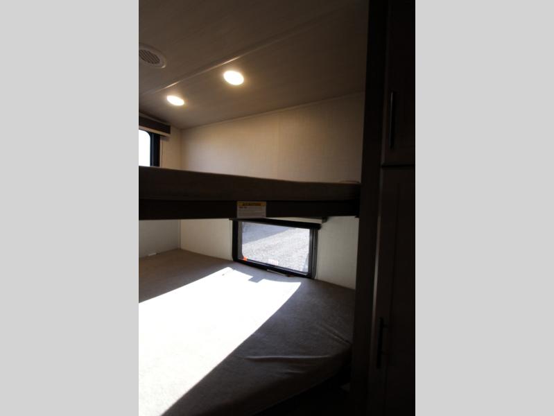 This lightweight Cougar Sport bunk model features sleeping for ten or more with triple stacked bed bunks in the rear bunkhouse, a large U-shaped dinette that can be transformed into sleep space, as well as a tri-fold sofa sleeper and a queen bed in the private bedroom up front. A fully equipped kitchen with an overhead microwave, a three burner range, and large sink plus storage will make it easy to keep everyone fed and happy. A 10.4 Cu. Ft. 12 volt refrigerator will keep all of your perishable items fresh, and there are plenty of cabinets for storing snacks and dry goods as well. Head up the steps to the bathroom featuring a shower with a skylight, sink with an overhead medicine cabinet, and toilet. The private front bedroom takes you away from the hustle and bustle of the main living area and bunkhouse to provide a relaxing retreat including a comfy queen bed, dual nightstands and a wardrobe for clothes!
