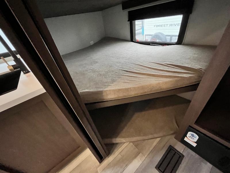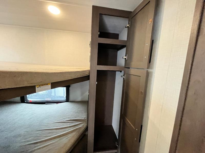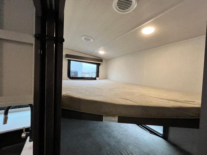 This lightweight Cougar Sport bunk model features sleeping for ten or more with triple stacked bed bunks in the rear bunkhouse, a large U-shaped dinette that can be transformed into sleep space, as well as a tri-fold sofa sleeper and a queen bed in the private bedroom up front. A fully equipped kitchen with an overhead microwave, a three burner range, and large sink plus storage will make it easy to keep everyone fed and happy. A 10.4 Cu. Ft. 12 volt refrigerator will keep all of your perishable items fresh, and there are plenty of cabinets for storing snacks and dry goods as well. Head up the steps to the bathroom featuring a shower with a skylight, sink with an overhead medicine cabinet, and toilet. The private front bedroom takes you away from the hustle and bustle of the main living area and bunkhouse to provide a relaxing retreat including a comfy queen bed, dual nightstands and a wardrobe for clothes!