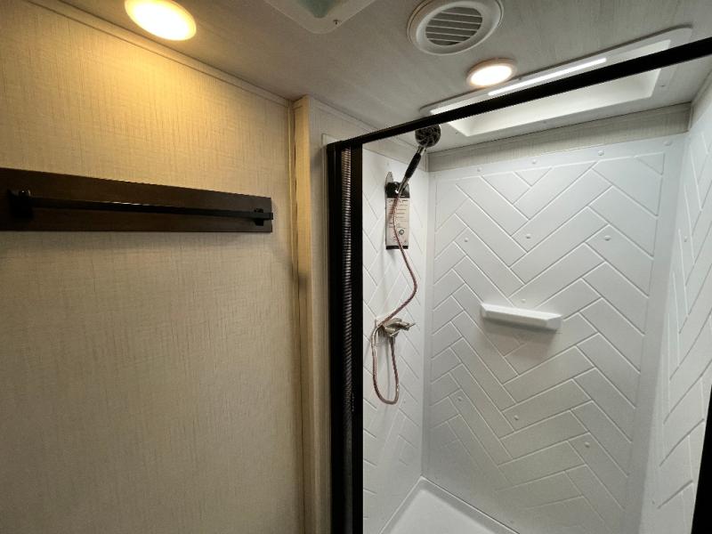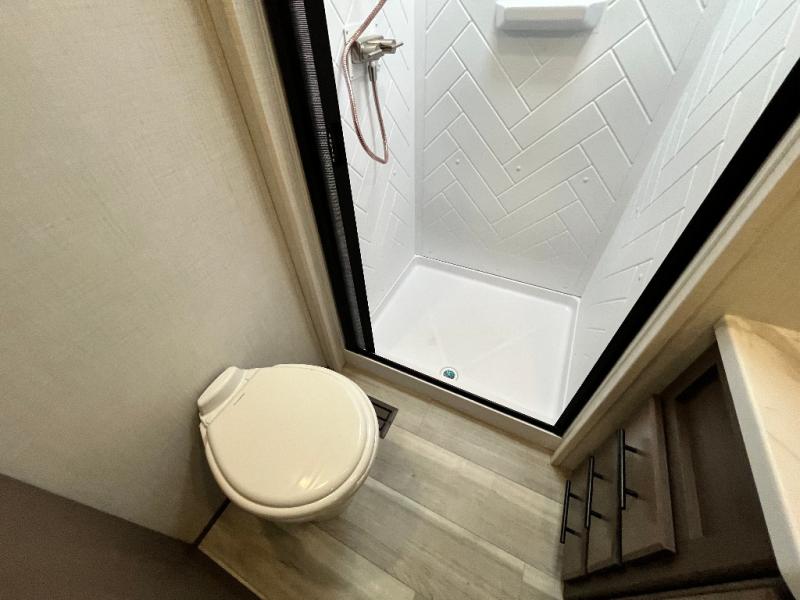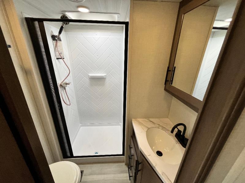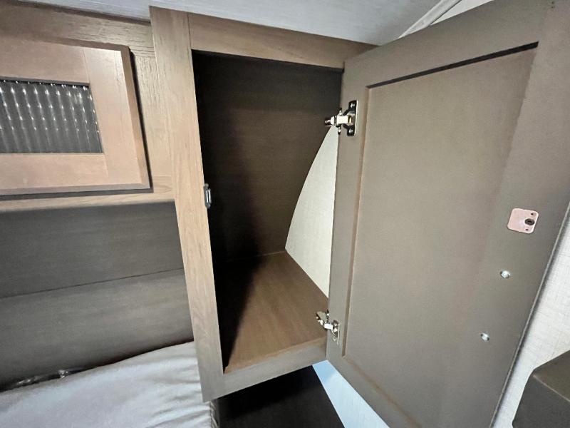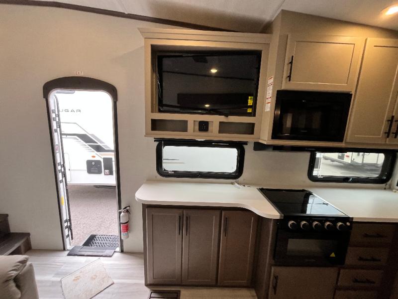 The Cougar Sport structural I-beam frame with stamped steel cross-members and outriggers, plus its AlphaPly roof membrane are what active RVers love about the construction of the Cougar line. The Cougar Sport models are no exception when it comes to a great package, as well as being smaller and lighter weight than their big brother Cougar models. A one-piece, heated and enclosed polypropylene underbelly will add protection against the elements, and the electric stabilizer jacks will provide more stability. On the inside, residential shaker style hardwood cabinet doors and decorative crown molding, plus seamless pressed countertops and an on-demand water heater will make your unit feel even more like home. You are also sure to appreciate the shiplap style decorative accent wall behind the bed, a porcelain foot flush toilet in the bathroom, plus residential kitchen hardware, and so much more.