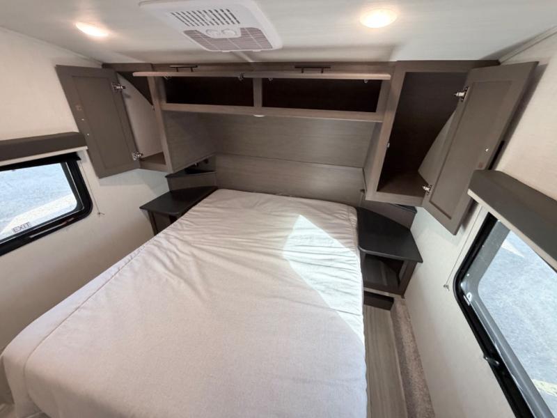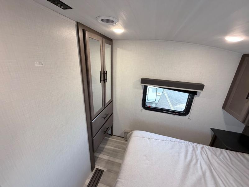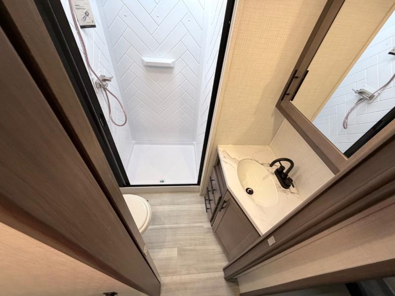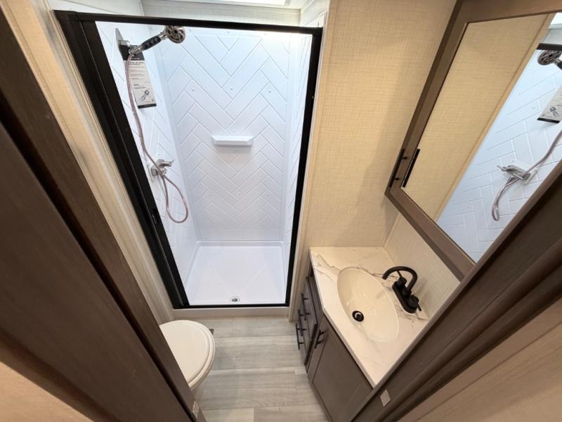 The Cougar Sport structural I-beam frame with stamped steel cross-members and outriggers, plus its AlphaPly roof membrane are what active RVers love about the construction of the Cougar line. The Cougar Sport models are no exception when it comes to a great package, as well as being smaller and lighter weight than their big brother Cougar models. A one-piece, heated and enclosed polypropylene underbelly will add protection against the elements, and the electric stabilizer jacks will provide more stability. On the inside, residential shaker style hardwood cabinet doors and decorative crown molding, plus seamless pressed countertops and an on-demand water heater will make your unit feel even more like home. You are also sure to appreciate the shiplap style decorative accent wall behind the bed, a porcelain foot flush toilet in the bathroom, plus residential kitchen hardware, and so much more.