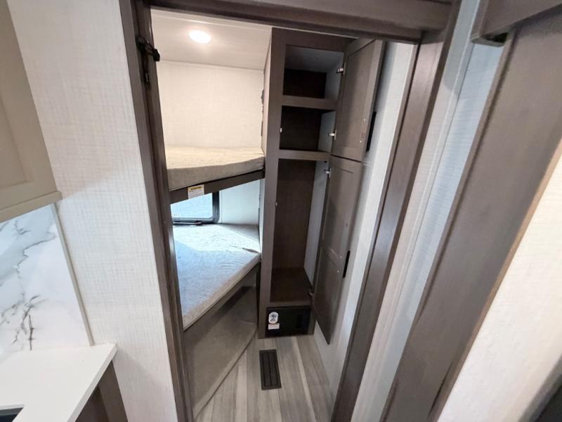 This lightweight Cougar Sport bunk model features sleeping for ten or more with triple stacked bed bunks in the rear bunkhouse, a large U-shaped dinette that can be transformed into sleep space, as well as a tri-fold sofa sleeper and a queen bed in the private bedroom up front. A fully equipped kitchen with an overhead microwave, a three burner range, and large sink plus storage will make it easy to keep everyone fed and happy. A 10.4 Cu. Ft. 12 volt refrigerator will keep all of your perishable items fresh, and there are plenty of cabinets for storing snacks and dry goods as well. Head up the steps to the bathroom featuring a shower with a skylight, sink with an overhead medicine cabinet, and toilet. The private front bedroom takes you away from the hustle and bustle of the main living area and bunkhouse to provide a relaxing retreat including a comfy queen bed, dual nightstands and a wardrobe for clothes!