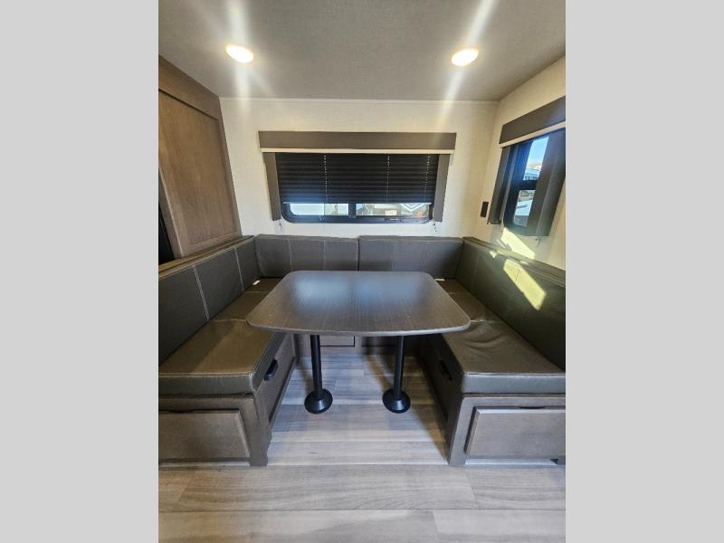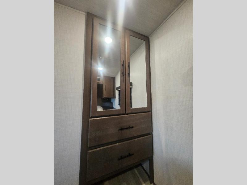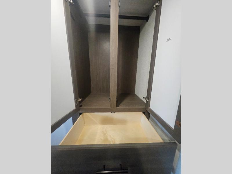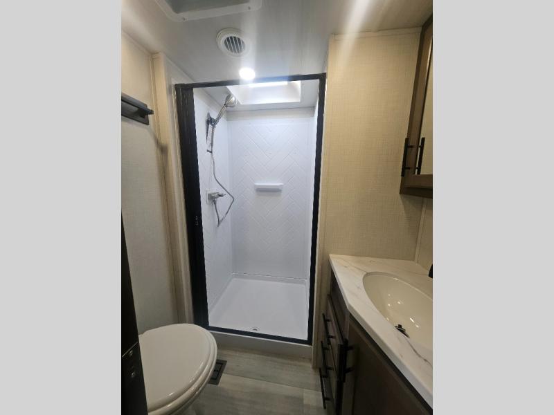 The Cougar Sport structural I-beam frame with stamped steel cross-members and outriggers, plus its AlphaPly roof membrane are what active RVers love about the construction of the Cougar line. The Cougar Sport models are no exception when it comes to a great package, as well as being smaller and lighter weight than their big brother Cougar models. A one-piece, heated and enclosed polypropylene underbelly will add protection against the elements, and the electric stabilizer jacks will provide more stability. On the inside, residential shaker style hardwood cabinet doors and decorative crown molding, plus seamless pressed countertops and an on-demand water heater will make your unit feel even more like home. You are also sure to appreciate the shiplap style decorative accent wall behind the bed, a porcelain foot flush toilet in the bathroom, plus residential kitchen hardware, and so much more.
