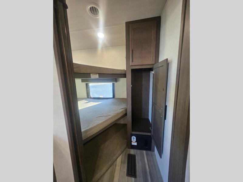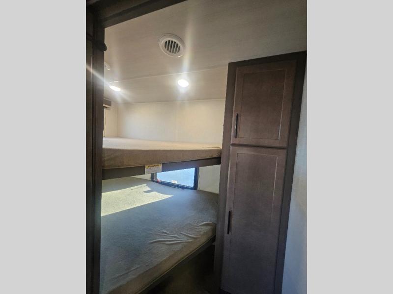 This lightweight Cougar Sport bunk model features sleeping for ten or more with triple stacked bed bunks in the rear bunkhouse, a large U-shaped dinette that can be transformed into sleep space, as well as a tri-fold sofa sleeper and a queen bed in the private bedroom up front. A fully equipped kitchen with an overhead microwave, a three burner range, and large sink plus storage will make it easy to keep everyone fed and happy. A 10.4 Cu. Ft. 12 volt refrigerator will keep all of your perishable items fresh, and there are plenty of cabinets for storing snacks and dry goods as well. Head up the steps to the bathroom featuring a shower with a skylight, sink with an overhead medicine cabinet, and toilet. The private front bedroom takes you away from the hustle and bustle of the main living area and bunkhouse to provide a relaxing retreat including a comfy queen bed, dual nightstands and a wardrobe for clothes!