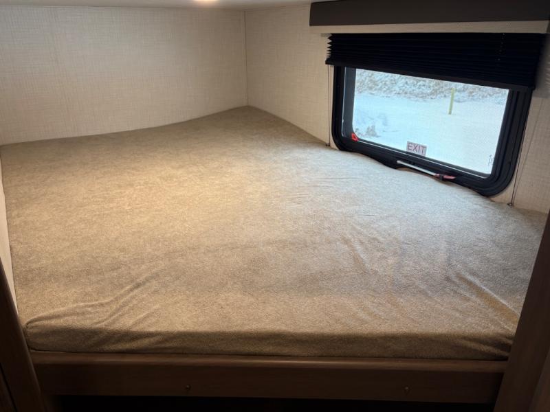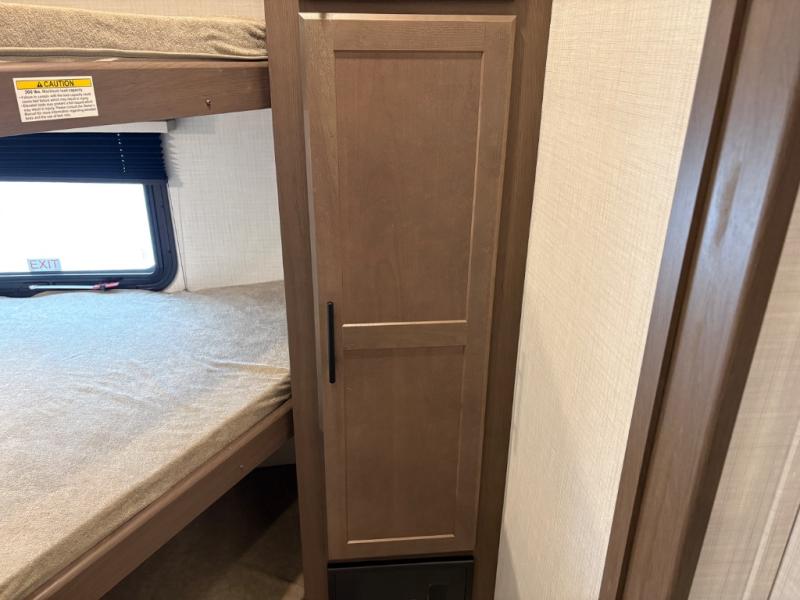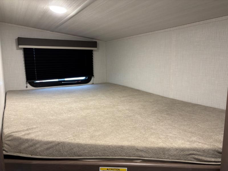 This lightweight Cougar Sport bunk model features sleeping for ten or more with triple stacked bed bunks in the rear bunkhouse, a large U-shaped dinette that can be transformed into sleep space, as well as a tri-fold sofa sleeper and a queen bed in the private bedroom up front. A fully equipped kitchen with an overhead microwave, a three burner range, and large sink plus storage will make it easy to keep everyone fed and happy. A 10.4 Cu. Ft. 12 volt refrigerator will keep all of your perishable items fresh, and there are plenty of cabinets for storing snacks and dry goods as well. Head up the steps to the bathroom featuring a shower with a skylight, sink with an overhead medicine cabinet, and toilet. The private front bedroom takes you away from the hustle and bustle of the main living area and bunkhouse to provide a relaxing retreat including a comfy queen bed, dual nightstands and a wardrobe for clothes!