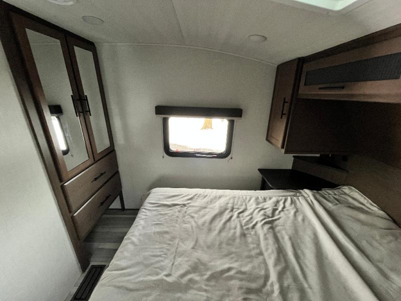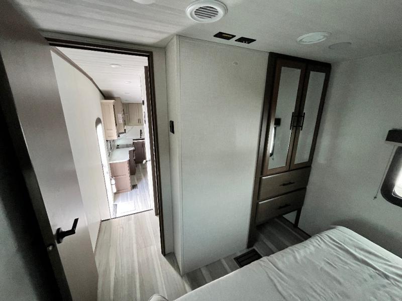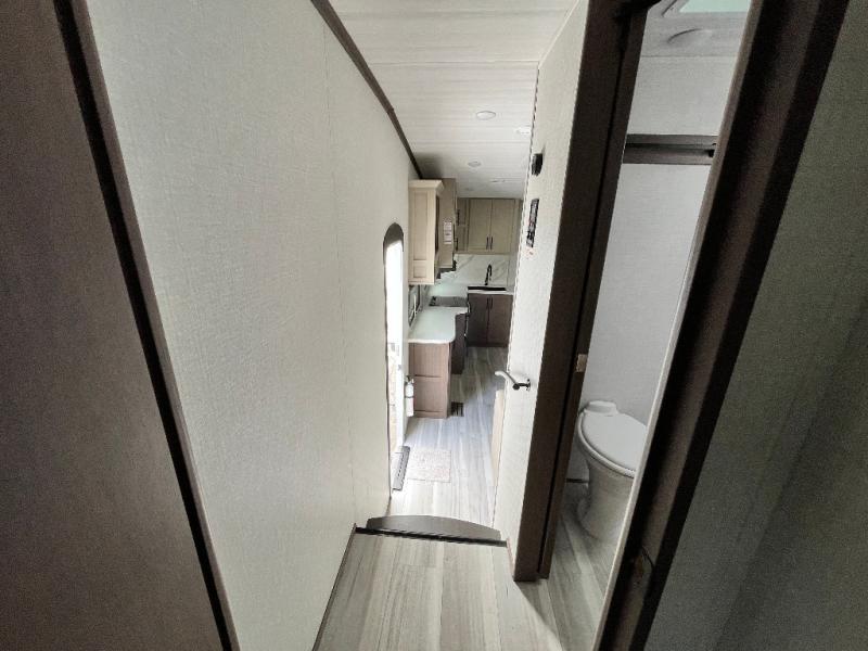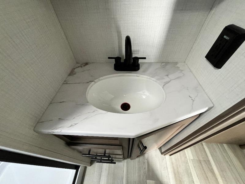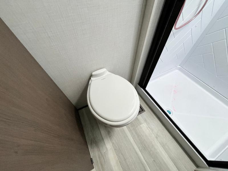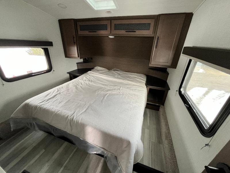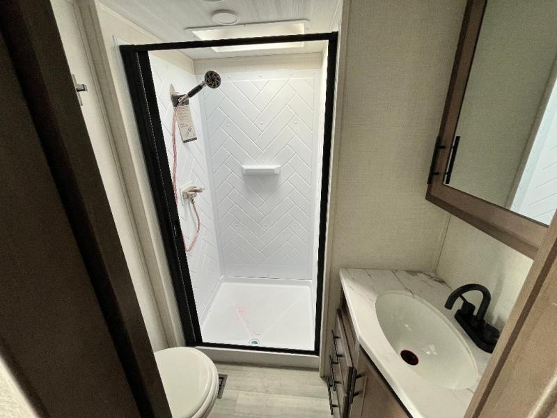 The Cougar Sport structural I-beam frame with stamped steel cross-members and outriggers, plus its AlphaPly roof membrane are what active RVers love about the construction of the Cougar line. The Cougar Sport models are no exception when it comes to a great package, as well as being smaller and lighter weight than their big brother Cougar models. A one-piece, heated and enclosed polypropylene underbelly will add protection against the elements, and the electric stabilizer jacks will provide more stability. On the inside, residential shaker style hardwood cabinet doors and decorative crown molding, plus seamless pressed countertops and an on-demand water heater will make your unit feel even more like home. You are also sure to appreciate the shiplap style decorative accent wall behind the bed, a porcelain foot flush toilet in the bathroom, plus residential kitchen hardware, and so much more.