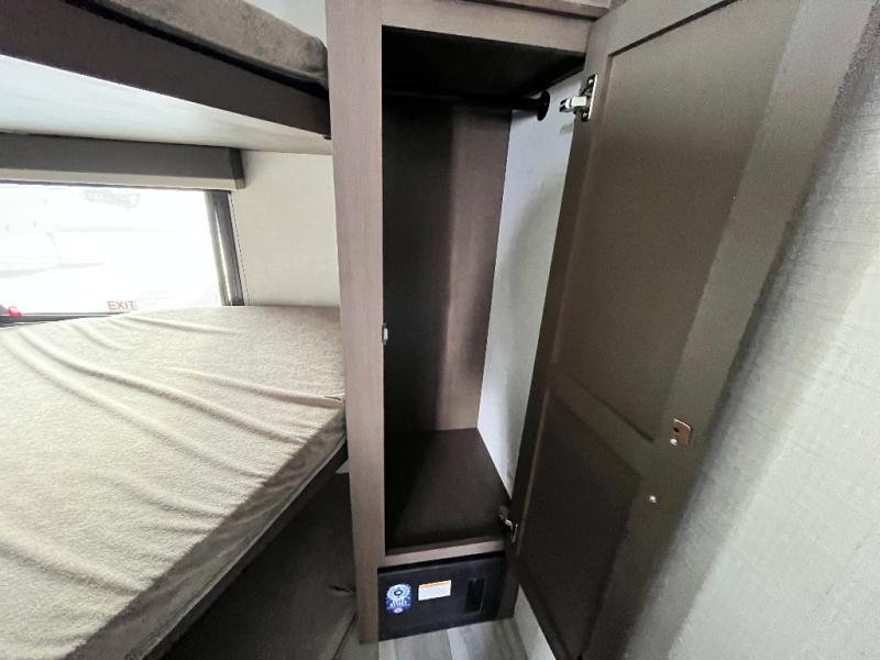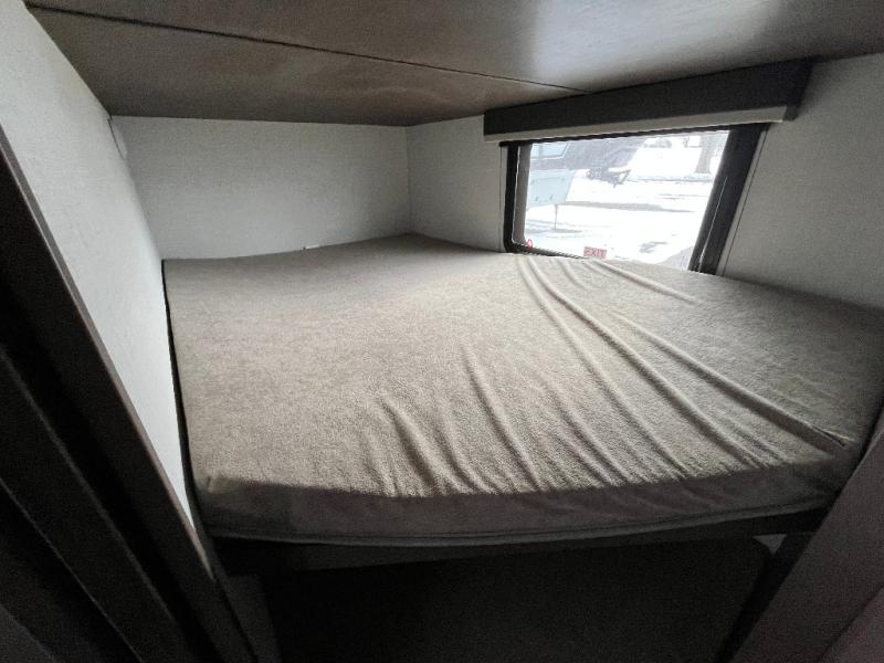 This lightweight Cougar Sport bunk model features sleeping for ten or more with triple stacked bed bunks in the rear bunkhouse, a large U-shaped dinette that can be transformed into sleep space, as well as a tri-fold sofa sleeper and a queen bed in the private bedroom up front. A fully equipped kitchen with an overhead microwave, a three burner range, and large sink plus storage will make it easy to keep everyone fed and happy. A 10.4 Cu. Ft. 12 volt refrigerator will keep all of your perishable items fresh, and there are plenty of cabinets for storing snacks and dry goods as well. Head up the steps to the bathroom featuring a shower with a skylight, sink with an overhead medicine cabinet, and toilet. The private front bedroom takes you away from the hustle and bustle of the main living area and bunkhouse to provide a relaxing retreat including a comfy queen bed, dual nightstands and a wardrobe for clothes!