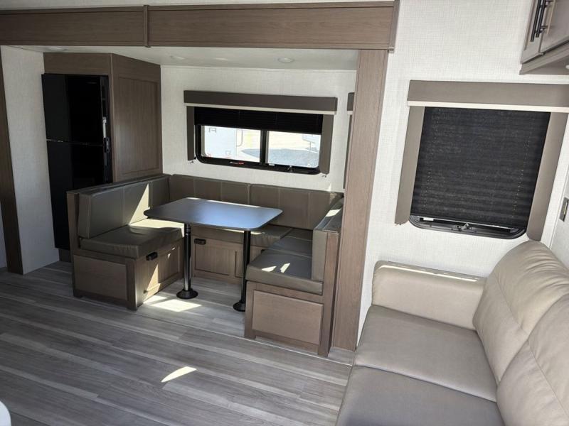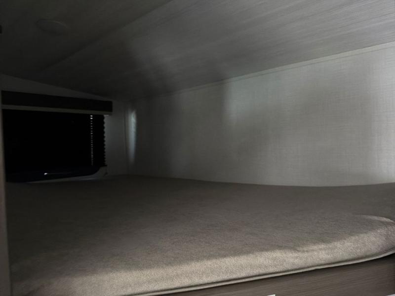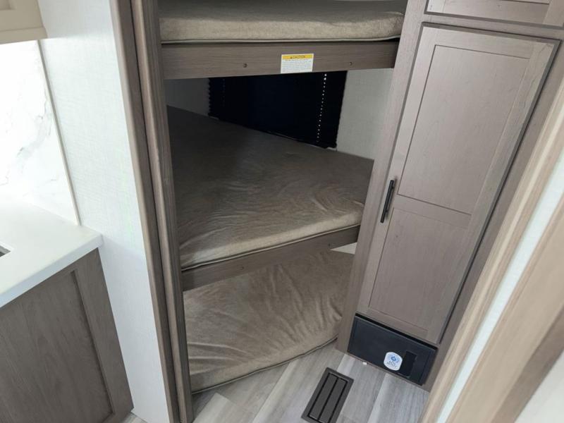 This lightweight Cougar Sport bunk model features sleeping for ten or more with triple stacked bed bunks in the rear bunkhouse, a large U-shaped dinette that can be transformed into sleep space, as well as a tri-fold sofa sleeper and a queen bed in the private bedroom up front. A fully equipped kitchen with an overhead microwave, a three burner range, and large sink plus storage will make it easy to keep everyone fed and happy. A 10.4 Cu. Ft. 12 volt refrigerator will keep all of your perishable items fresh, and there are plenty of cabinets for storing snacks and dry goods as well. Head up the steps to the bathroom featuring a shower with a skylight, sink with an overhead medicine cabinet, and toilet. The private front bedroom takes you away from the hustle and bustle of the main living area and bunkhouse to provide a relaxing retreat including a comfy queen bed, dual nightstands and a wardrobe for clothes!