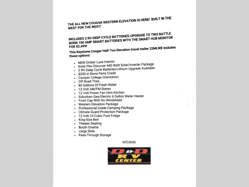 This Keystone Cougar Western Elevation travel trailer 22MLWE includes these options: