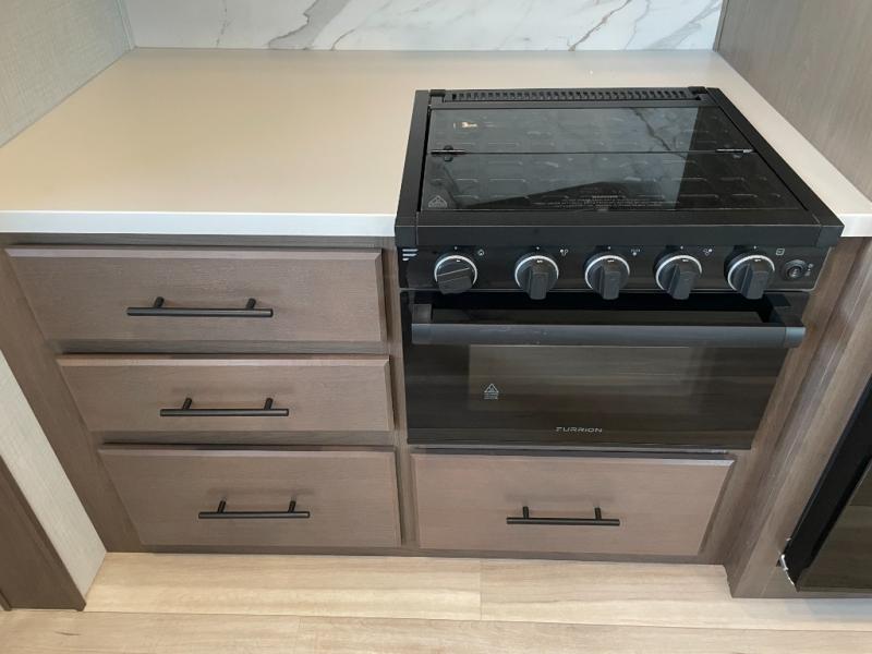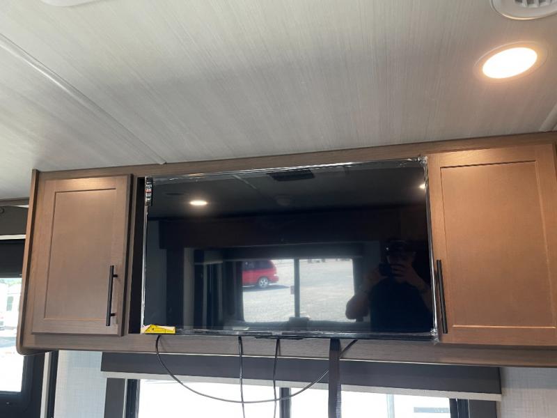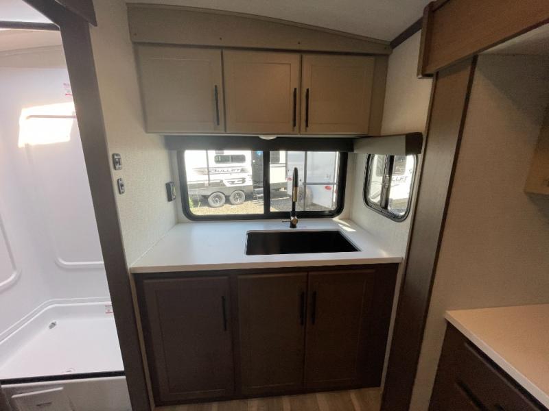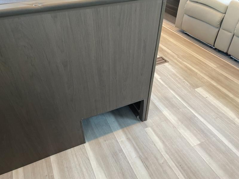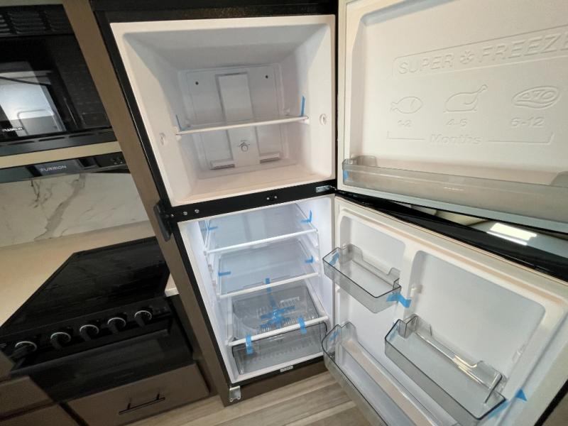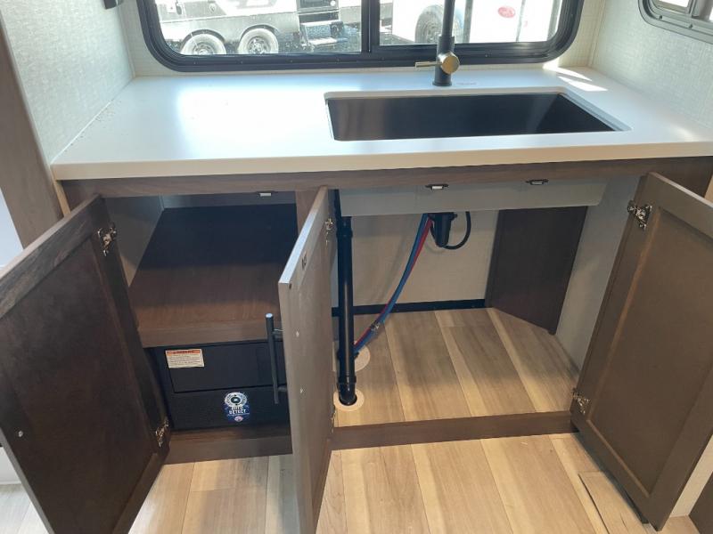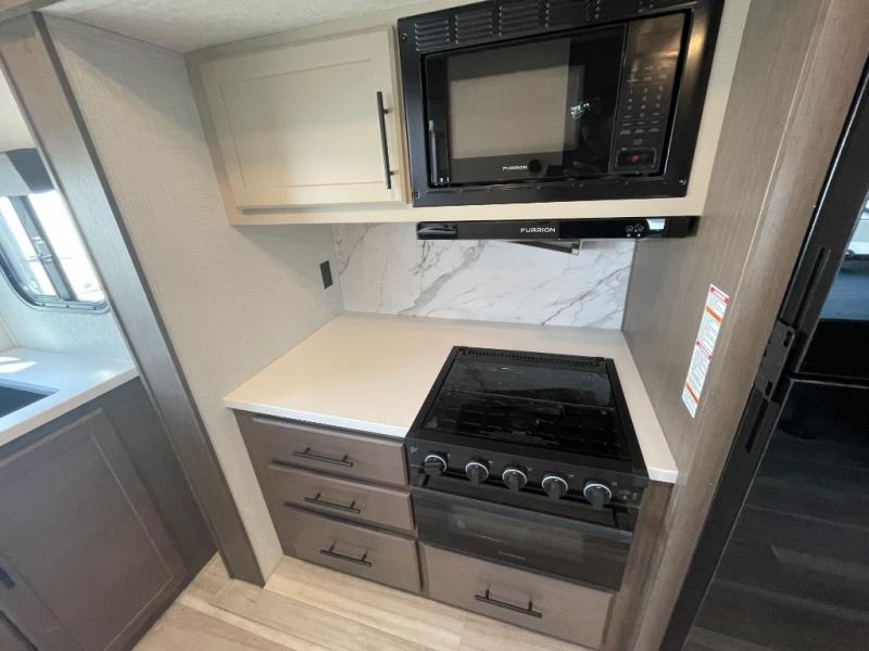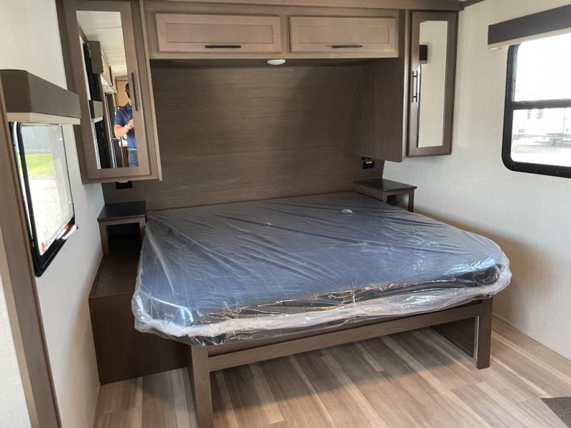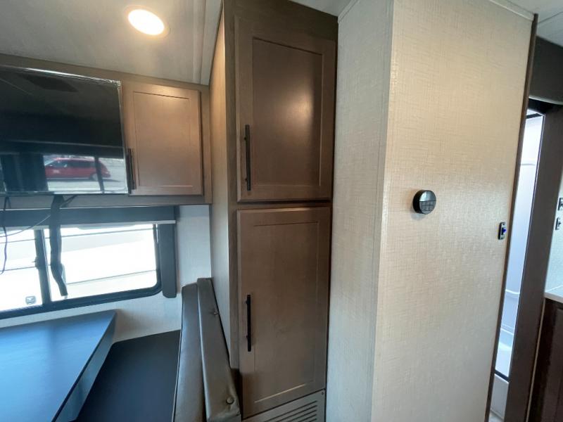 Camping trips just got better in this spacious travel trailer! The front walk-around king bed is sure to bring a great night's rest, and there are dual nightstands to keep your things tidy. A large slide out houses the three-burner range and 12V refrigerator so you can cook and store food, plus there is theater seating for ultimate relaxation. The rear of this unit is shared with the kitchen sink and countertop, plus the full bath, allowing you to easily clean up each day. Outside, you'll find an 18' electric awning with LED lighting, a rear 2" accessory hitch, plus a universal docking station for added convenience.