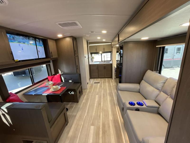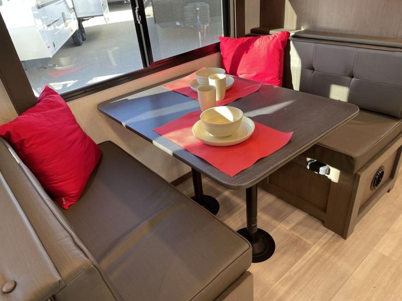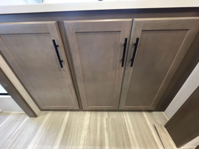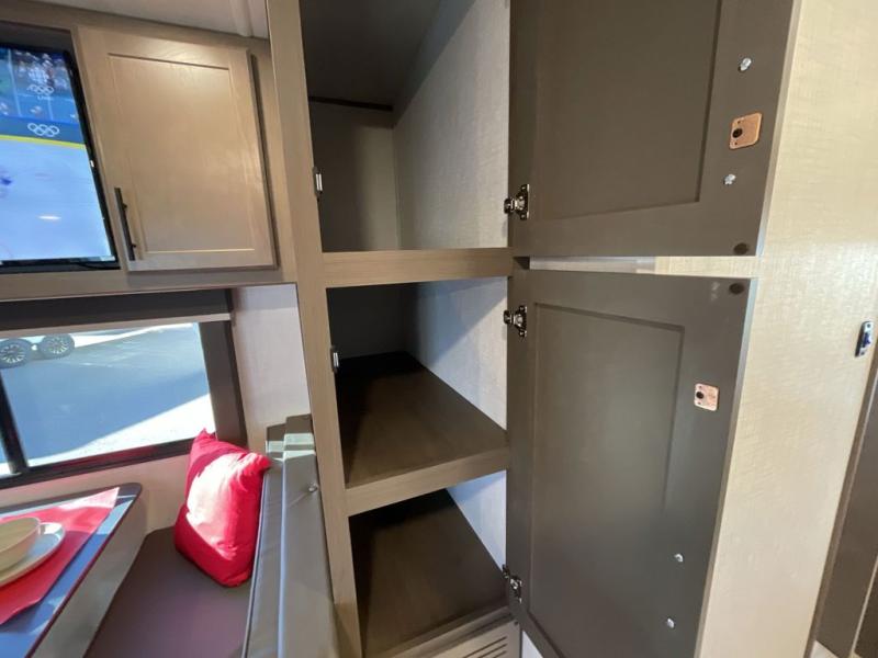 With a king-size bed, this Cougar Half-Ton travel trailer shows that you can still be comfortable even while you're away from home! The bed has drawers and nightstands on either side to keep your belongings tidy. Right next to the booth dinette is the pantry, and next to the pantry is the full bathroom which is certainly one of the most valuable features to any trailer.