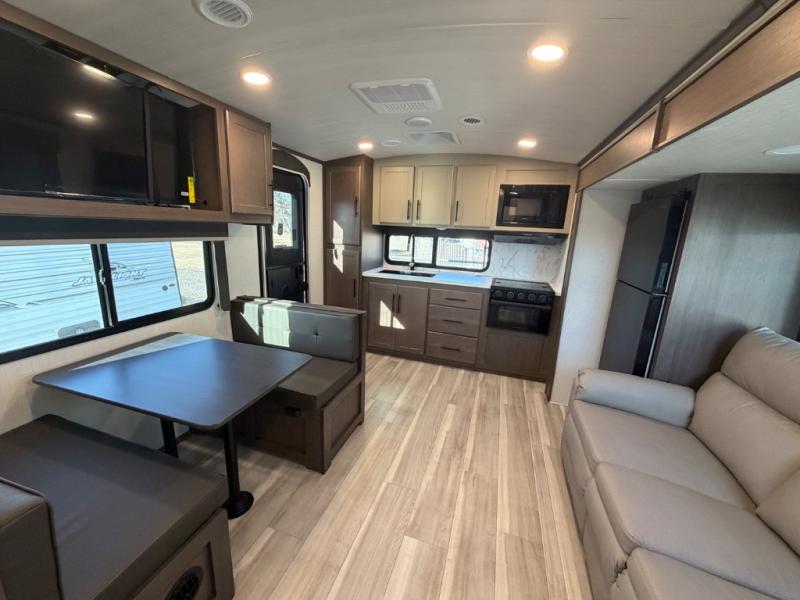 This dual entry travel trailer will let you enter in through the rear kitchen or the front master bedroom for convenience! The bedroom includes a walk-around king bed, dual nightstands, plus your own private entrance into the walk-thru bath. Once you've made your way to the rear kitchen, you can make dinner on the three-burner range, then dine with family at the booth dinette. There is also a tri-fold sleeper sofa within a slide out that will provide extra floor space and sleeping space!