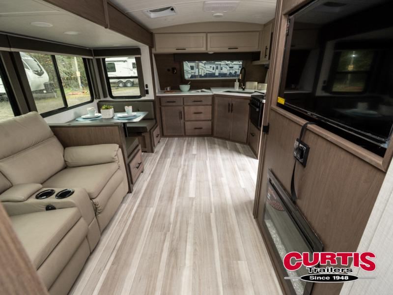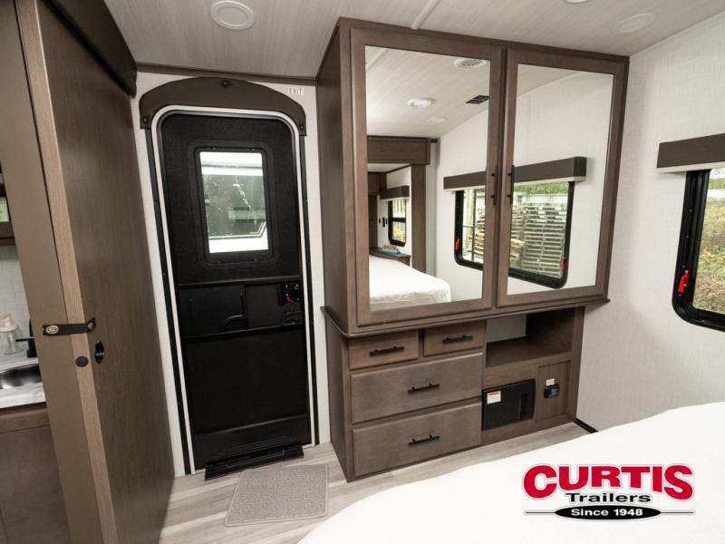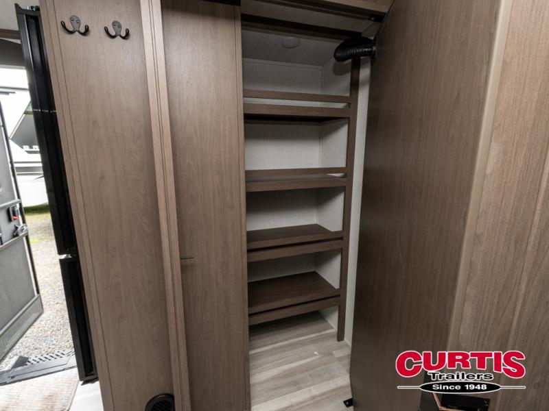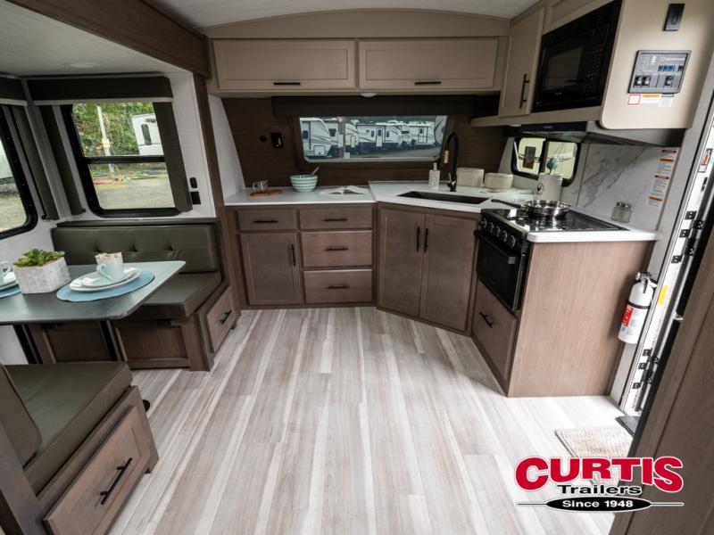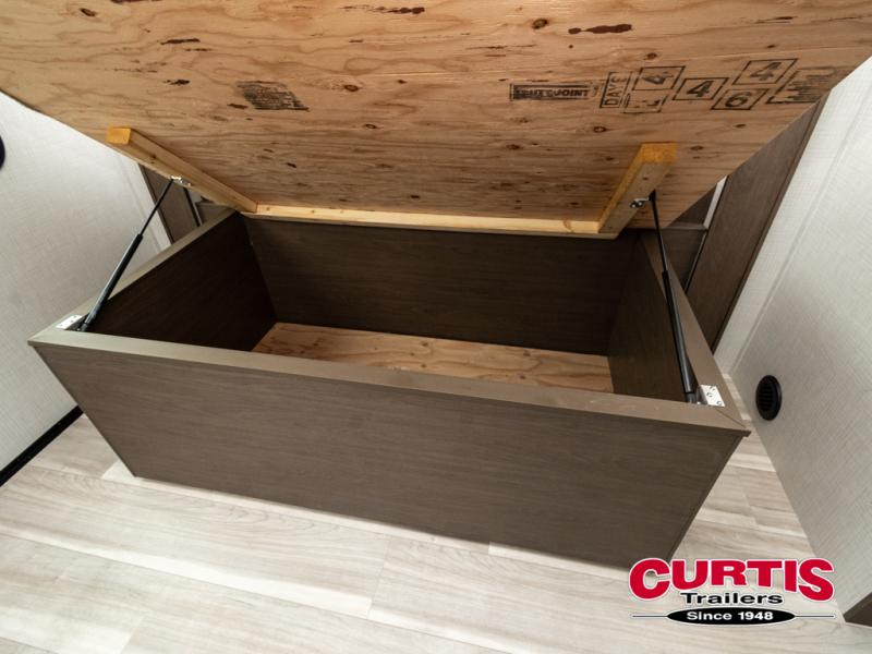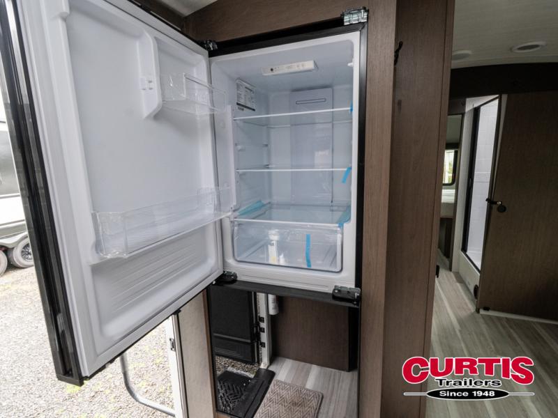 With a queen-size bed and a king bed option, this travel trailer shows that you can still be comfortable even while you're away from home! The bed slides out to provide more floor space and there is a wardrobe and dresser opposite near the private entry door. The main entry up front leads into a spacious combined kitchen and living area with the front kitchen offering plenty of counter space and overhead storage. There is a 12-volt refrigerator to the left of the entry door, and access to a walk-in pantry is right around the corner from the pivoting entertainment center opposite a tri-fold sofa sleeper and booth dinette slide. This unit also features a full-width walk-thru bath giving you plenty of room to shower and change.