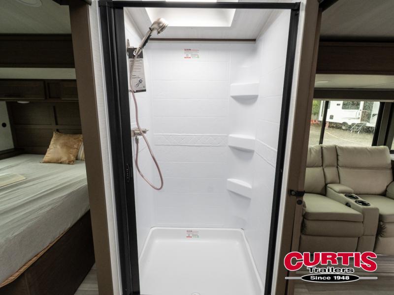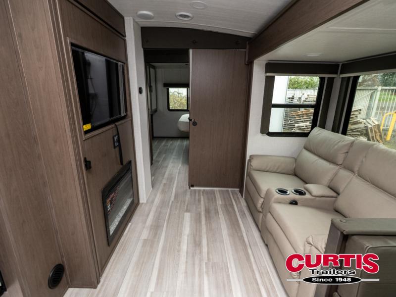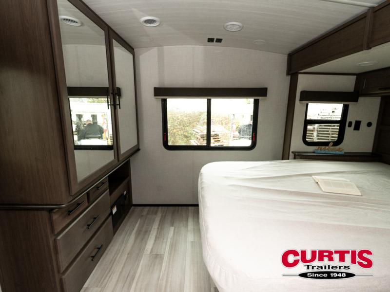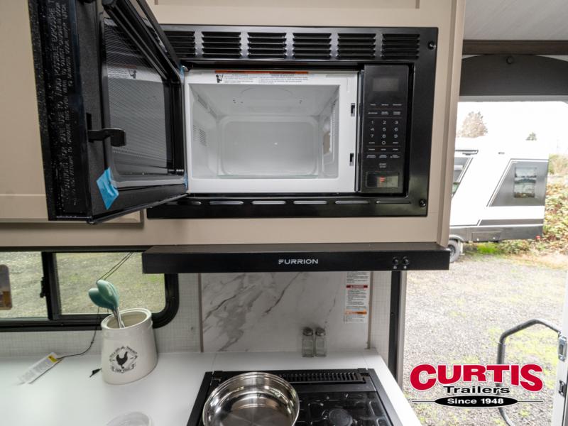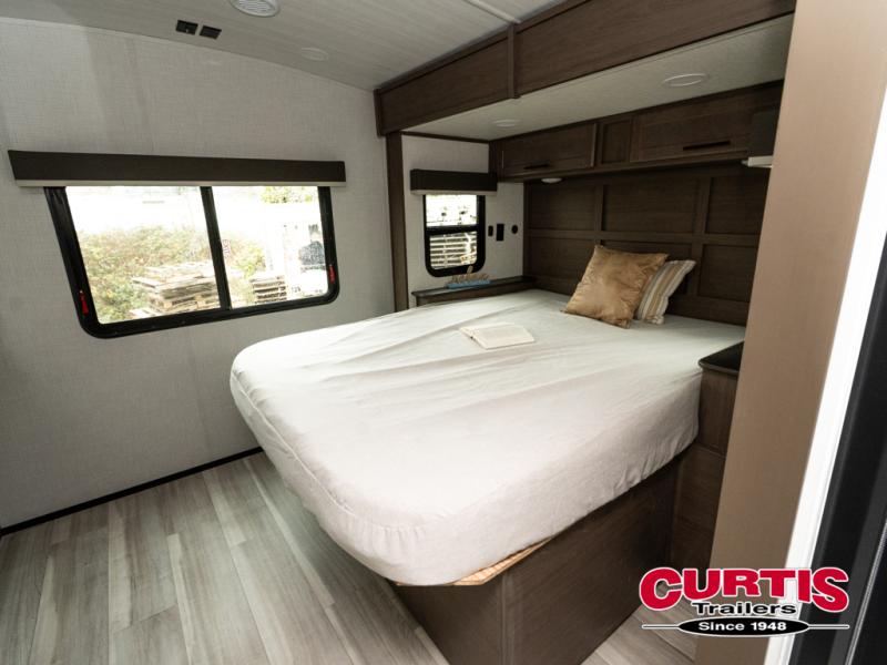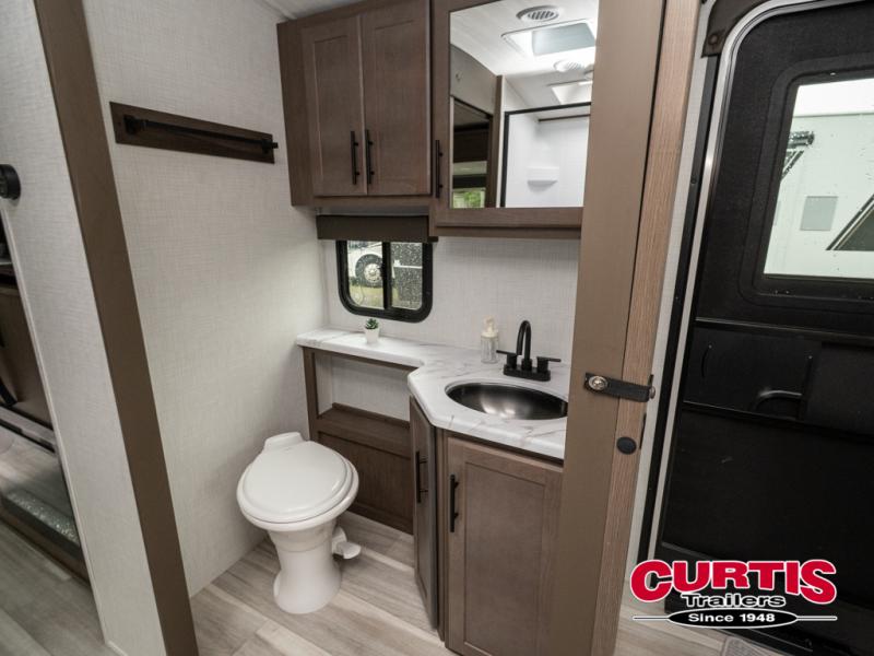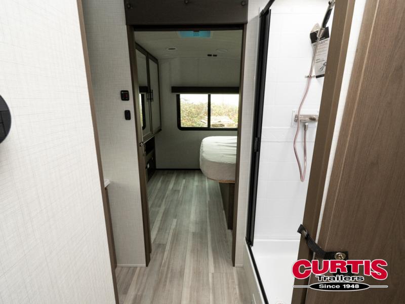 With a queen-size bed and a king bed option, this travel trailer shows that you can still be comfortable even while you're away from home! The bed slides out to provide more floor space and there is a wardrobe and dresser opposite near the private entry door. The main entry up front leads into a spacious combined kitchen and living area with the front kitchen offering plenty of counter space and overhead storage. There is a 12-volt refrigerator to the left of the entry door, and access to a walk-in pantry is right around the corner from the pivoting entertainment center opposite a tri-fold sofa sleeper and booth dinette slide. This unit also features a full-width walk-thru bath giving you plenty of room to shower and change.