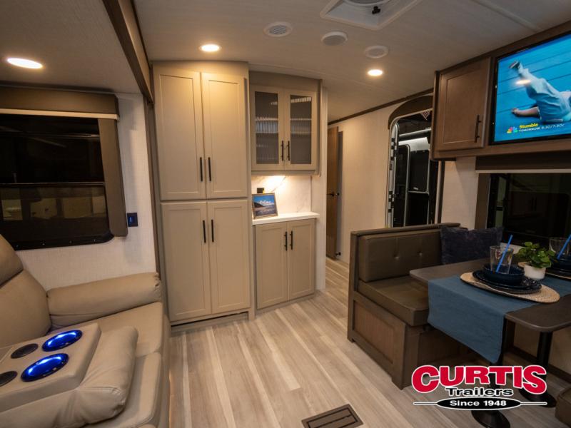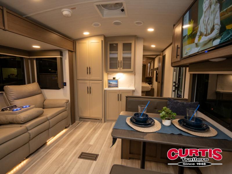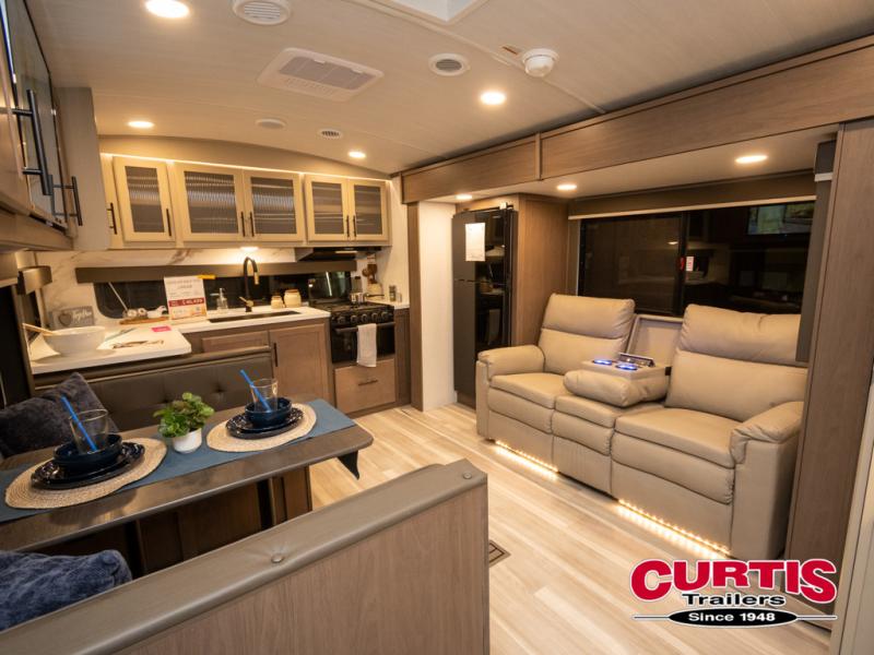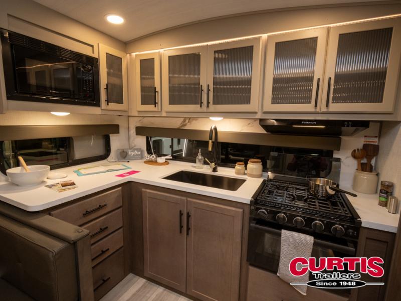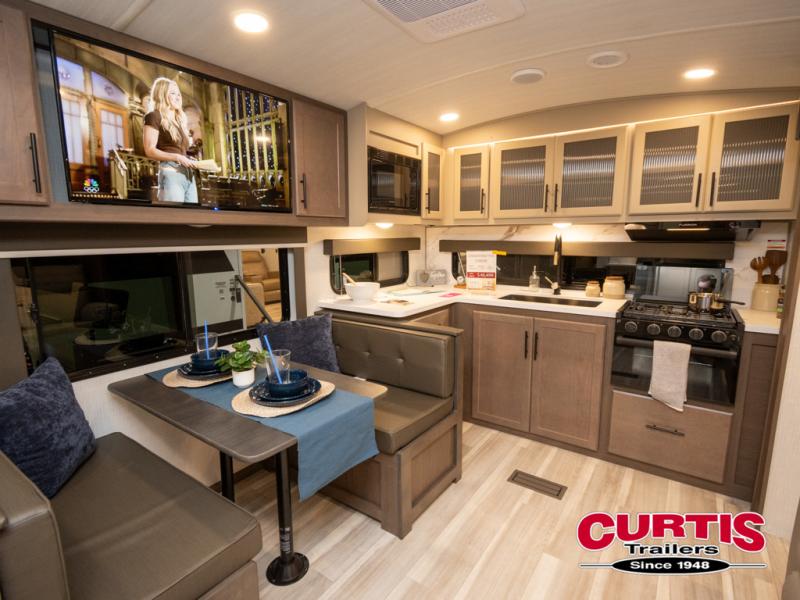 You'll love camping in this travel trailer with a front private bedroom and a walk-around king bed, giving you your own space each night. And there is still room for guests to stay over on the tri-fold sleeper sofa and the booth dinette! The three-burner range and microwave oven in the rear kitchen will let you make meals each day, and there is ample counter space to set out drinks. This unit also includes an outdoor kitchen prep area that will come handy when you're grilling outdoors and need a convenient workspace!