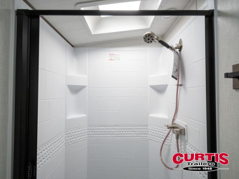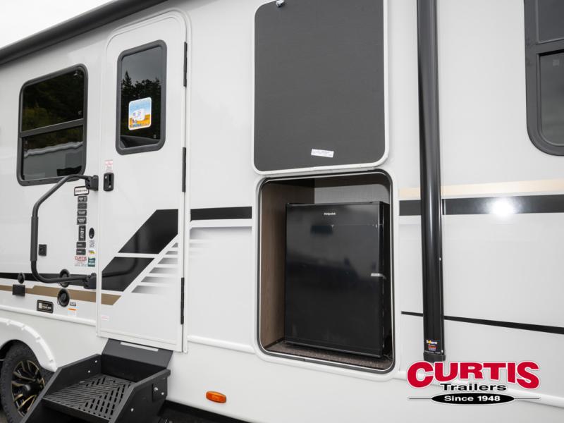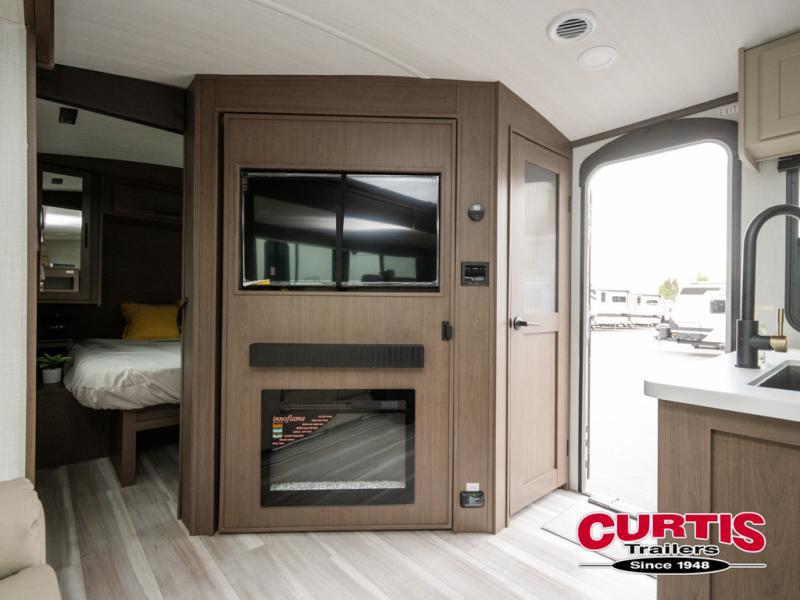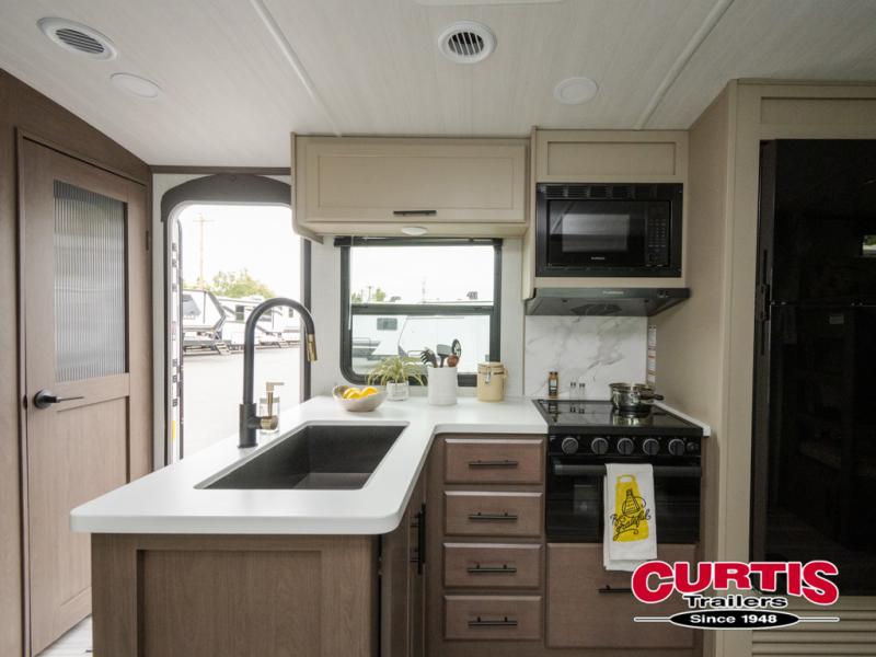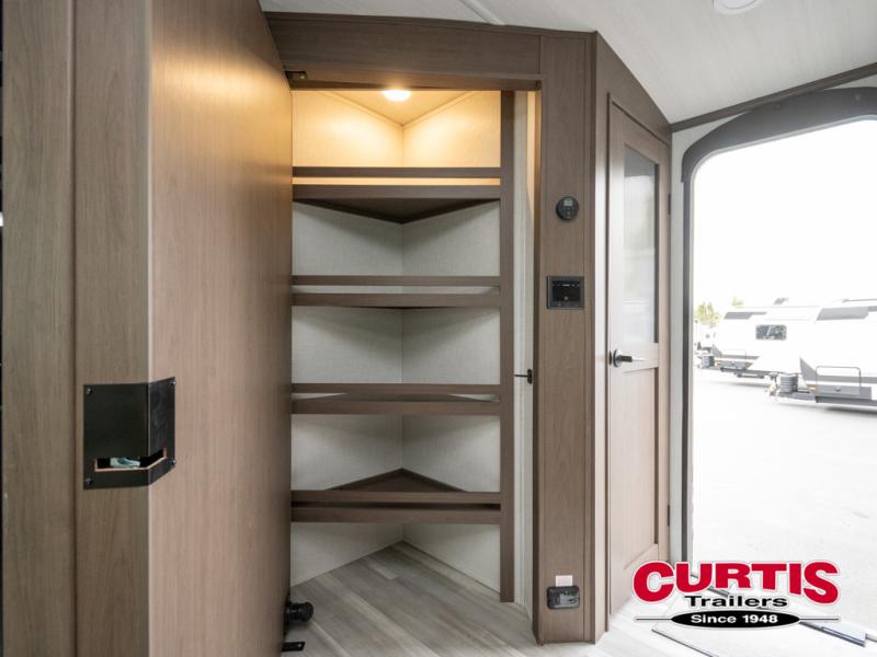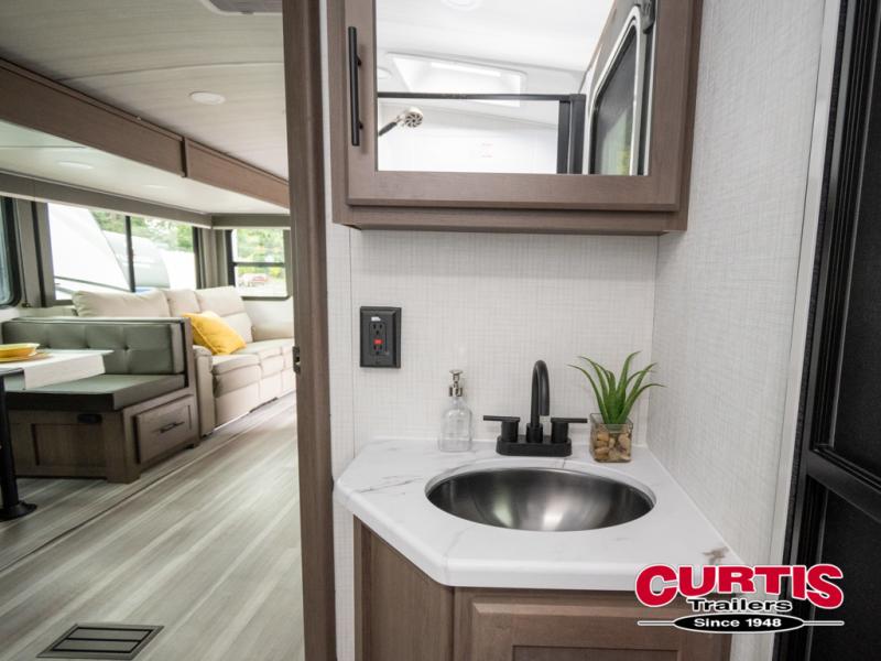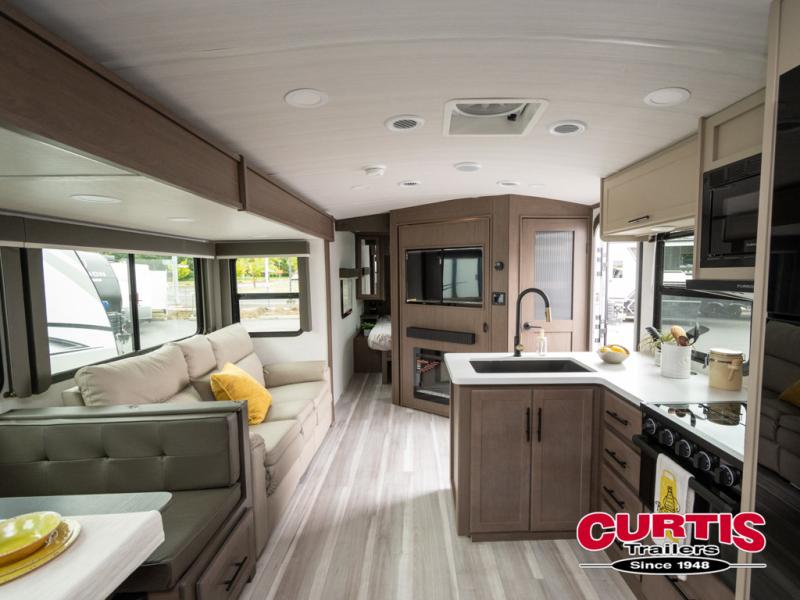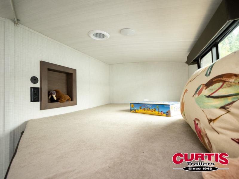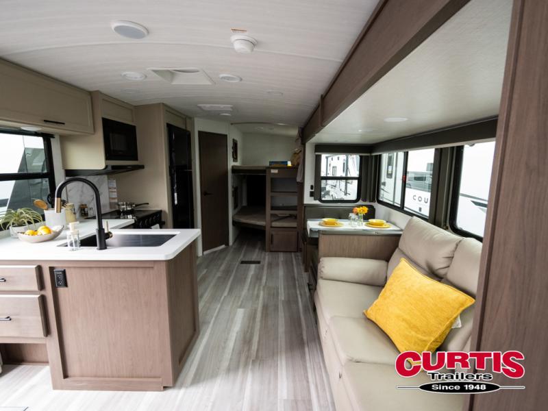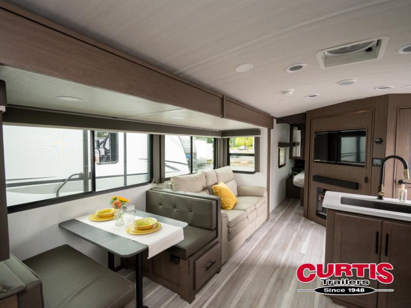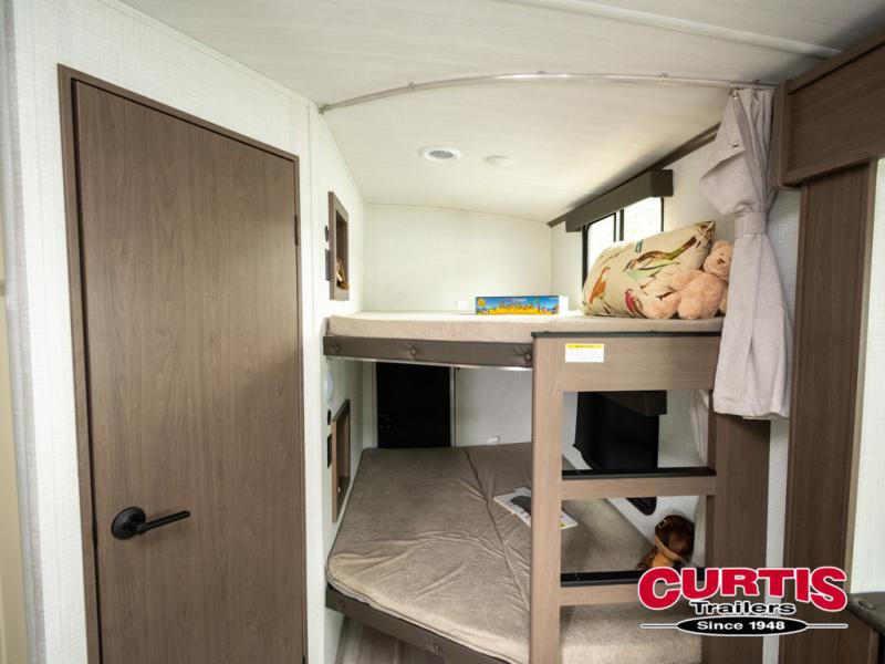 With dual entry doors in this travel trailer, you can enter in through the main living area or the full bath for convenience! Once inside, the sleeper sofa and booth dinette provide places to relax, eat, and play games, plus there is an entertainment center with hidden storage behind to keep movies organized. A full kitchen with a three-burner cooktop and 12V refrigerator will allow you to cook and store food, or you can head outdoors to utilize the outdoor kitchen prep area. There is also drop-frame storage outside for fishing poles and hiking gear, and the 21' electric awning provides shade as you relax. When it's time to call it a night, the king bed in the front private bedroom is sure to bring comfort, while the little ones take the double-size bunks, and any other guests can sleep on the living room furniture!