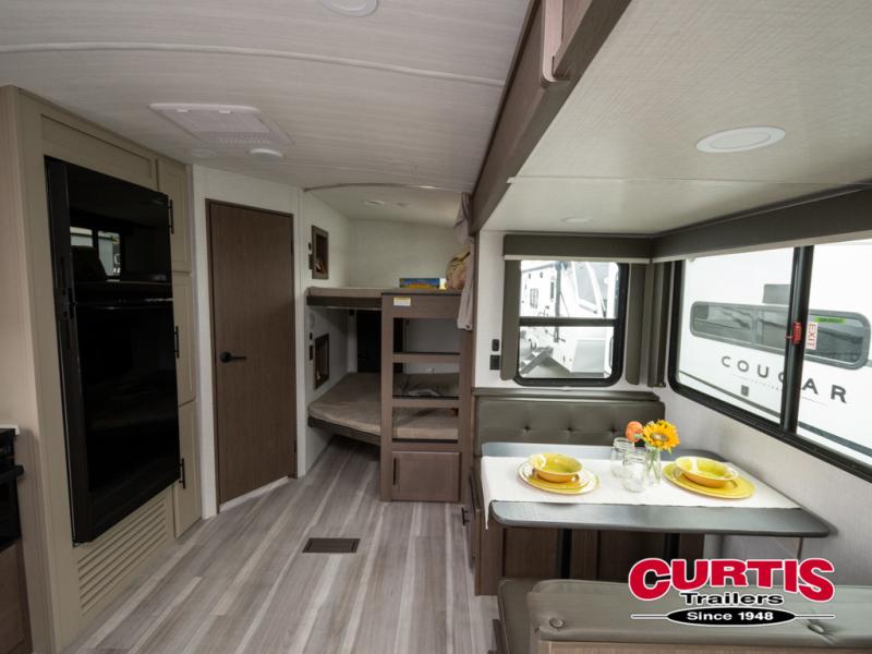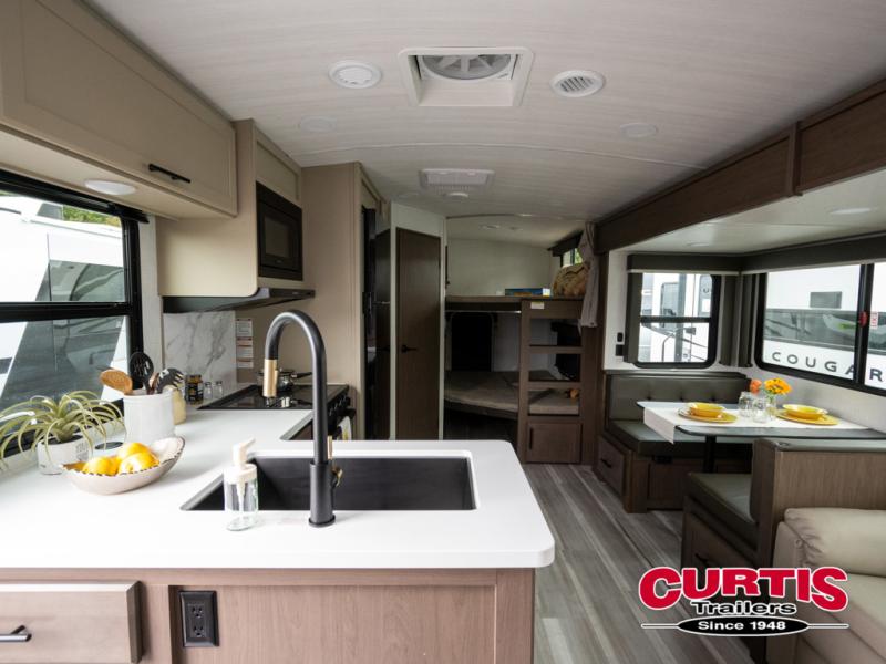 With any Cougar Western Elevation travel trailer by Keystone, you will find off-grid ready features and interior comforts to make each adventure count! Each unit is built with an automotive grade painted high-impact front cap with KeyShield protection, an AlphaPly roof membrane, and a one-piece polypropylene underbelly for added durability. There is also a high-performance Road Armor shock absorbing equalizer and Lippert axles for smoother towing. You will also appreciate the slam-latch baggage doors outside, along with a Key-Alike lock system, dual 30 lb. LP tanks and the industry's best 80-gallon fresh water capacity. The hardwood cabinet doors, seamless pressed countertops, and Oxygenics shower head will add to your comfort, and you'll find plenty of storage both inside and out for all your personal belongings, camp gear and more!
