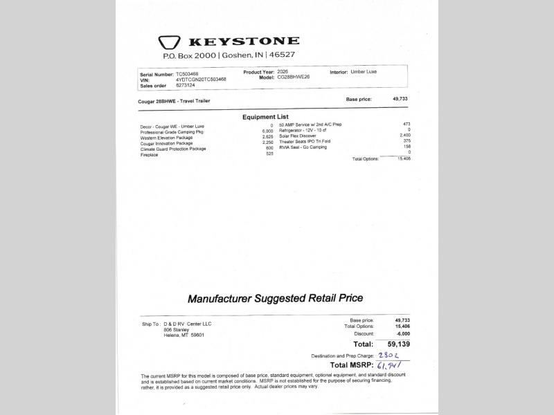 This Keystone Cougar Western Elevation travel trailer 28BHWE includes these options: