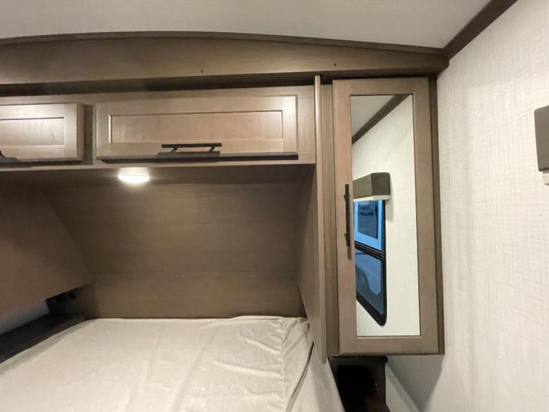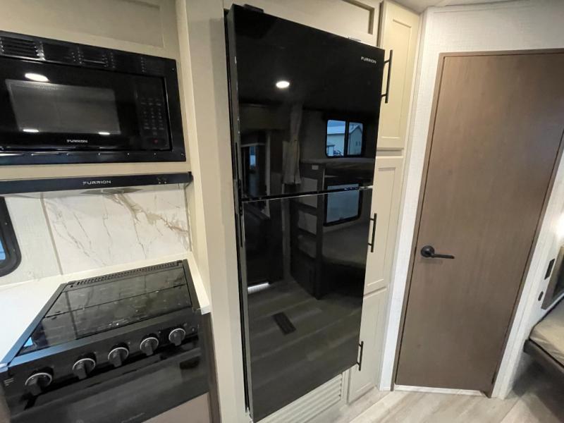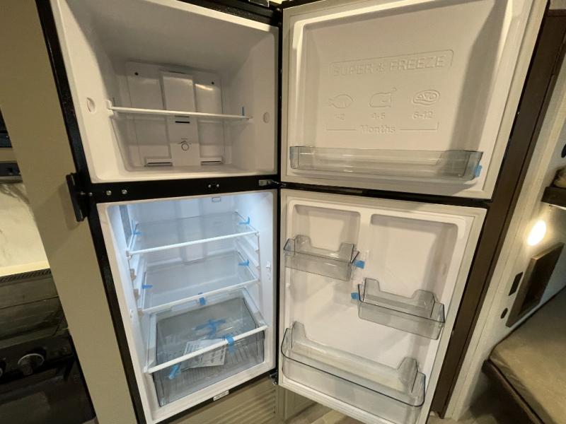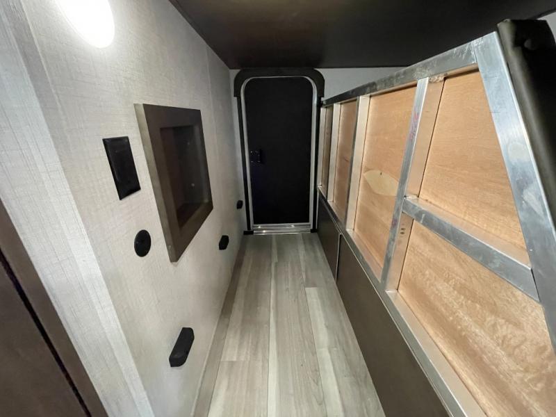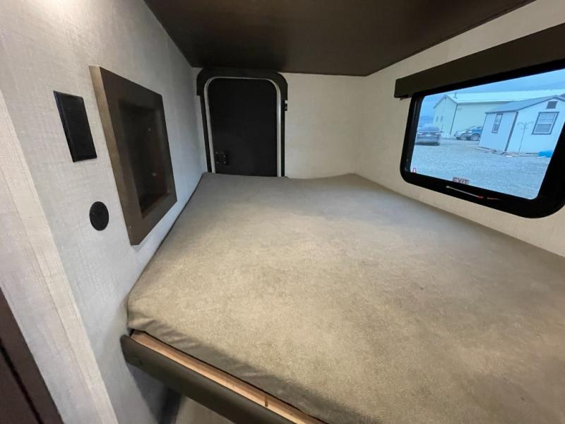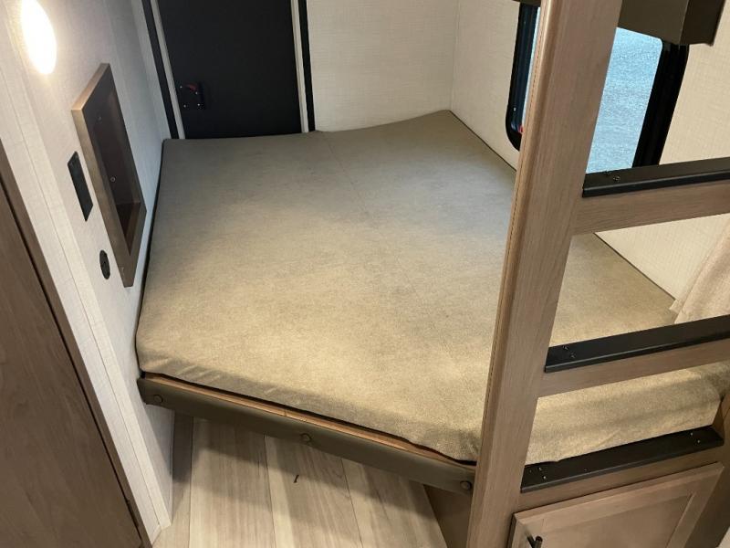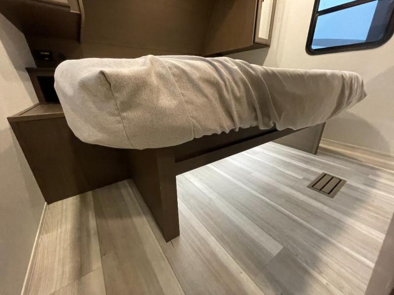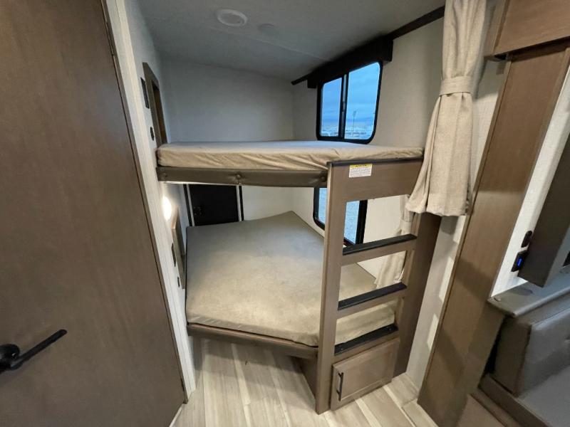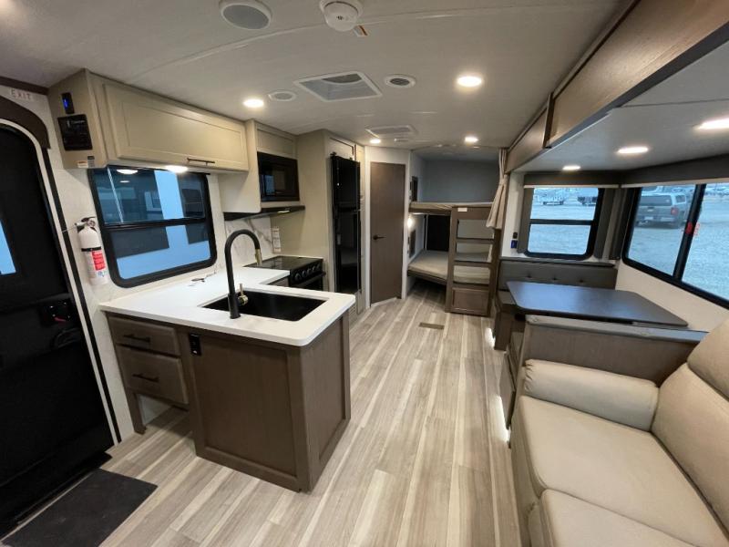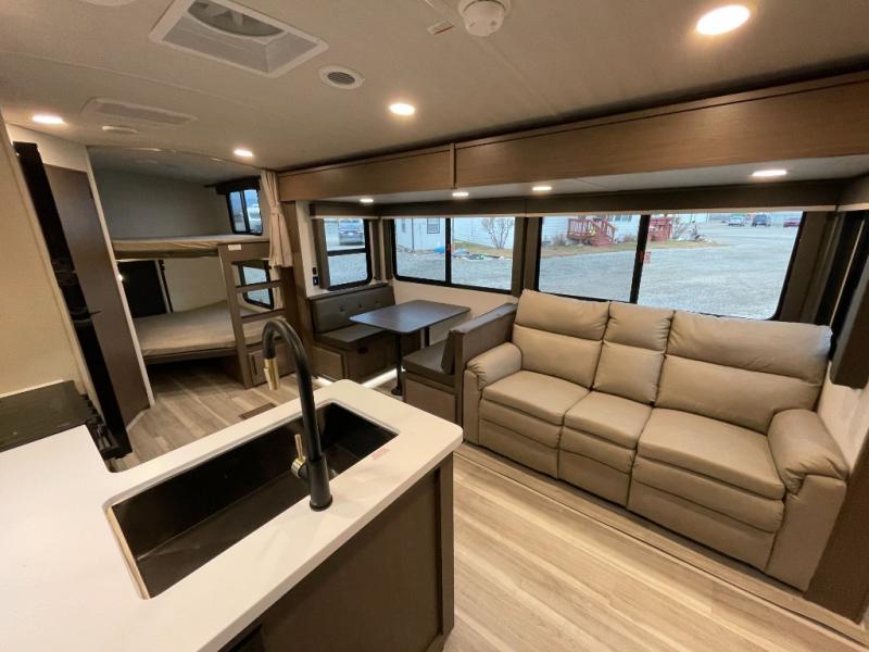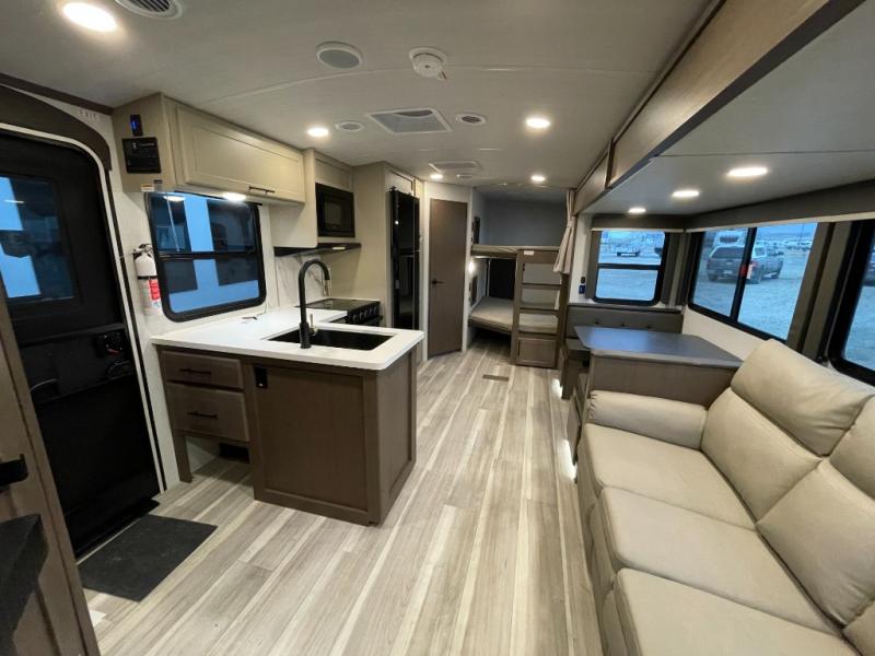 With dual entry doors in this travel trailer, you can enter in through the main living area or the full bath for convenience! Once inside, the sleeper sofa and booth dinette provide places to relax, eat, and play games, plus there is an entertainment center with hidden storage behind to keep movies organized. A full kitchen with a three-burner cooktop and 12V refrigerator will allow you to cook and store food, or you can head outdoors to utilize the outdoor kitchen prep area. There is also drop-frame storage outside for fishing poles and hiking gear, and the 21' electric awning provides shade as you relax. When it's time to call it a night, the king bed in the front private bedroom is sure to bring comfort, while the little ones take the double-size bunks, and any other guests can sleep on the living room furniture!