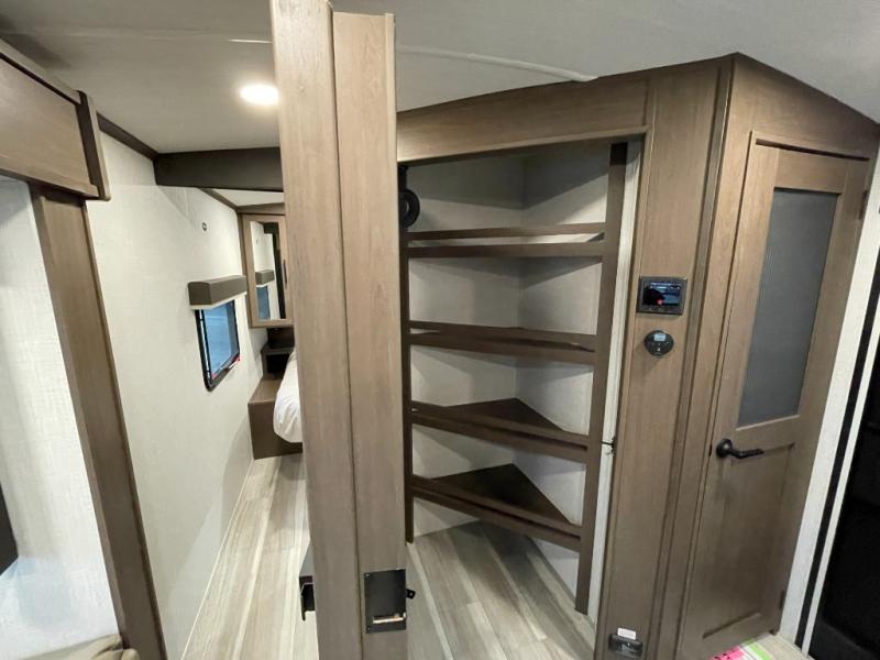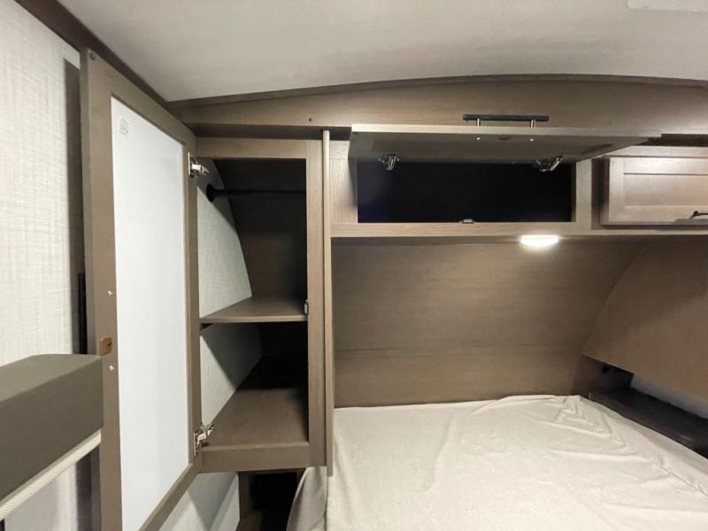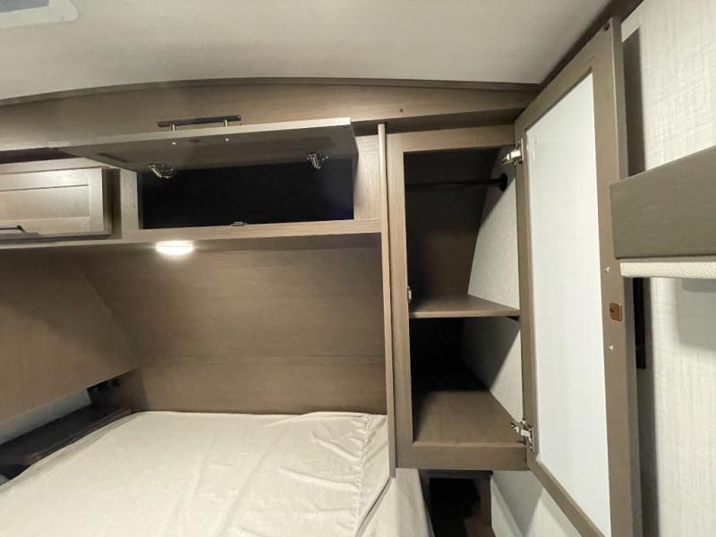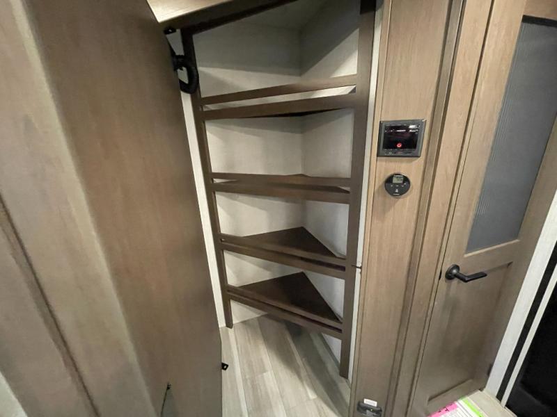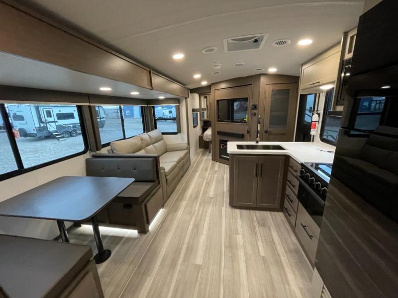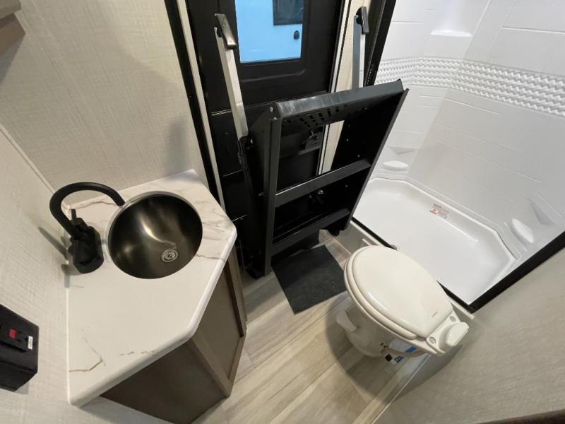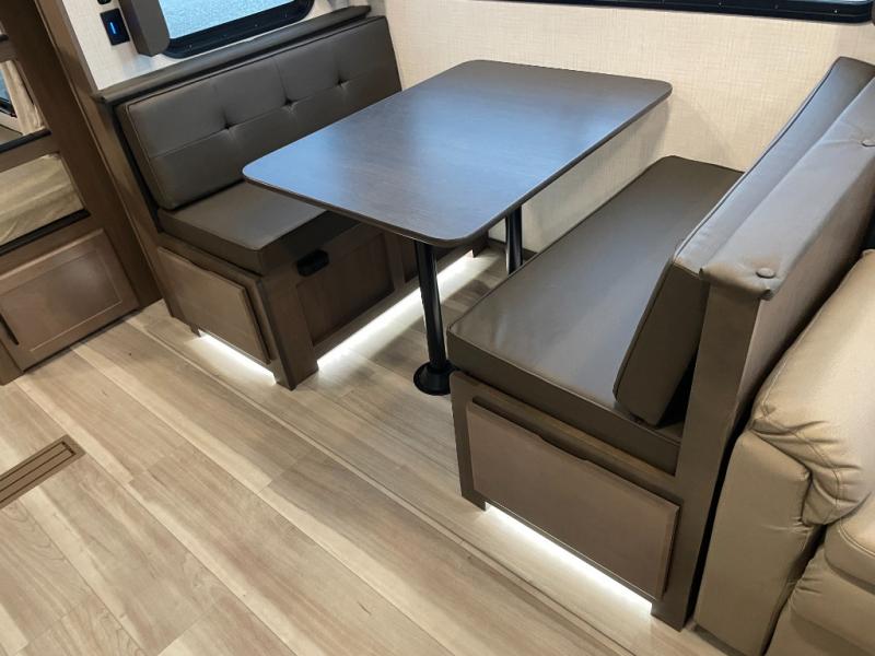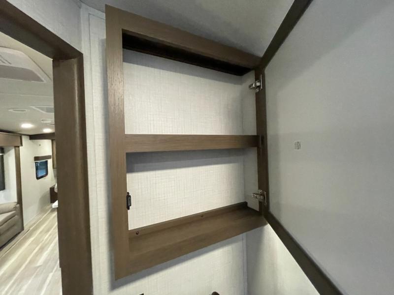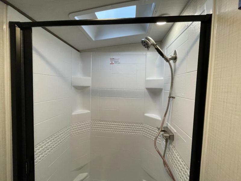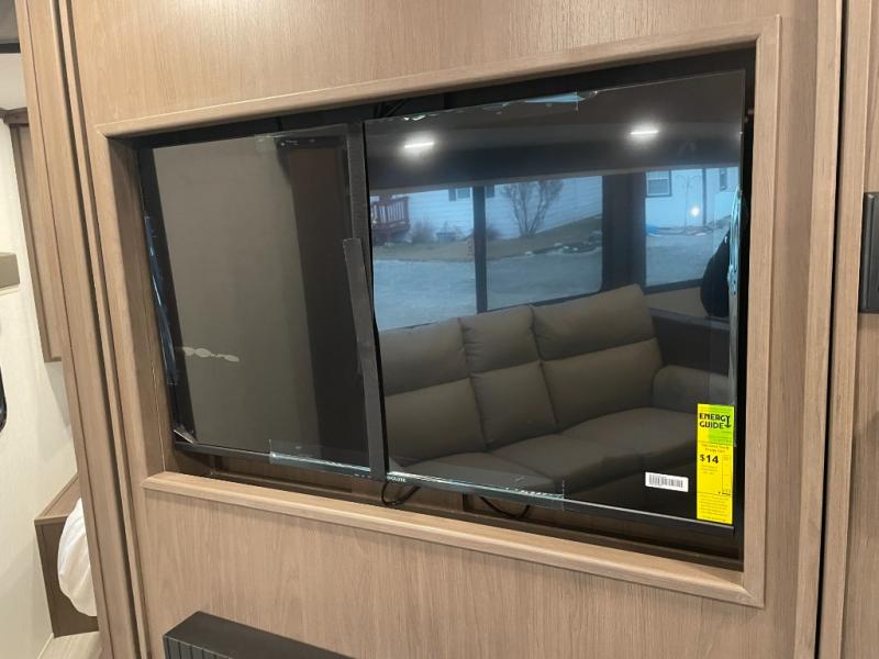 With dual entry doors in this travel trailer, you can enter in through the main living area or the full bath for convenience! Once inside, the sleeper sofa and booth dinette provide places to relax, eat, and play games, plus there is an entertainment center with hidden storage behind to keep movies organized. A full kitchen with a three-burner cooktop and 12V refrigerator will allow you to cook and store food, or you can head outdoors to utilize the outdoor kitchen prep area. There is also drop-frame storage outside for fishing poles and hiking gear, and the 21' electric awning provides shade as you relax. When it's time to call it a night, the king bed in the front private bedroom is sure to bring comfort, while the little ones take the double-size bunks, and any other guests can sleep on the living room furniture!