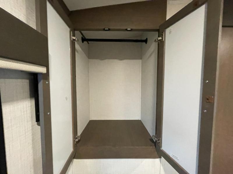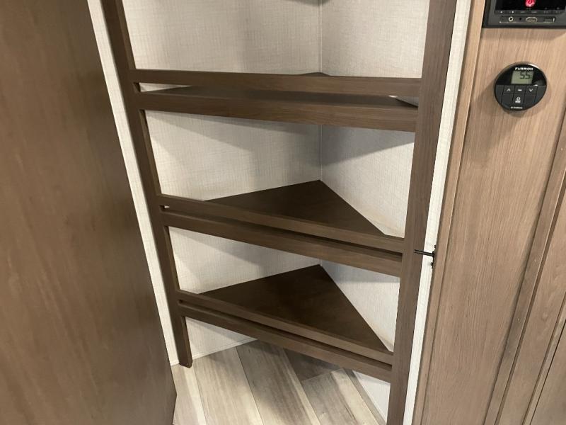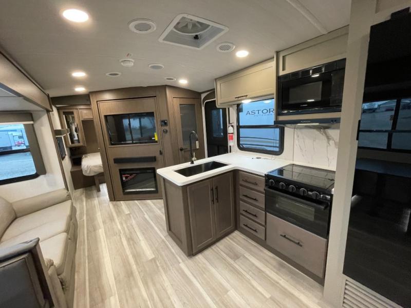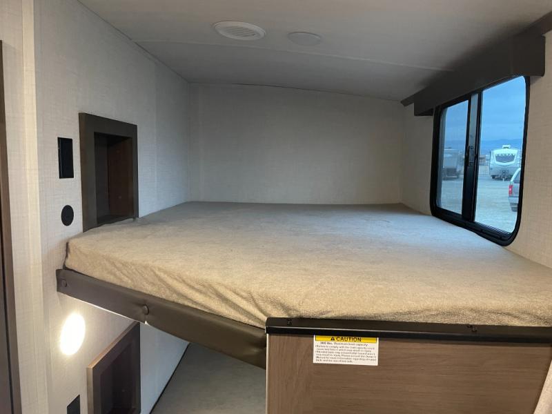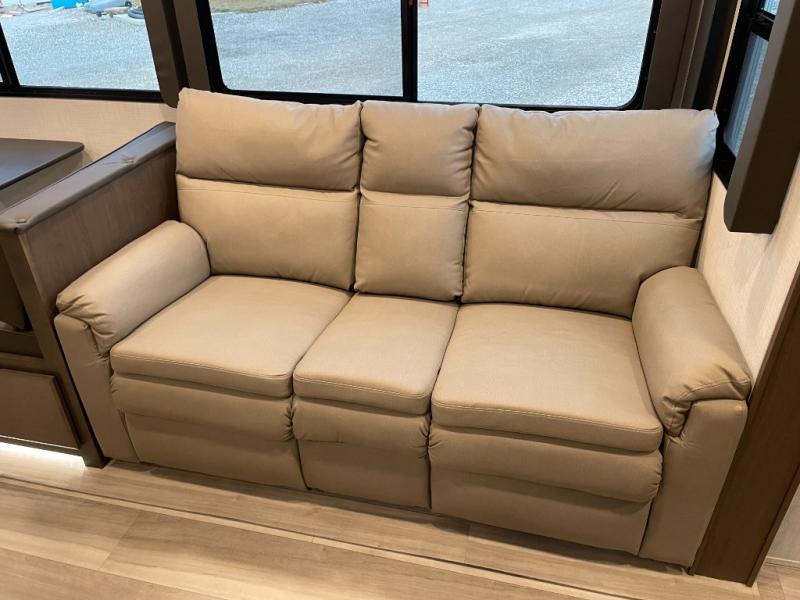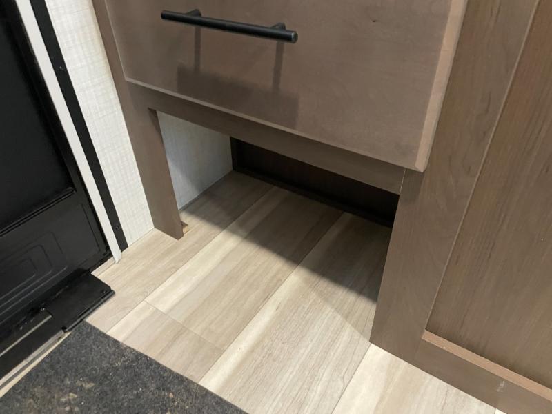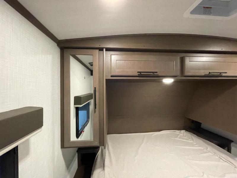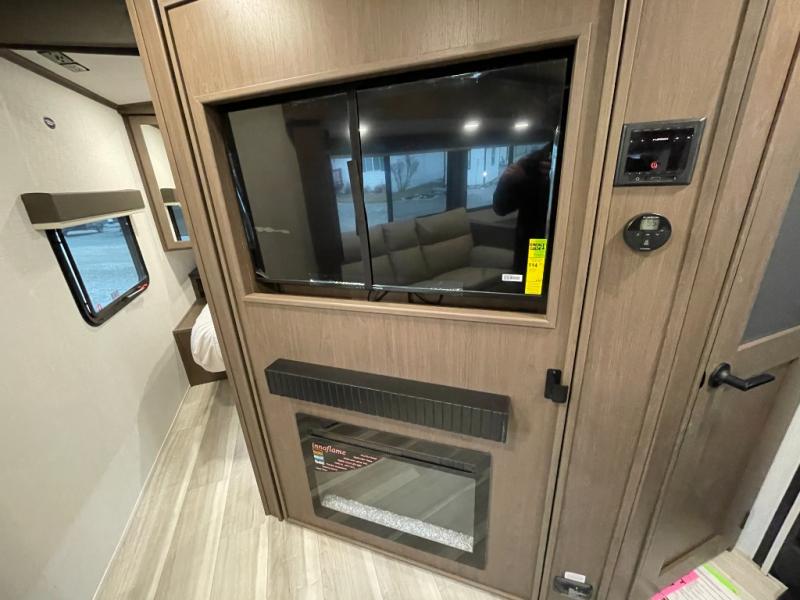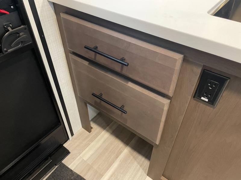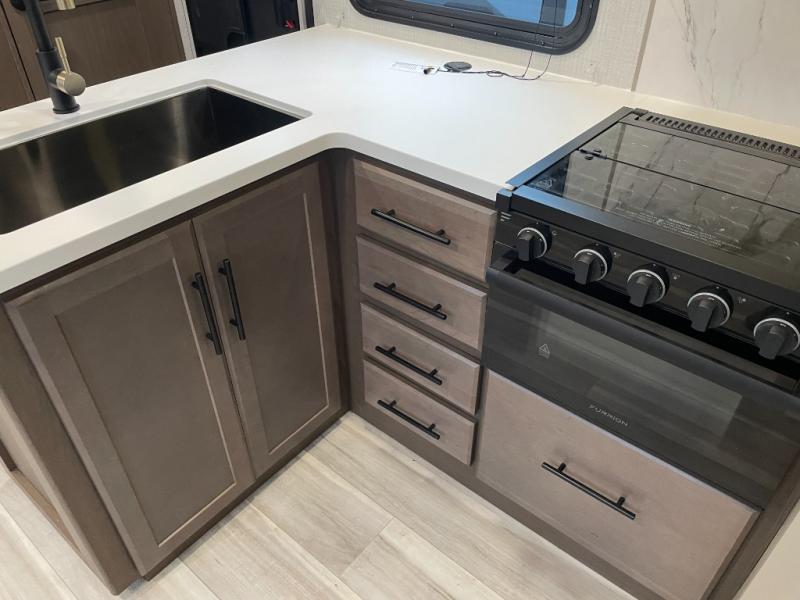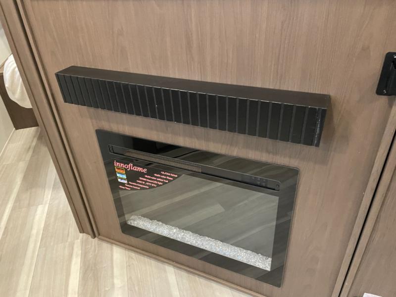 With dual entry doors in this travel trailer, you can enter in through the main living area or the full bath for convenience! Once inside, the sleeper sofa and booth dinette provide places to relax, eat, and play games, plus there is an entertainment center with hidden storage behind to keep movies organized. A full kitchen with a three-burner cooktop and 12V refrigerator will allow you to cook and store food, or you can head outdoors to utilize the outdoor kitchen prep area. There is also drop-frame storage outside for fishing poles and hiking gear, and the 21' electric awning provides shade as you relax. When it's time to call it a night, the king bed in the front private bedroom is sure to bring comfort, while the little ones take the double-size bunks, and any other guests can sleep on the living room furniture!