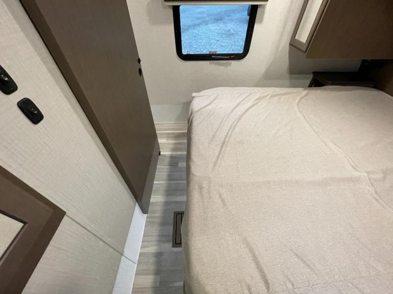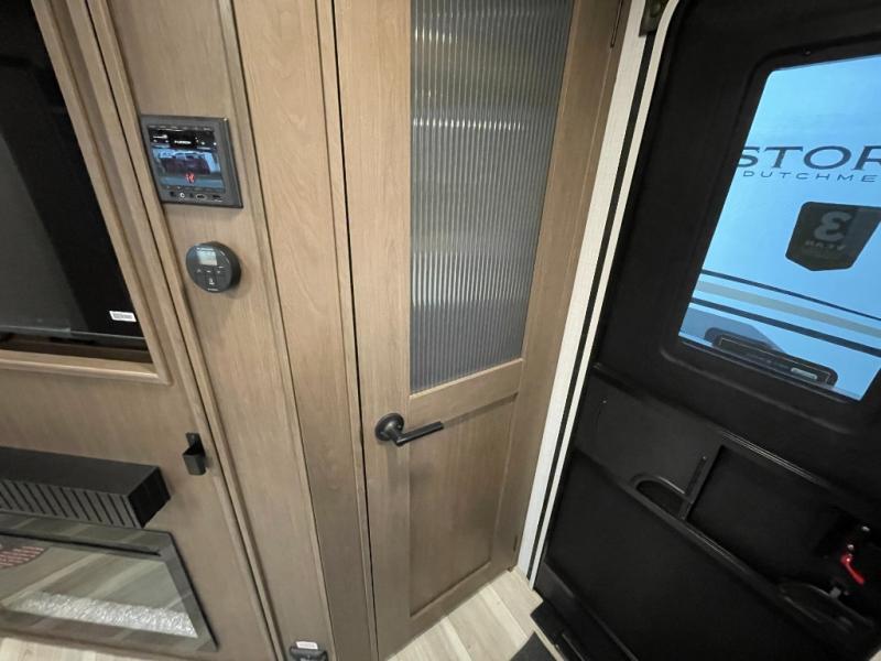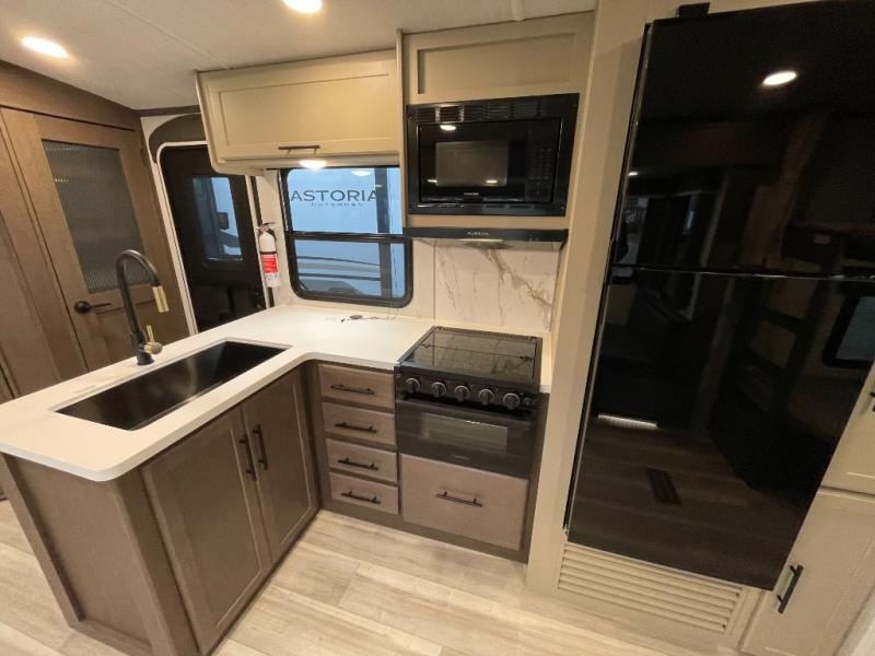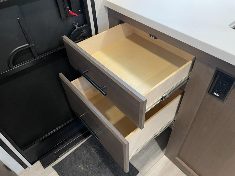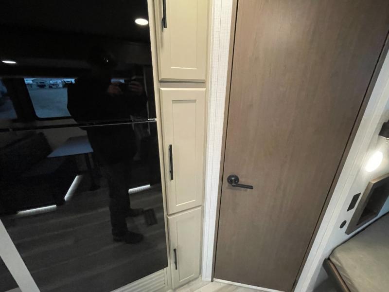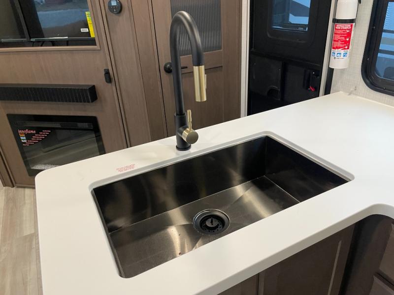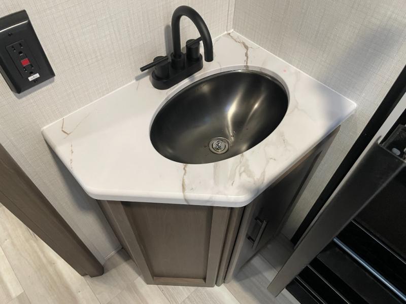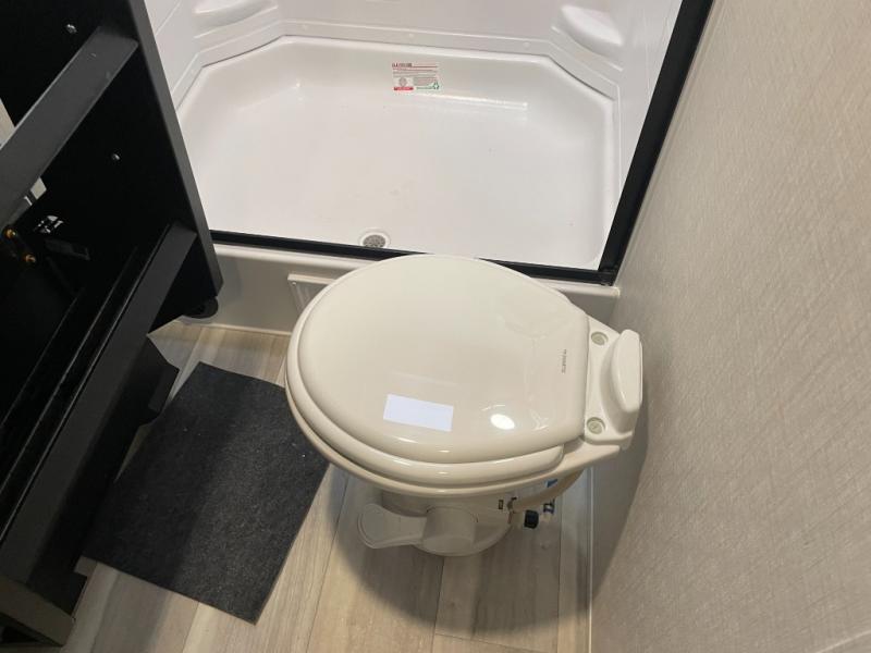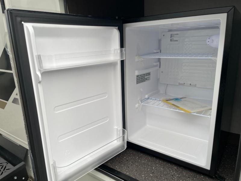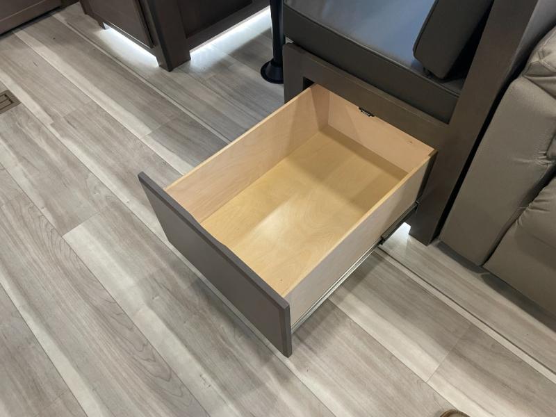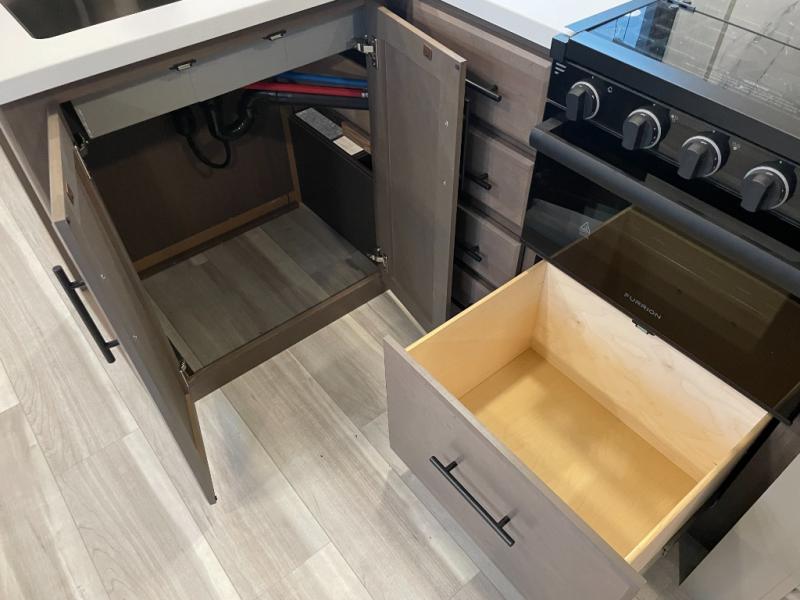 With dual entry doors in this travel trailer, you can enter in through the main living area or the full bath for convenience! Once inside, the sleeper sofa and booth dinette provide places to relax, eat, and play games, plus there is an entertainment center with hidden storage behind to keep movies organized. A full kitchen with a three-burner cooktop and 12V refrigerator will allow you to cook and store food, or you can head outdoors to utilize the outdoor kitchen prep area. There is also drop-frame storage outside for fishing poles and hiking gear, and the 21' electric awning provides shade as you relax. When it's time to call it a night, the king bed in the front private bedroom is sure to bring comfort, while the little ones take the double-size bunks, and any other guests can sleep on the living room furniture!