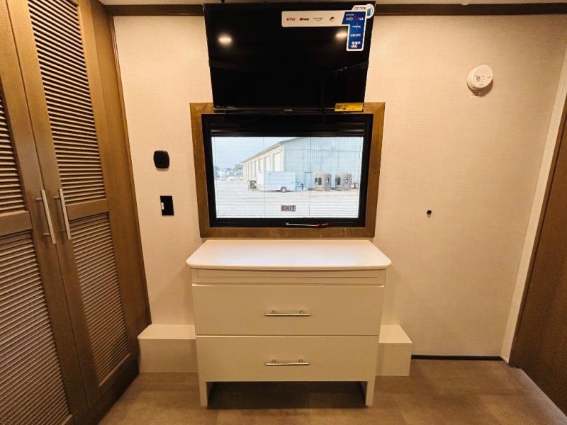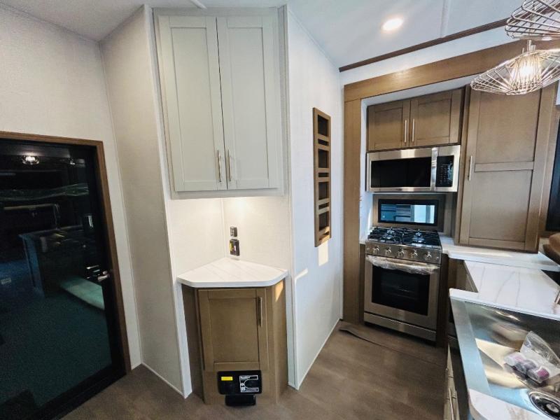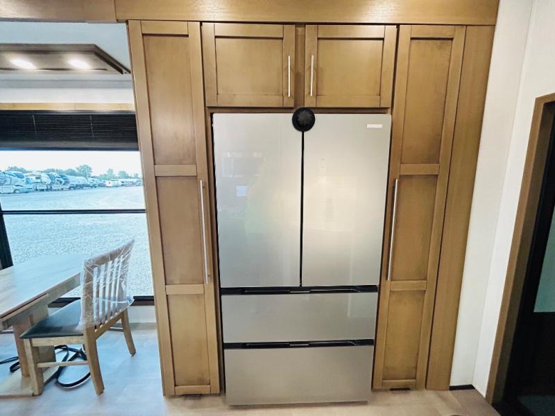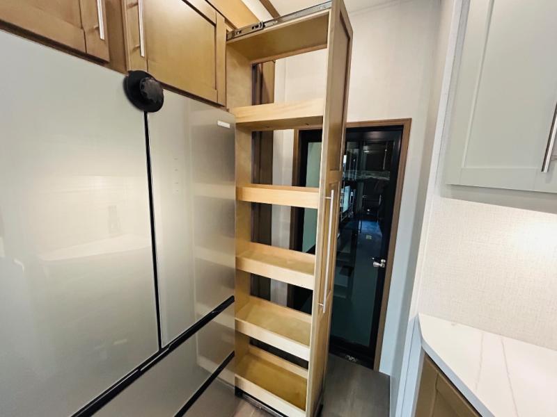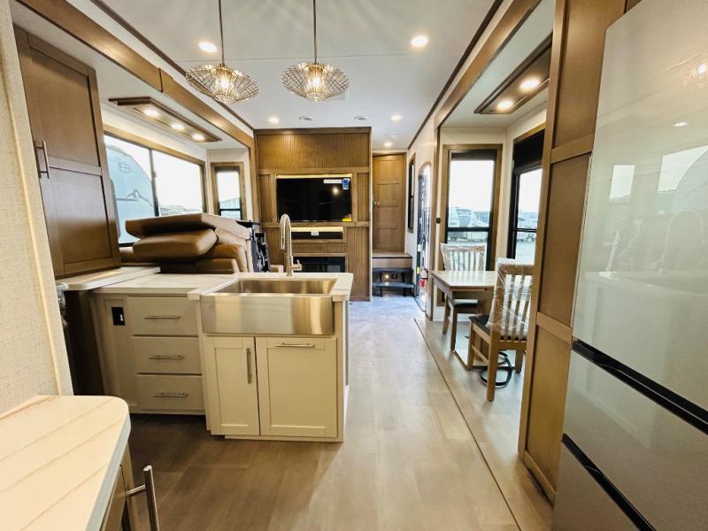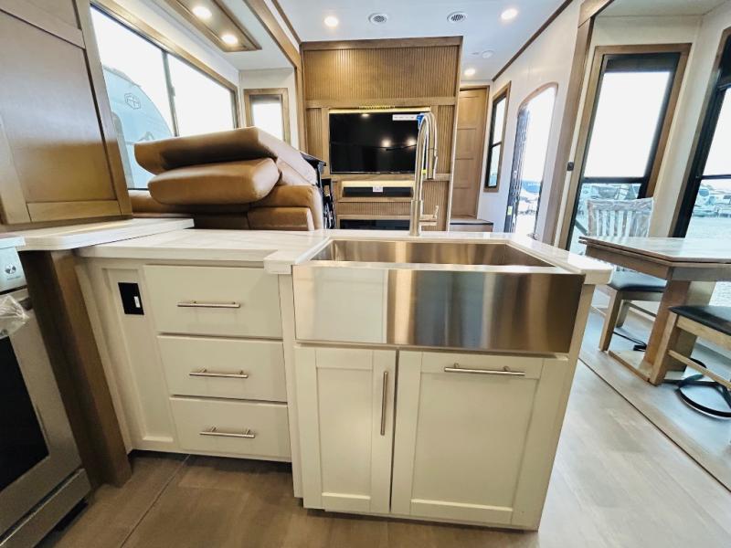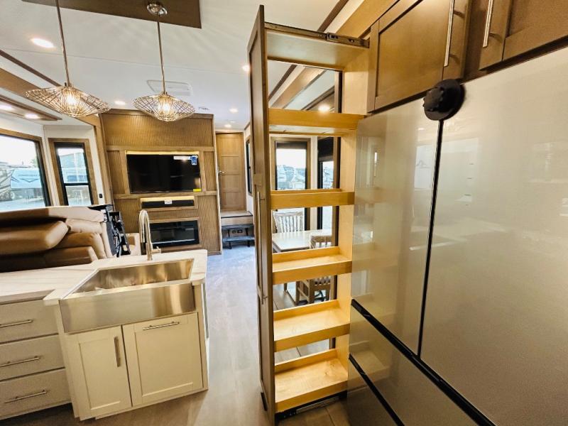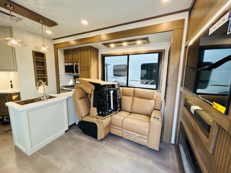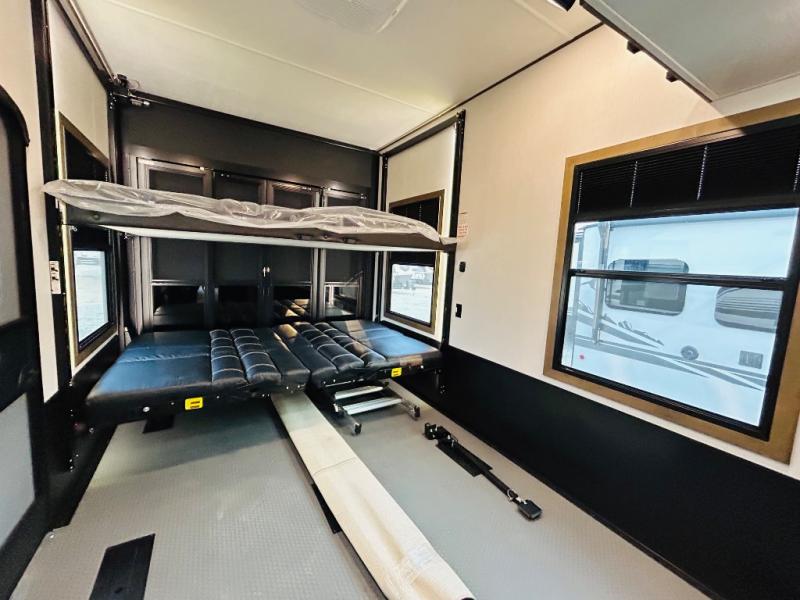 Adventure is just around the corner in this triple slide out, triple axle toy hauler. Once your toys are unloaded from the 13' 6" separate garage, you can relax on the dual opposing sofas that include a top queen bed for nighttime use. There is also a loft with a bunk mat here, overhead cabinets for storage, and an LED TV to watch the big game. The living area is where everyone can come together since there is a large L-shaped sofa, theater seating, and an entertainment center with a fireplace. You'll love the kitchen with its ample counter space, two pull-out pantries, a pull-out trash can, and residential refrigerator. You'll find the front private bedroom to be ultra accommodating with its master closet, dresser with hidden storage, LED TV, plus washer and dryer prep. And we saved the best for last! This unit also includes two full baths to make camping with friends and family easier than ever!