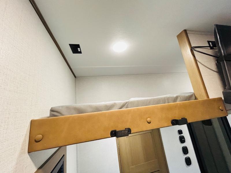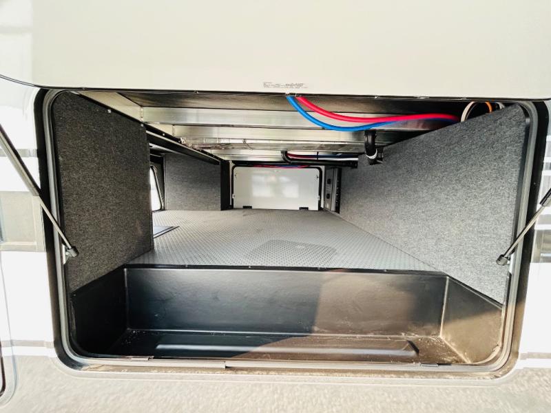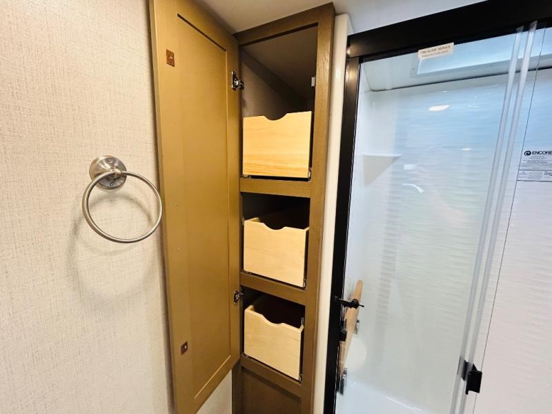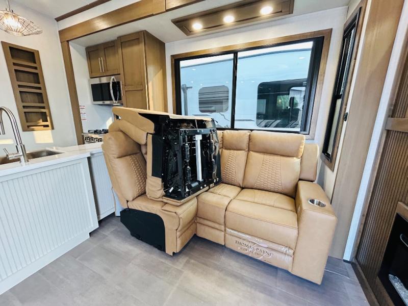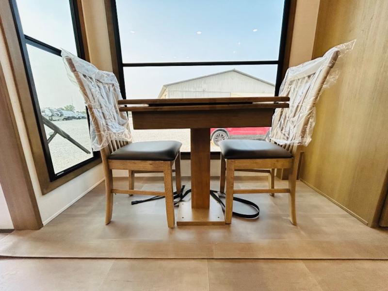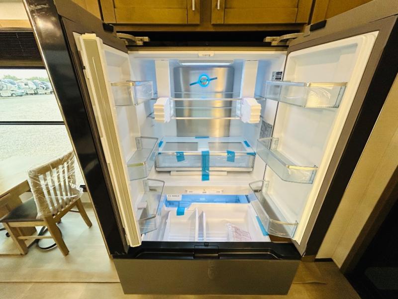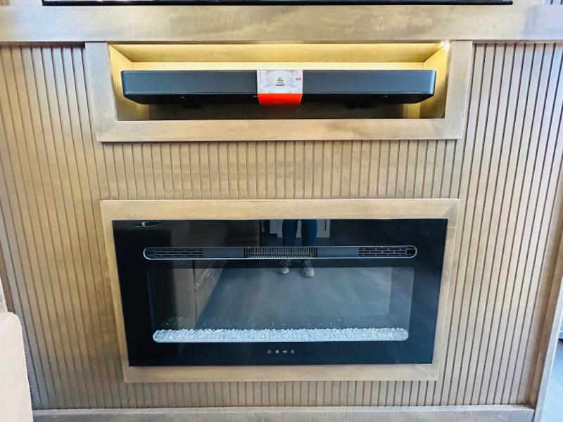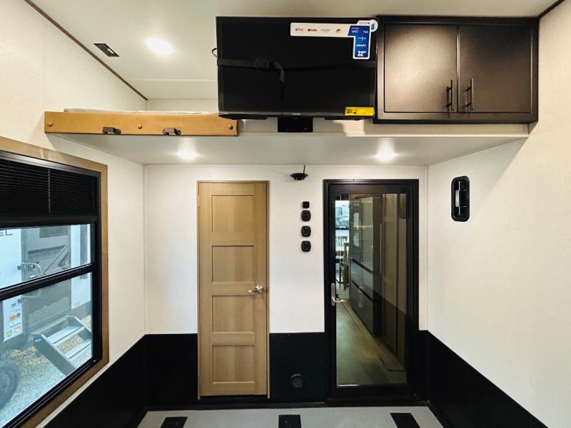 Adventure is just around the corner in this triple slide out, triple axle toy hauler. Once your toys are unloaded from the 13' 6" separate garage, you can relax on the dual opposing sofas that include a top queen bed for nighttime use. There is also a loft with a bunk mat here, overhead cabinets for storage, and an LED TV to watch the big game. The living area is where everyone can come together since there is a large L-shaped sofa, theater seating, and an entertainment center with a fireplace. You'll love the kitchen with its ample counter space, two pull-out pantries, a pull-out trash can, and residential refrigerator. You'll find the front private bedroom to be ultra accommodating with its master closet, dresser with hidden storage, LED TV, plus washer and dryer prep. And we saved the best for last! This unit also includes two full baths to make camping with friends and family easier than ever!