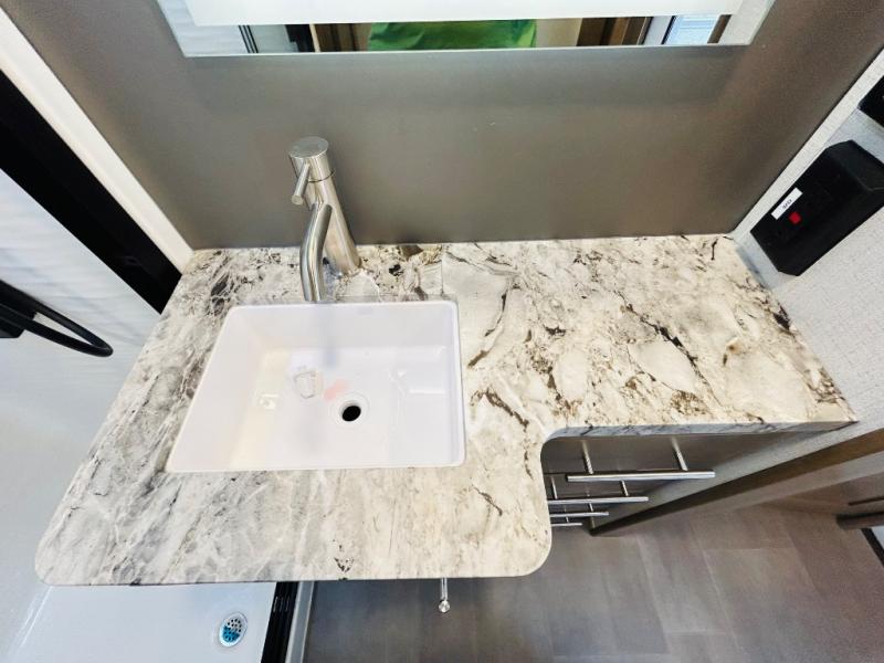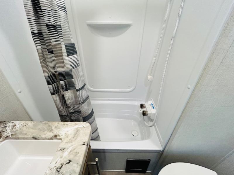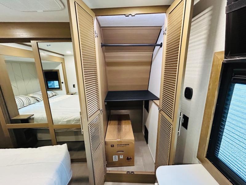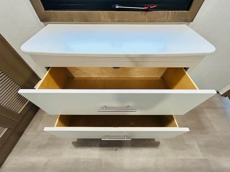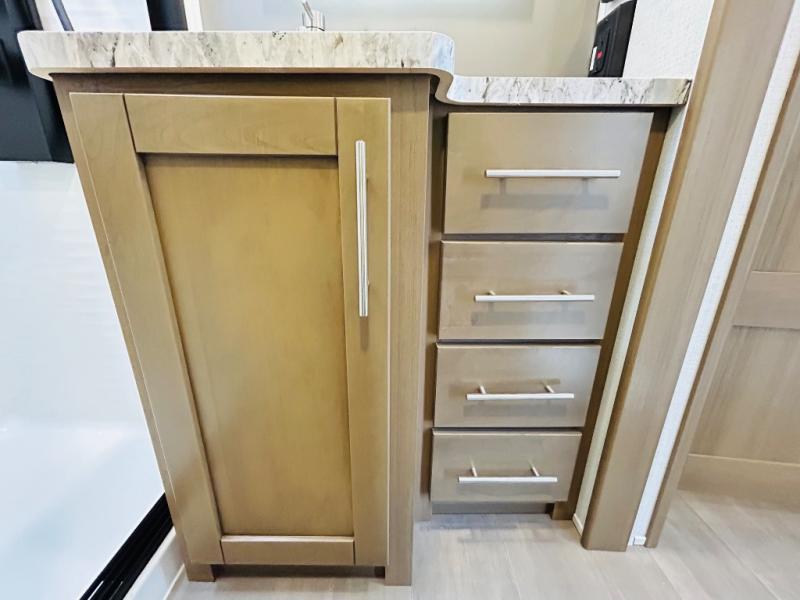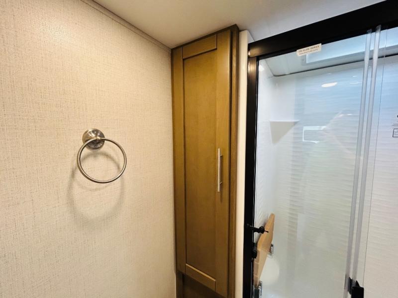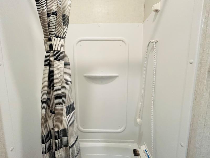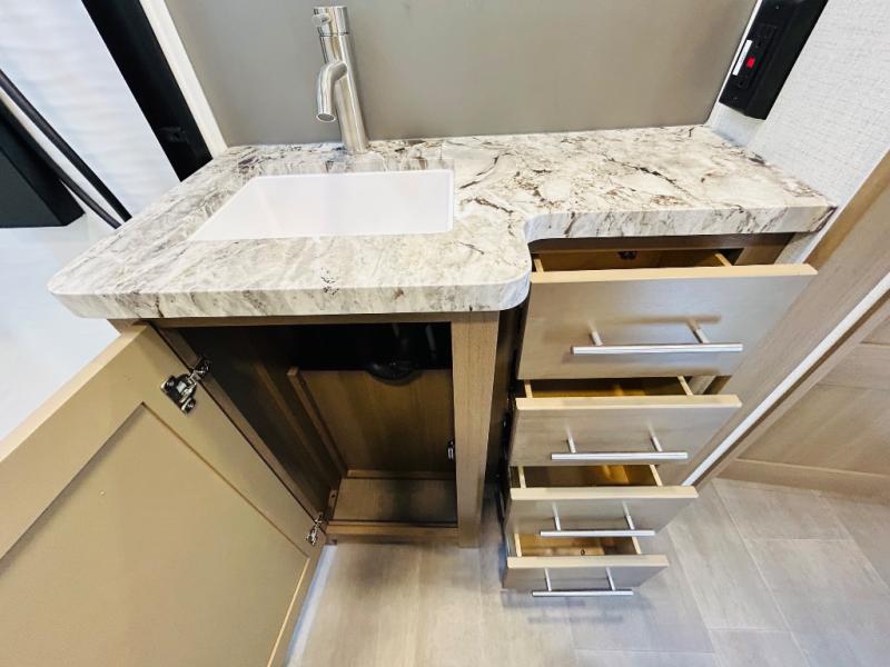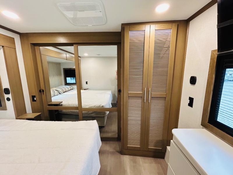 Adventure is just around the corner in this triple slide out, triple axle toy hauler. Once your toys are unloaded from the 13' 6" separate garage, you can relax on the dual opposing sofas that include a top queen bed for nighttime use. There is also a loft with a bunk mat here, overhead cabinets for storage, and an LED TV to watch the big game. The living area is where everyone can come together since there is a large L-shaped sofa, theater seating, and an entertainment center with a fireplace. You'll love the kitchen with its ample counter space, two pull-out pantries, a pull-out trash can, and residential refrigerator. You'll find the front private bedroom to be ultra accommodating with its master closet, dresser with hidden storage, LED TV, plus washer and dryer prep. And we saved the best for last! This unit also includes two full baths to make camping with friends and family easier than ever!