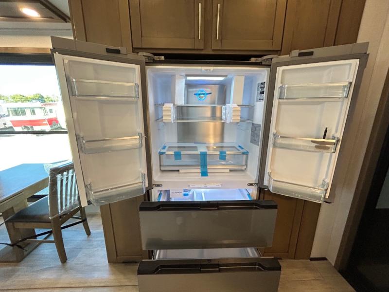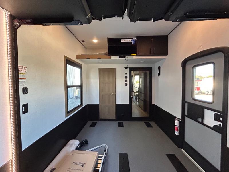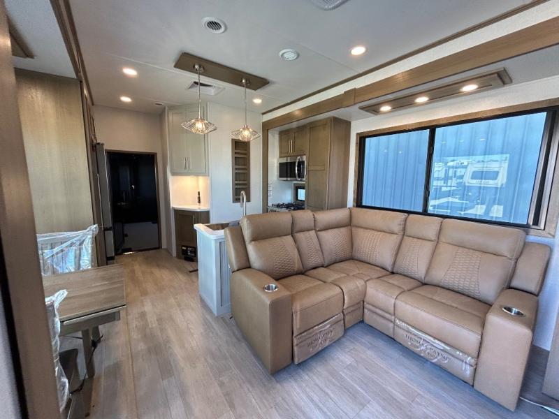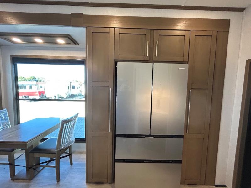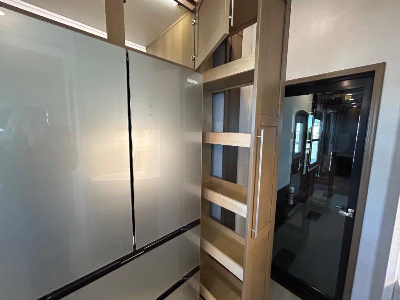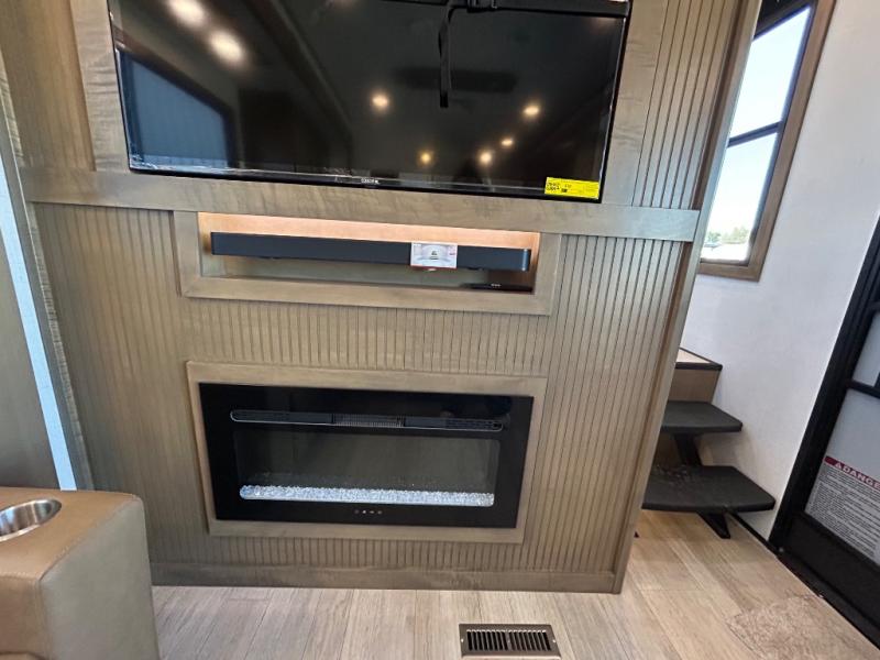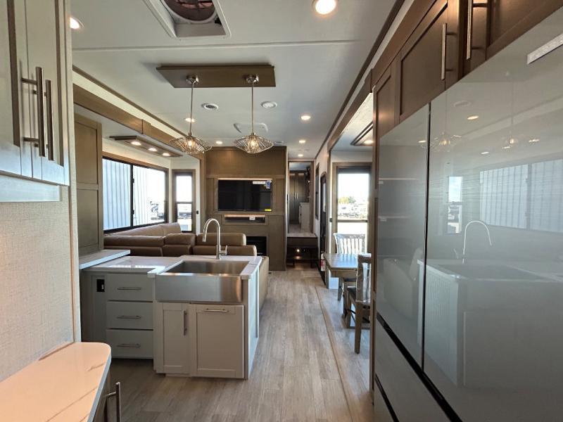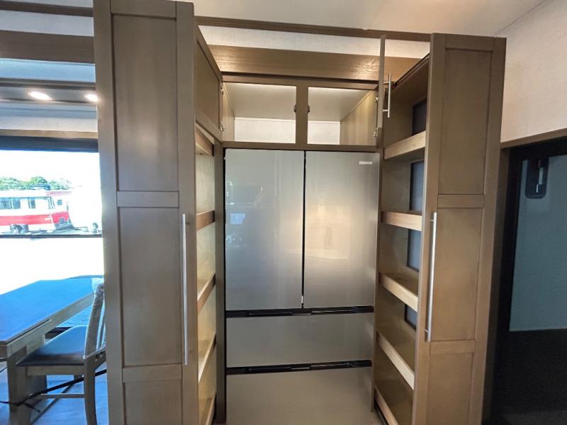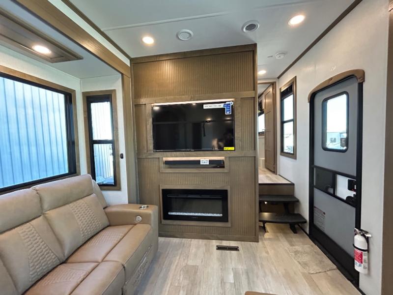Adventure is just around the corner in this triple slide out, triple axle toy hauler. Once your toys are unloaded from the 13' 6" separate garage, you can relax on the dual opposing sofas that include a top queen bed for nighttime use. There is also a loft with a bunk mat here, overhead cabinets for storage, and an LED TV to watch the big game. The living area is where everyone can come together since there is a large L-shaped sofa, theater seating, and an entertainment center with a fireplace. You'll love the kitchen with its ample counter space, two pull-out pantries, a pull-out trash can, and residential refrigerator. You'll find the front private bedroom to be ultra accommodating with its master closet, dresser with hidden storage, LED TV, plus washer and dryer prep. And we saved the best for last! This unit also includes two full baths to make camping with friends and family easier than ever!