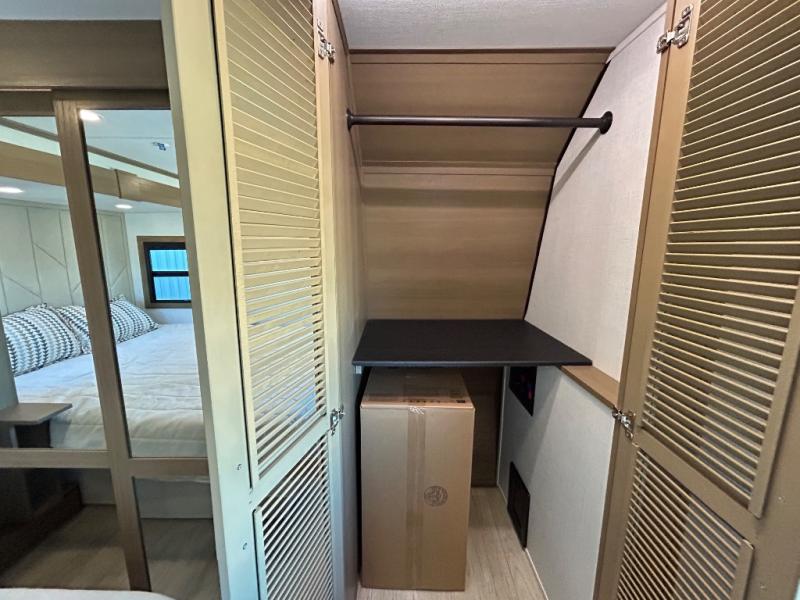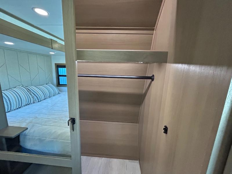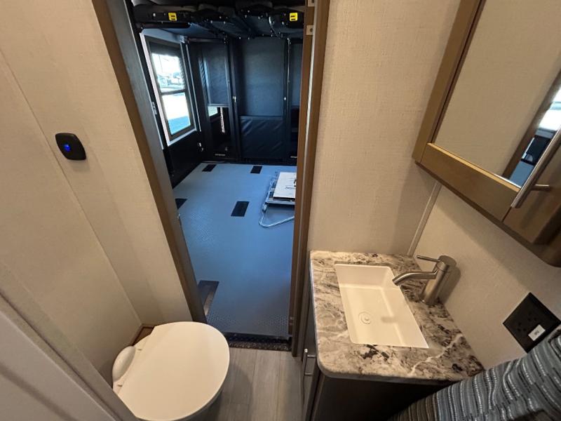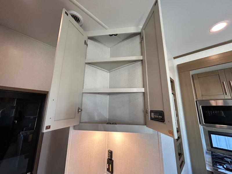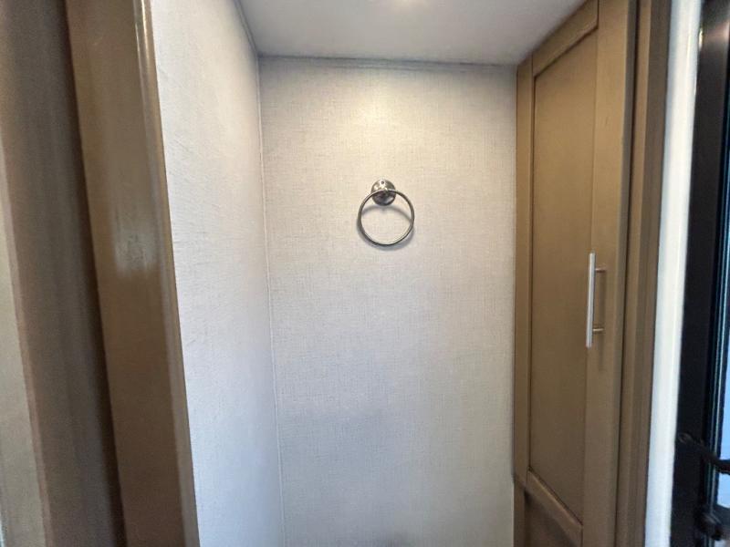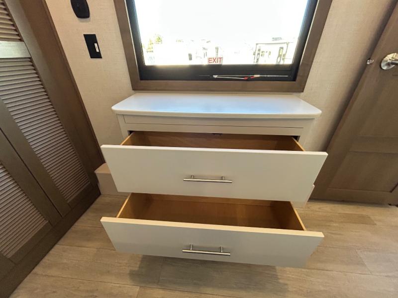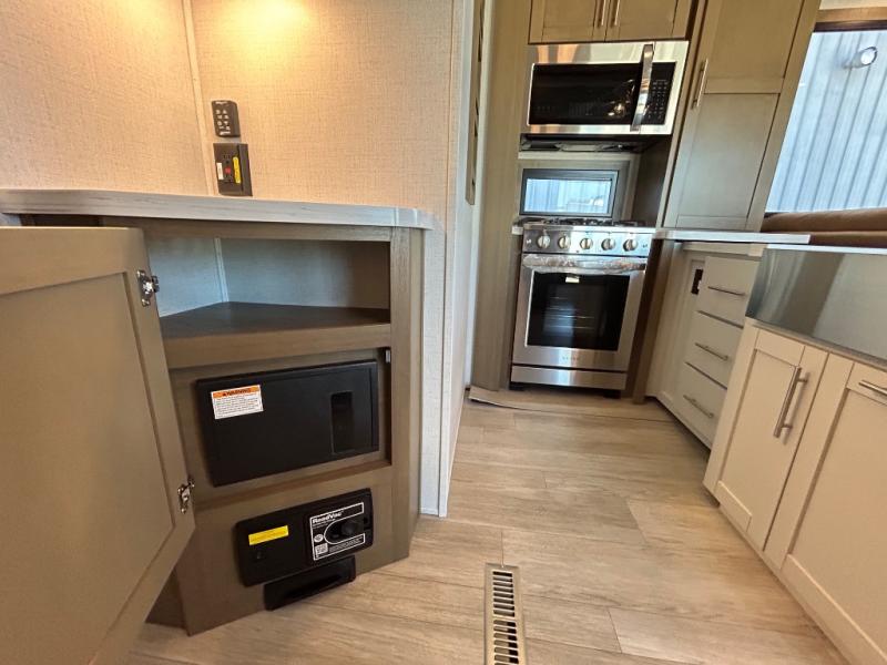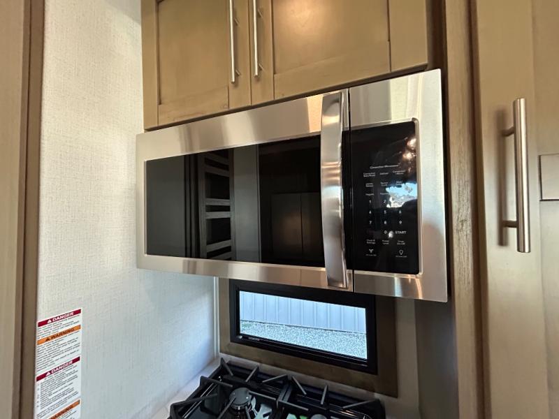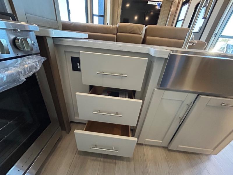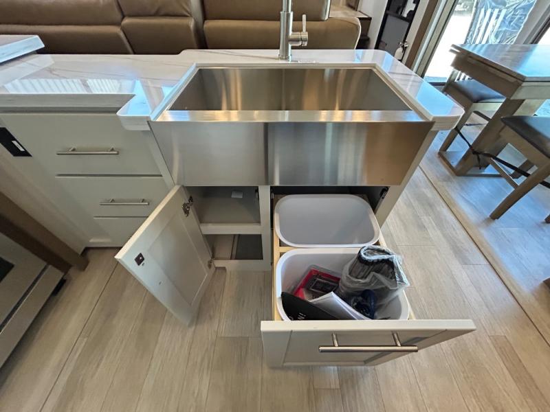 Adventure is just around the corner in this triple slide out, triple axle toy hauler. Once your toys are unloaded from the 13' 6" separate garage, you can relax on the dual opposing sofas that include a top queen bed for nighttime use. There is also a loft with a bunk mat here, overhead cabinets for storage, and an LED TV to watch the big game. The living area is where everyone can come together since there is a large L-shaped sofa, theater seating, and an entertainment center with a fireplace. You'll love the kitchen with its ample counter space, two pull-out pantries, a pull-out trash can, and residential refrigerator. You'll find the front private bedroom to be ultra accommodating with its master closet, dresser with hidden storage, LED TV, plus washer and dryer prep. And we saved the best for last! This unit also includes two full baths to make camping with friends and family easier than ever!