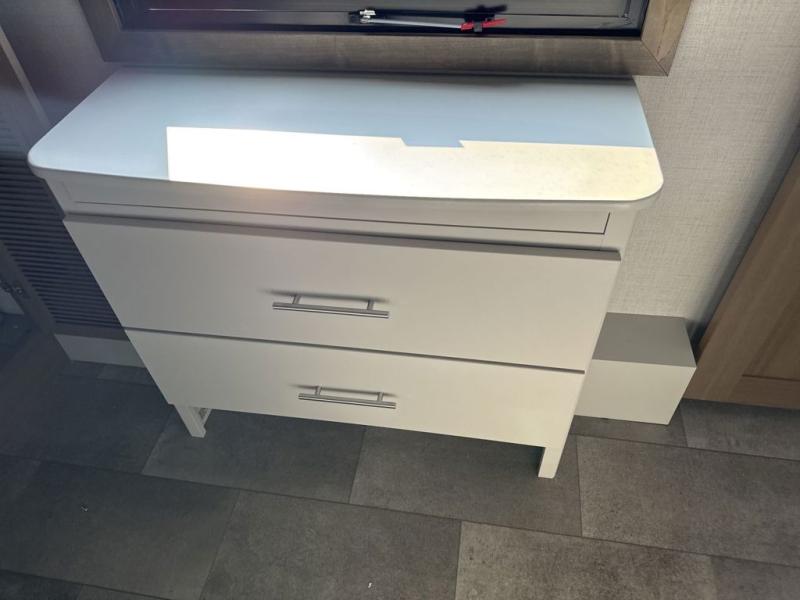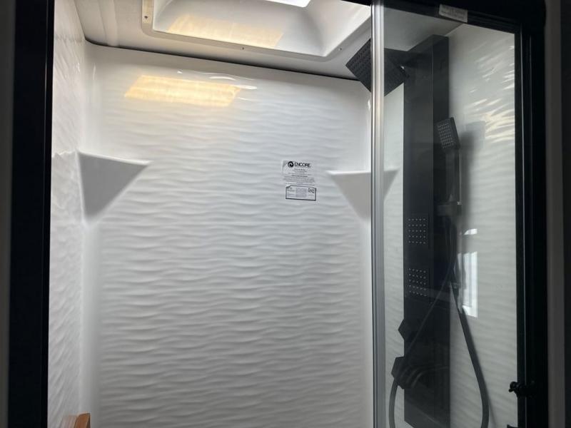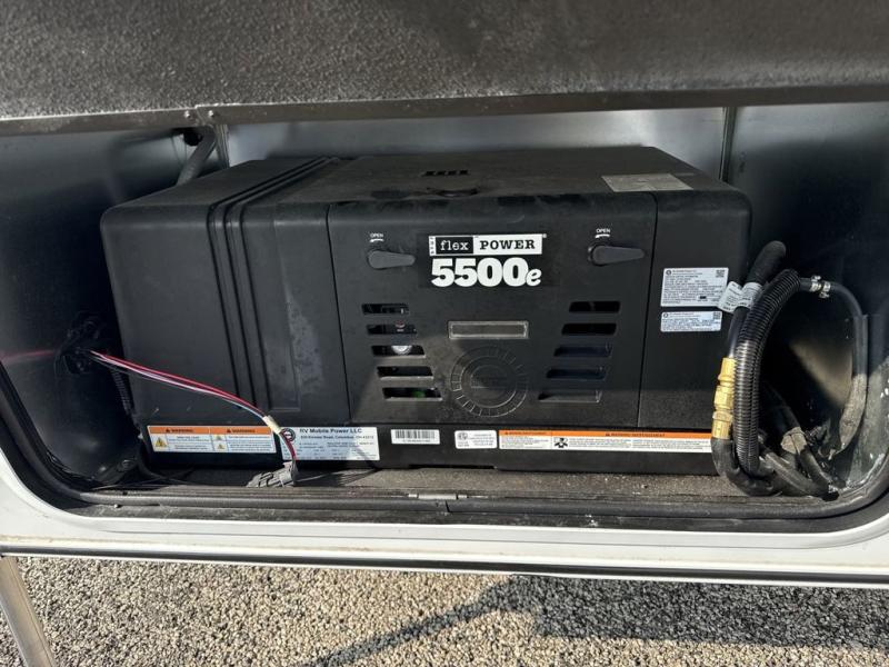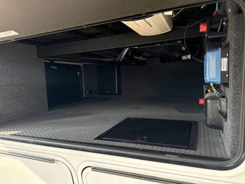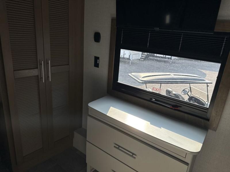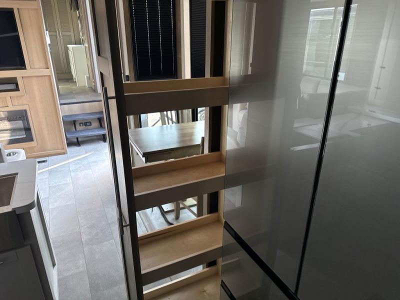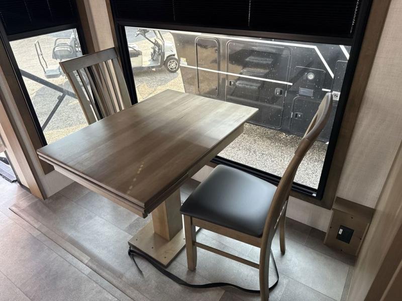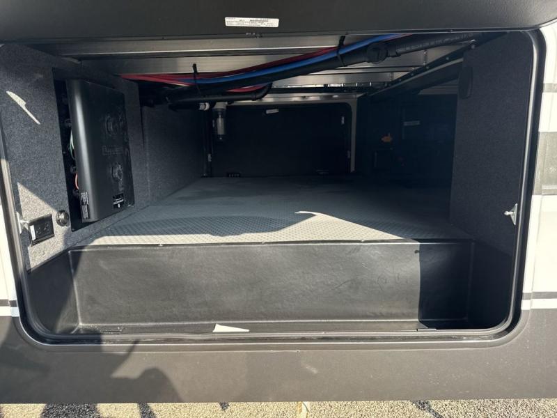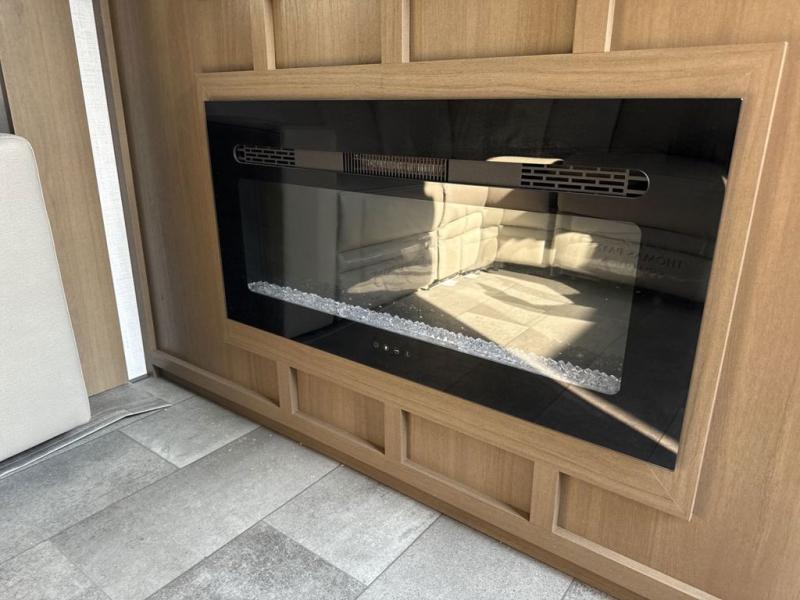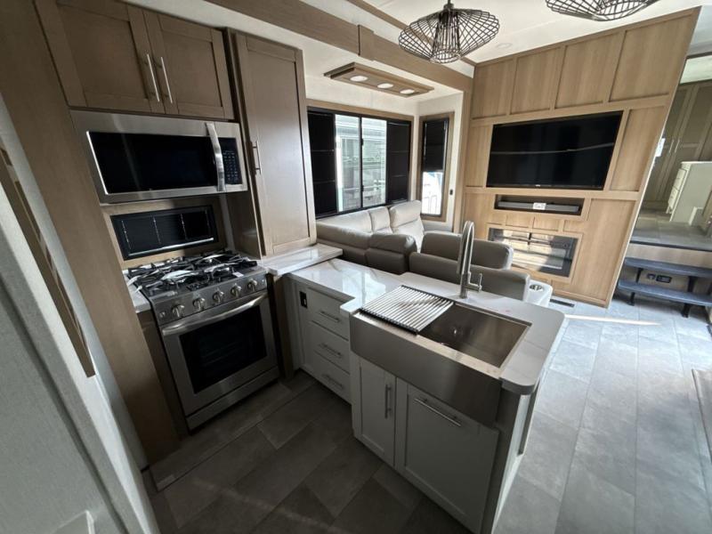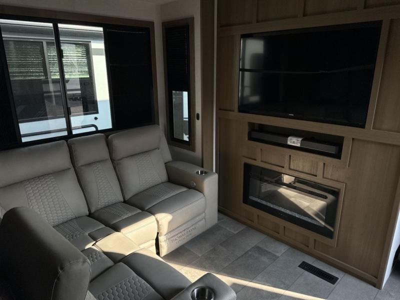 Adventure is just around the corner in this triple slide out, triple axle toy hauler. Once your toys are unloaded from the 13' 6" separate garage, you can relax on the dual opposing sofas that include a top queen bed for nighttime use. There is also a loft with a bunk mat here, overhead cabinets for storage, and an LED TV to watch the big game. The living area is where everyone can come together since there is a large L-shaped sofa, theater seating, and an entertainment center with a fireplace. You'll love the kitchen with its ample counter space, two pull-out pantries, a pull-out trash can, and residential refrigerator. You'll find the front private bedroom to be ultra accommodating with its master closet, dresser with hidden storage, LED TV, plus washer and dryer prep. And we saved the best for last! This unit also includes two full baths to make camping with friends and family easier than ever!