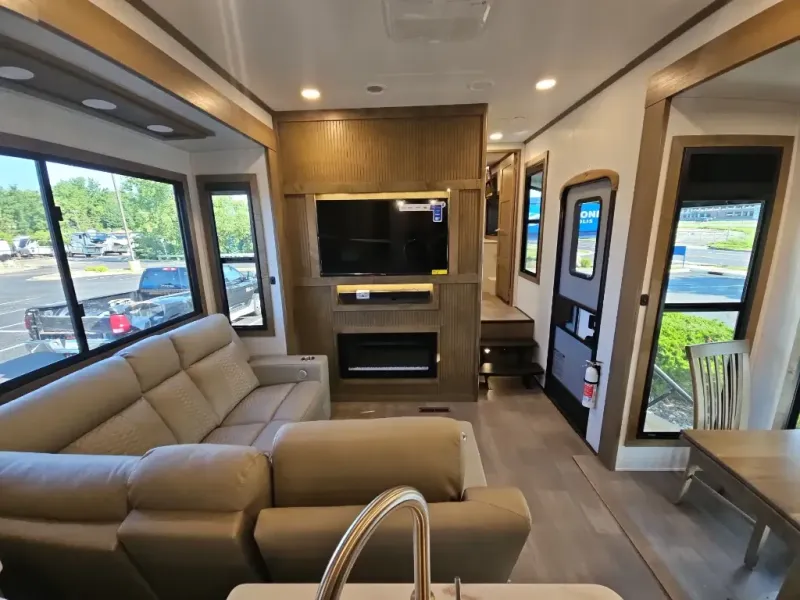 Adventure is just around the corner in this triple slide out, triple axle toy hauler. Once your toys are unloaded from the 13' 6" separate garage, you can relax on the dual opposing sofas that include a top queen bed for nighttime use. There is also a loft with a bunk mat here, overhead cabinets for storage, and an LED TV to watch the big game. The living area is where everyone can come together since there is a large L-shaped sofa, theater seating, and an entertainment center with a fireplace. You'll love the kitchen with its ample counter space, two pull-out pantries, a pull-out trash can, and residential refrigerator. You'll find the front private bedroom to be ultra accommodating with its master closet, dresser with hidden storage, LED TV, plus washer and dryer prep. And we saved the best for last! This unit also includes two full baths to make camping with friends and family easier than ever!