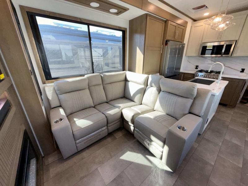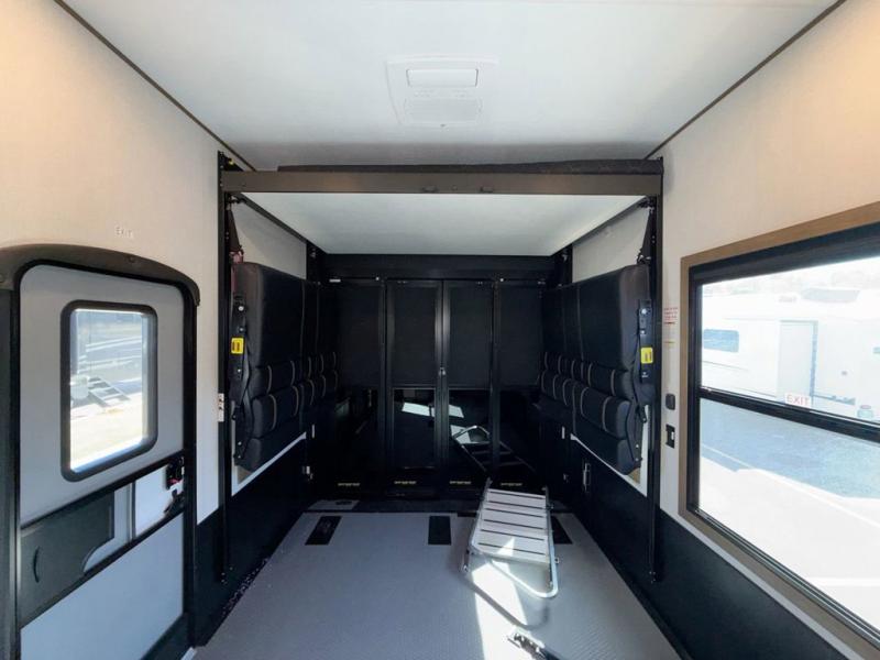 Adventure is just around the corner in this triple slide out, triple axle toy hauler. Once your toys are unloaded from the14' separate garage, you can relax on the dual opposing sofas that include a top queen bed for nighttime use. There is also a loft with a bunk mat here, overhead cabinets for storage, and an LED TV to watch the big game. The living area is where everyone can come together since there is an L-shaped sofa, theater seating, and an entertainment center for movies, and you can choose to add the optional dinette table to dine at. You'll love the kitchen with its counter peninsula, four burner range, and residential refrigerator. A full bath towards the front will let you freshen up each day, and the front private bedroom includes a Fuzion king bed for all-around comfort. There is also a master closet here, along with USB outlets, a dresser with hidden storage, plus washer and dryer prep!