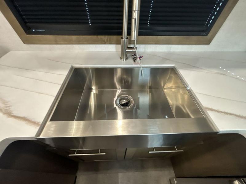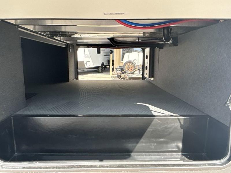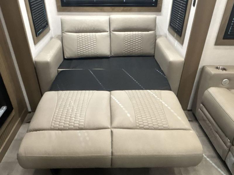 Adventure is just around the corner in this triple slide out, triple axle toy hauler. Once your toys are unloaded from the 14' separate garage, you can relax on the dual opposing sofas that include a top queen bed for nighttime use. There is also a loft with a bunk mat here, overhead cabinets for storage, and an LED TV to watch the big game. The living area is where everyone can come together since there is a hide-a-bed sofa, theater seating, and an entertainment center for movies, and you can choose to add the optional dinette table to dine at. You'll love the kitchen with its U-shaped counter, four burner range, and residential refrigerator. A full bath towards the front will let you freshen up each day, and the front private bedroom includes a Fuzion king bed for all-around comfort. There is also a master closet here, along with USB outlets, a dresser with hidden storage, plus washer and dryer prep!