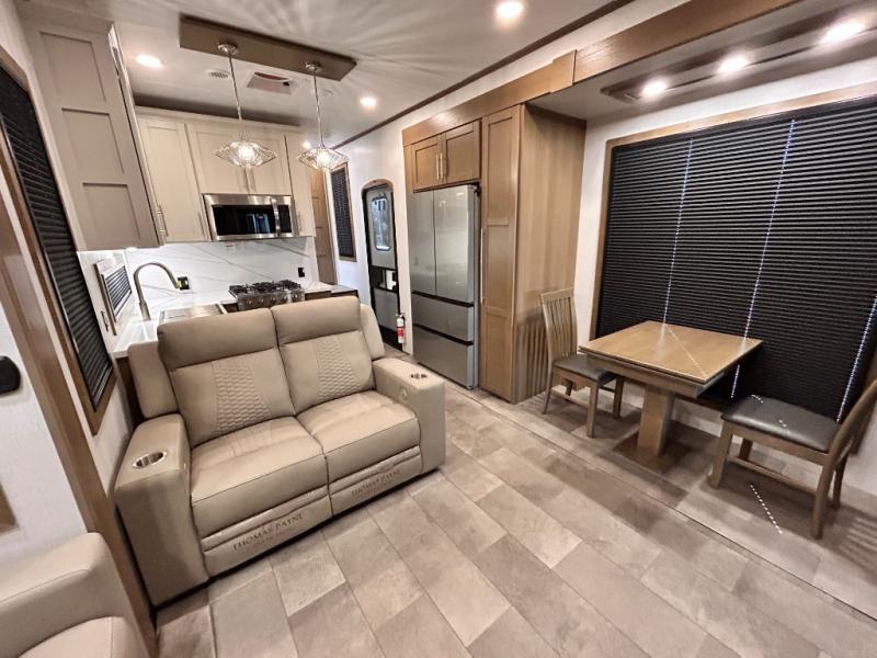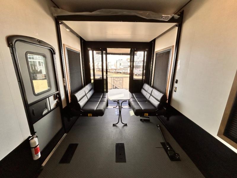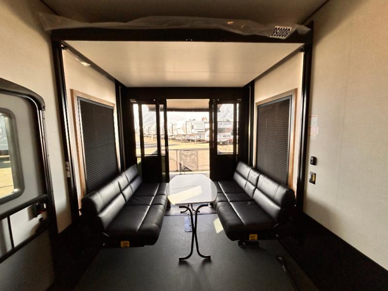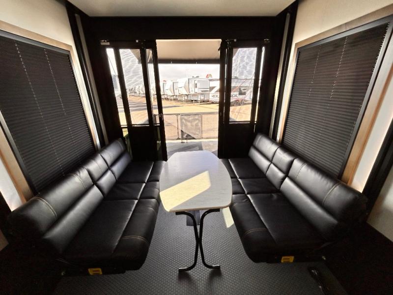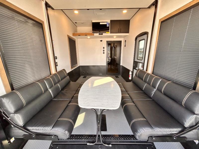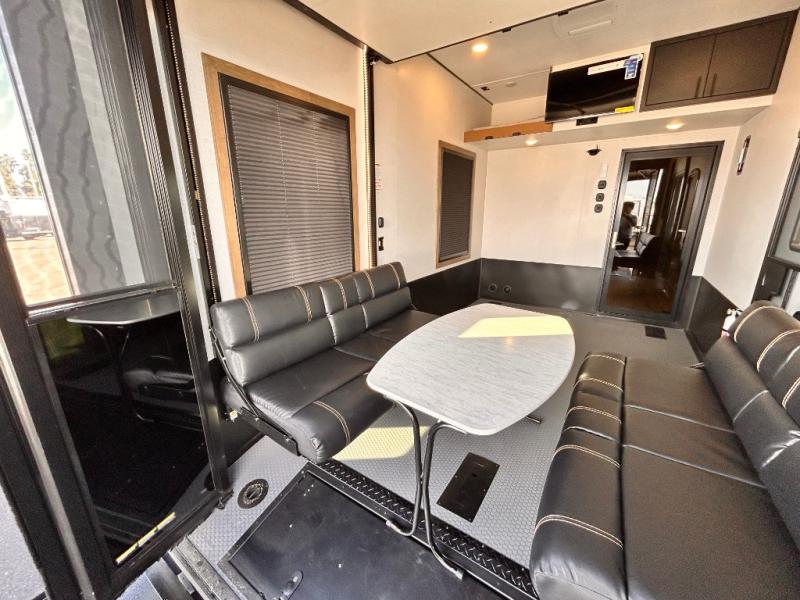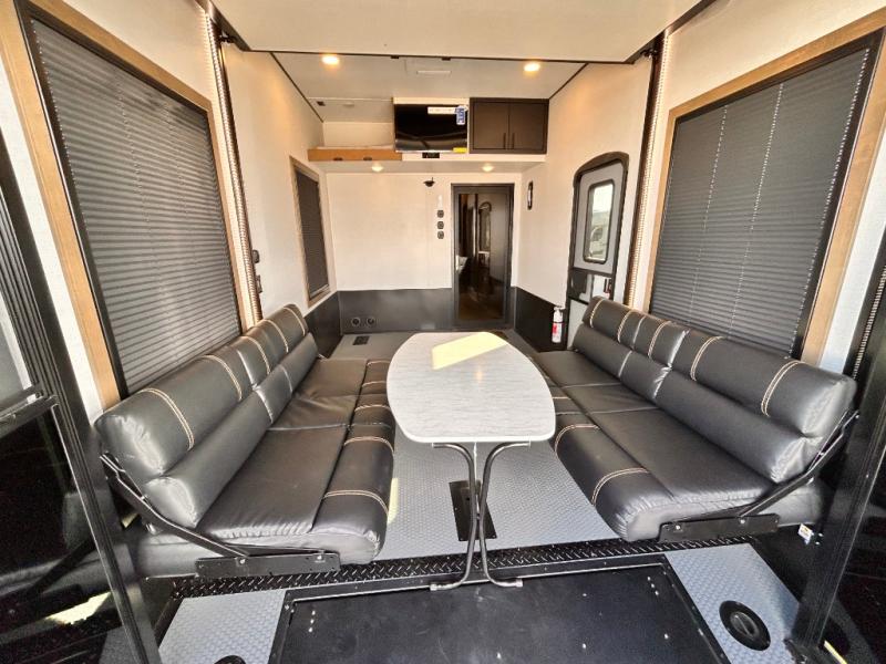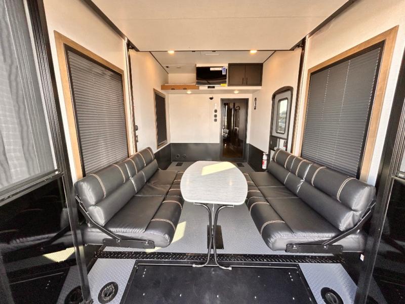 Adventure is just around the corner in this triple slide out, triple axle toy hauler. Once your toys are unloaded from the 14' separate garage, you can relax on the dual opposing sofas that include a top queen bed for nighttime use. There is also a loft with a bunk mat here, overhead cabinets for storage, and an LED TV to watch the big game. The living area is where everyone can come together since there is a hide-a-bed sofa, theater seating, and an entertainment center for movies, and you can choose to add the optional dinette table to dine at. You'll love the kitchen with its U-shaped counter, four burner range, and residential refrigerator. A full bath towards the front will let you freshen up each day, and the front private bedroom includes a Fuzion king bed for all-around comfort. There is also a master closet here, along with USB outlets, a dresser with hidden storage, plus washer and dryer prep!