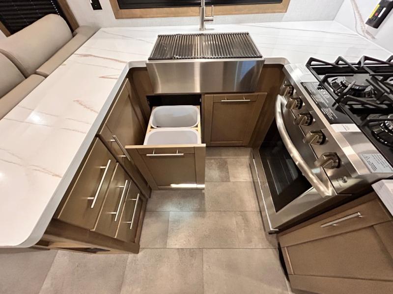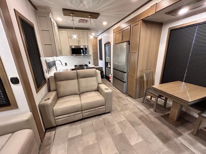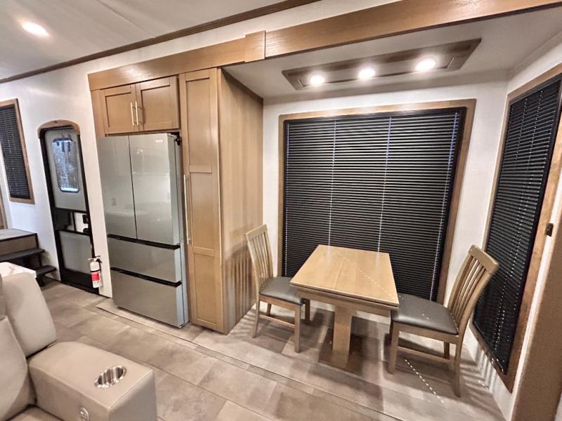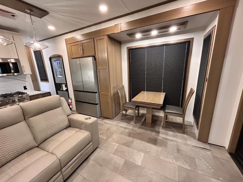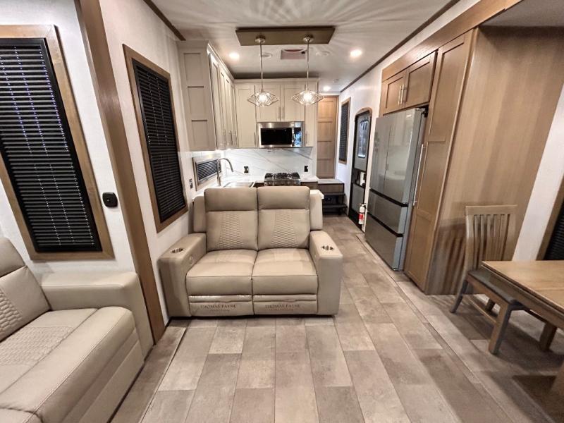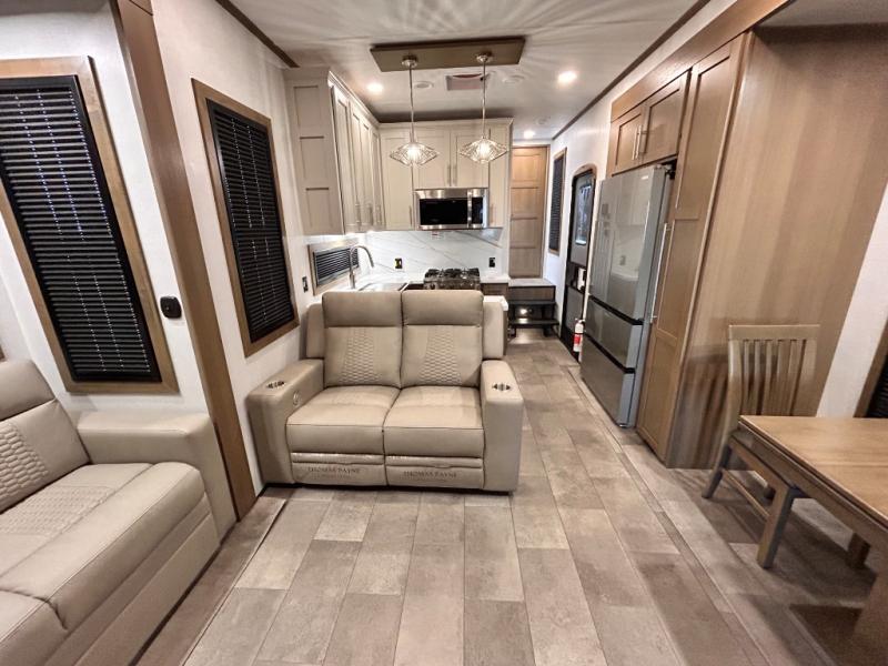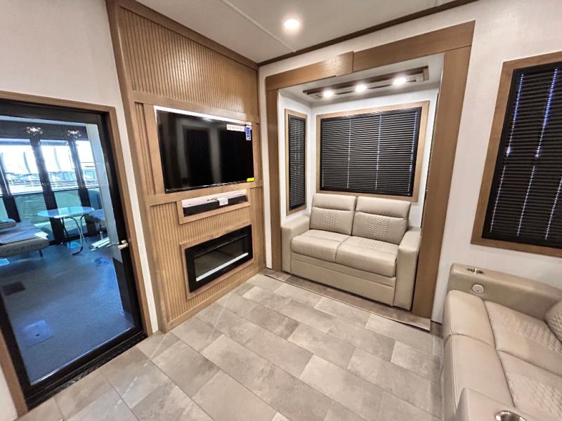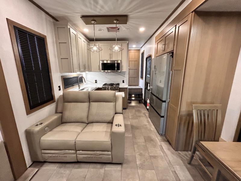 Adventure is just around the corner in this triple slide out, triple axle toy hauler. Once your toys are unloaded from the 14' separate garage, you can relax on the dual opposing sofas that include a top queen bed for nighttime use. There is also a loft with a bunk mat here, overhead cabinets for storage, and an LED TV to watch the big game. The living area is where everyone can come together since there is a hide-a-bed sofa, theater seating, and an entertainment center for movies, and you can choose to add the optional dinette table to dine at. You'll love the kitchen with its U-shaped counter, four burner range, and residential refrigerator. A full bath towards the front will let you freshen up each day, and the front private bedroom includes a Fuzion king bed for all-around comfort. There is also a master closet here, along with USB outlets, a dresser with hidden storage, plus washer and dryer prep!