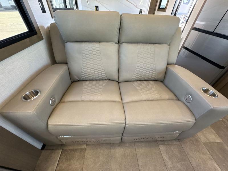 Adventure is just around the corner in this triple slide out, triple axle toy hauler. Once your toys are unloaded from the 14' separate garage, you can relax on the dual opposing sofas that include a top queen bed for nighttime use. There is also a loft with a bunk mat here, overhead cabinets for storage, and an LED TV to watch the big game. The living area is where everyone can come together since there is a hide-a-bed sofa, theater seating, and an entertainment center for movies, and you can choose to add the optional dinette table to dine at. You'll love the kitchen with its U-shaped counter, four burner range, and residential refrigerator. A full bath towards the front will let you freshen up each day, and the front private bedroom includes a Fuzion king bed for all-around comfort. There is also a master closet here, along with USB outlets, a dresser with hidden storage, plus washer and dryer prep!