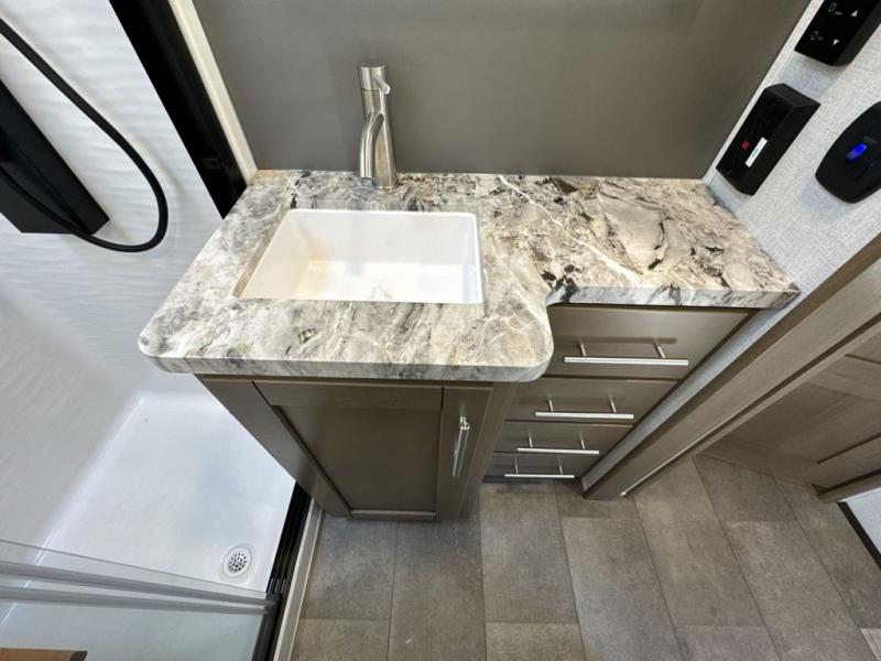 Get your adrenaline pumping with any one of these Keystone RV Fuzion fifth wheel toy haulers! The frame welded, Adjust-A-Trac tie-downs have 38 points to fully secure your toys as you travel, and the extended garage lengths have outside storage so you can haul bigger toys. A fuel pump station will let you easily fill up before heading out, and the exclusive Omni-Chill technology offers high-efficiency air conditioning and maximum cooling. The interior provides fiberglass backed linoleum flooring, extra-tall slide height, solid wood cabinet and drawer frames, and extra tall ceilings with crown molding to mention a few luxuries. Outside, you'll find three Girard cassette awnings, 4k framed tinted safety glass windows, a Titan hydraulic leveling system, and many more conveniences!