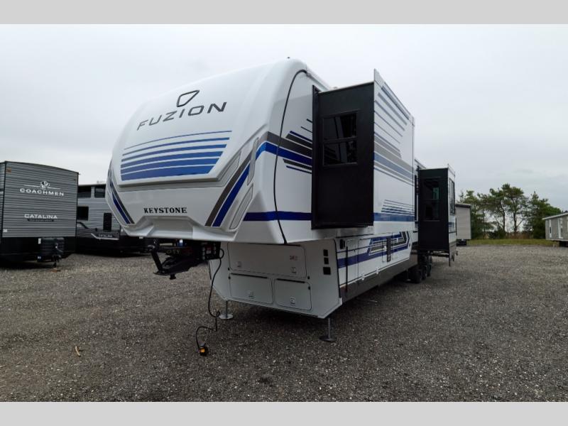 Get your adrenaline pumping with any one of these Keystone RV Fuzion fifth wheel toy haulers! The frame welded, Adjust-A-Trac tie-downs have 38 points to fully secure your toys as you travel, and the extended garage lengths have outside storage so you can haul bigger toys. A fuel pump station will let you easily fill up before heading out, and the exclusive Omni-Chill technology offers high-efficiency air conditioning and maximum cooling. The interior provides fiberglass backed linoleum flooring, extra-tall slide height, solid wood cabinet and drawer frames, and extra tall ceilings with crown molding to mention a few luxuries. Outside, you'll find three Girard cassette awnings, 4k framed tinted safety glass windows, a Titan hydraulic leveling system, and many more conveniences!