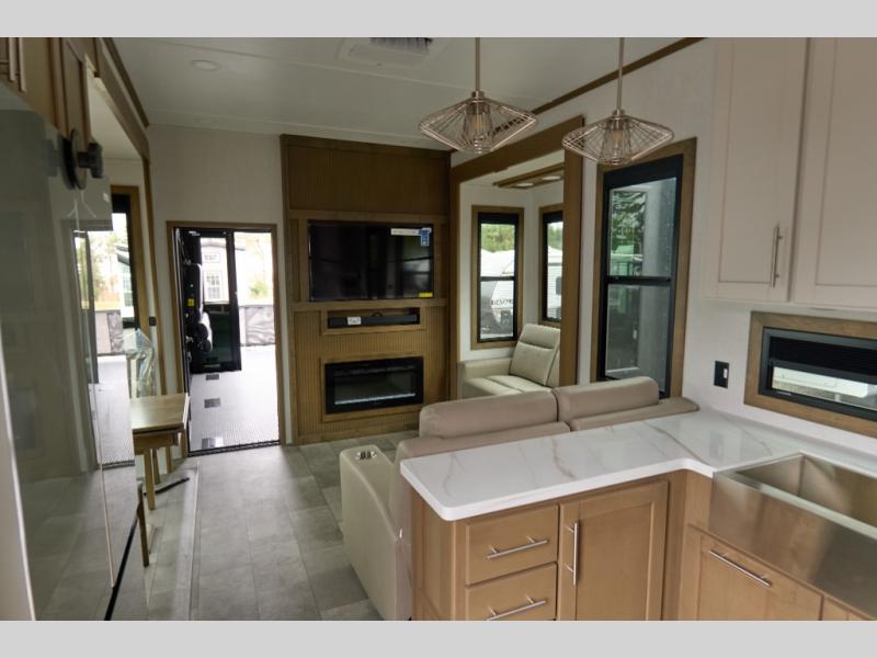 Adventure is just around the corner in this triple slide out, triple axle toy hauler. Once your toys are unloaded from the 14' separate garage, you can relax on the dual opposing sofas that include a top queen bed for nighttime use. There is also a loft with a bunk mat here, overhead cabinets for storage, and an LED TV to watch the big game. The living area is where everyone can come together since there is a hide-a-bed sofa, theater seating, and an entertainment center for movies, and you can choose to add the optional dinette table to dine at. You'll love the kitchen with its U-shaped counter, four burner range, and residential refrigerator. A full bath towards the front will let you freshen up each day, and the front private bedroom includes a Fuzion king bed for all-around comfort. There is also a master closet here, along with USB outlets, a dresser with hidden storage, plus washer and dryer prep!
