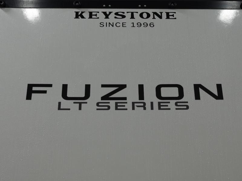 Embrace the great outdoors with a Fuzion Impact Edition toy hauler by Keystone! There is an aluminum exterior and a 8' 4" wide-body construction for your toys and gear! The one-piece polypropylene heated underbelly includes enclosed tanks and valves which will help extend your camping season, and the leaf spring suspension system will provide smooth towing. Head inside to enjoy night shades, hardwood cabinetry, and fiberglass backed linoleum floor with no carpet-free for easy cleaning. Each model also includes a Girard on-demand water heater, two 30 lb. LP tanks, recessed LED puck lighting throughout, and the list of comforts goes on!
