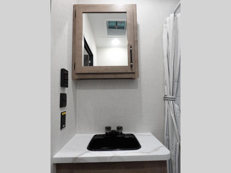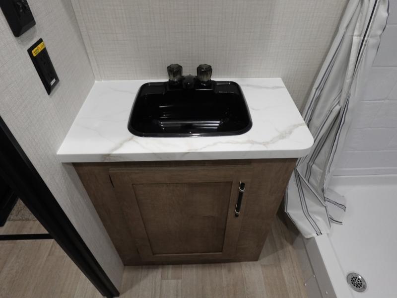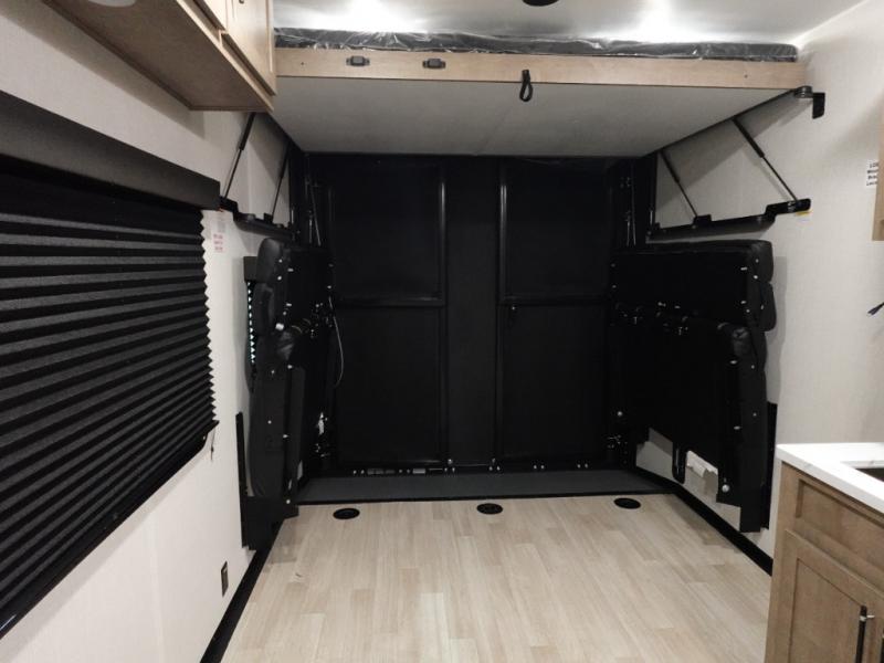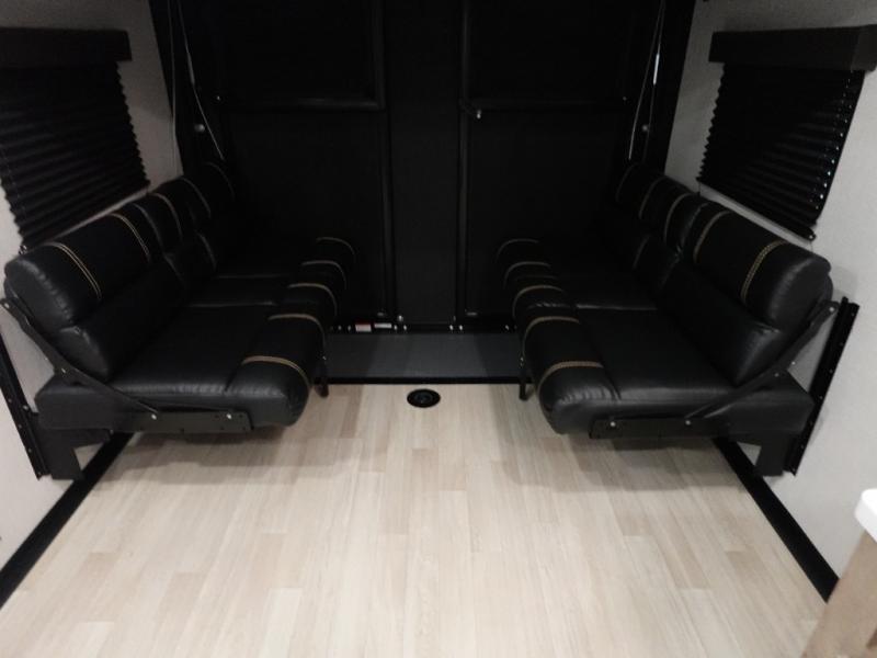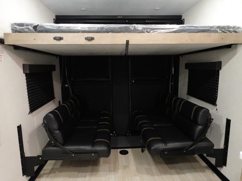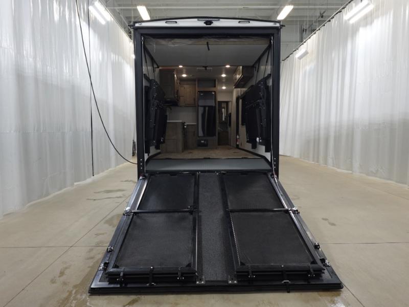 This open concept toy hauler is sure to meet all of your needs. There is a full kitchen with a Furrion three burner gas range and a microwave oven to prepare meals, plus a 10 cu. ft. 12V refrigerator to keep food fresh. You'll find comfortable seating space on the dual opposing sofas with a top queen bed, and there is TV prep if you want to add some entertainment. The RV queen bed in the front master bedroom will bring a great night's rest, and the dual entry bath lets you clean up after trail riding. When you're ready to head home, the 13' 4" garage area includes frame welded tie downs to keep your toys secure.