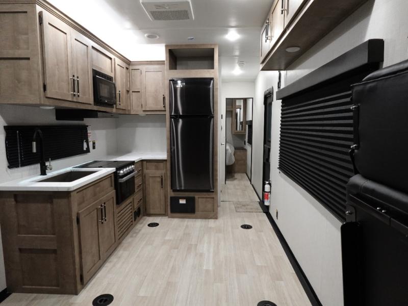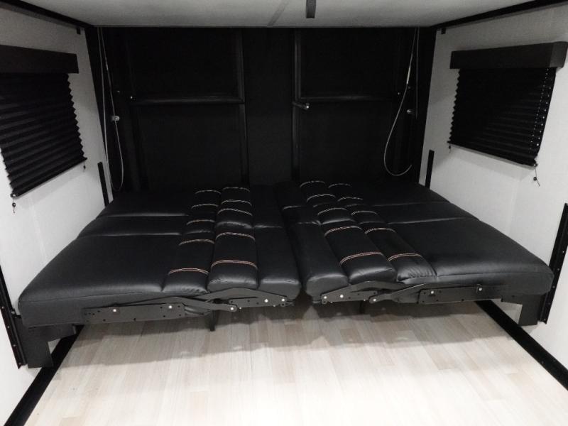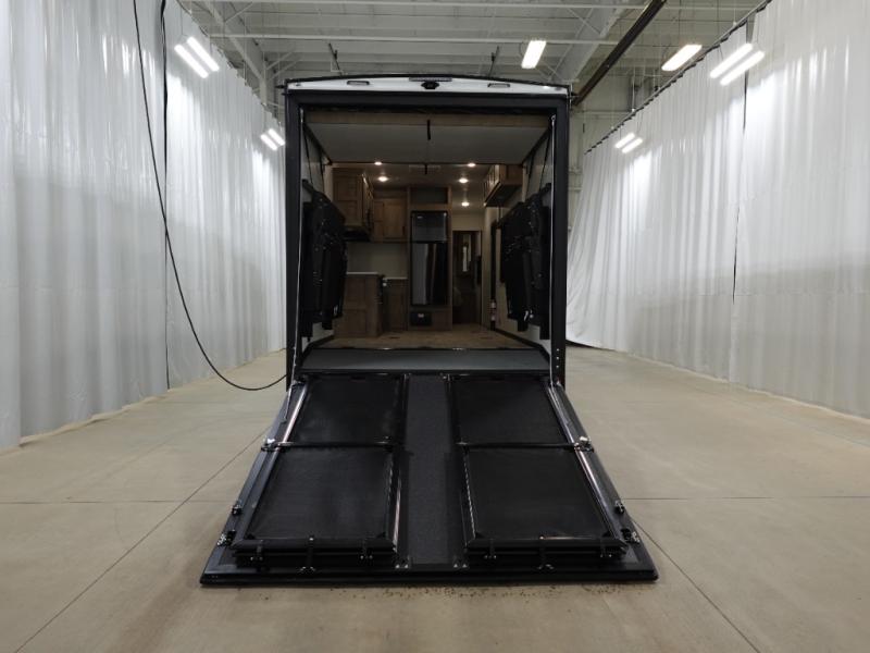 This open concept toy hauler is sure to meet all of your needs. There is a full kitchen with a Furrion three burner gas range and a microwave oven to prepare meals, plus a 10 cu. ft. 12V refrigerator to keep food fresh. You'll find comfortable seating space on the dual opposing sofas with a top queen bed, and there is TV prep if you want to add some entertainment. The RV queen bed in the front master bedroom will bring a great night's rest, and the dual entry bath lets you clean up after trail riding. When you're ready to head home, the 13' 4" garage area includes frame welded tie downs to keep your toys secure.