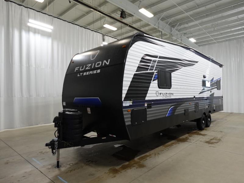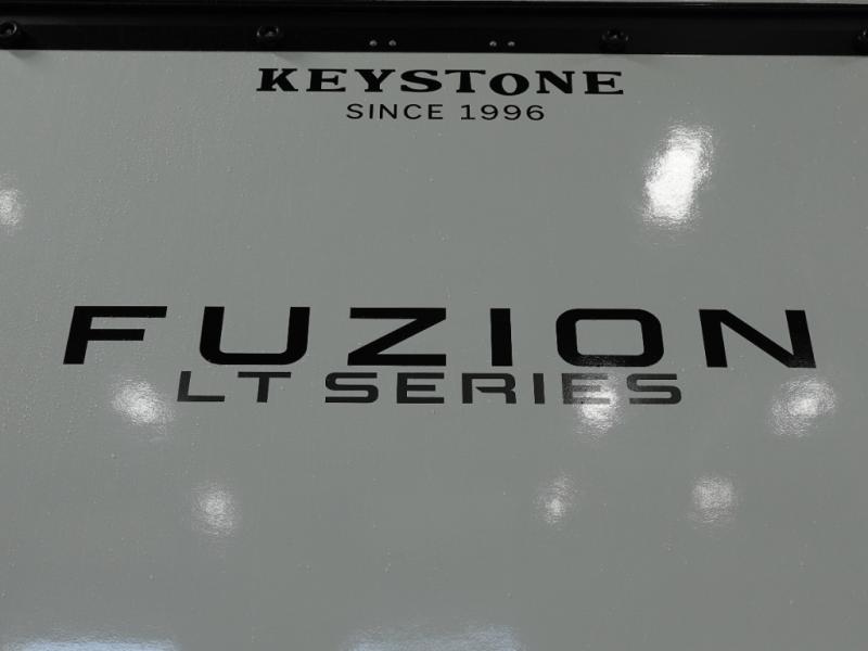 Embrace the great outdoors with a Fuzion Impact Edition toy hauler by Keystone! There is an aluminum exterior and a 8' 4" wide-body construction for your toys and gear! The one-piece polypropylene heated underbelly includes enclosed tanks and valves which will help extend your camping season, and the leaf spring suspension system will provide smooth towing. Head inside to enjoy night shades, hardwood cabinetry, and fiberglass backed linoleum floor with no carpet-free for easy cleaning. Each model also includes a Girard on-demand water heater, two 30 lb. LP tanks, recessed LED puck lighting throughout, and the list of comforts goes on!