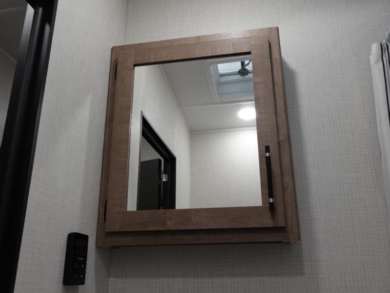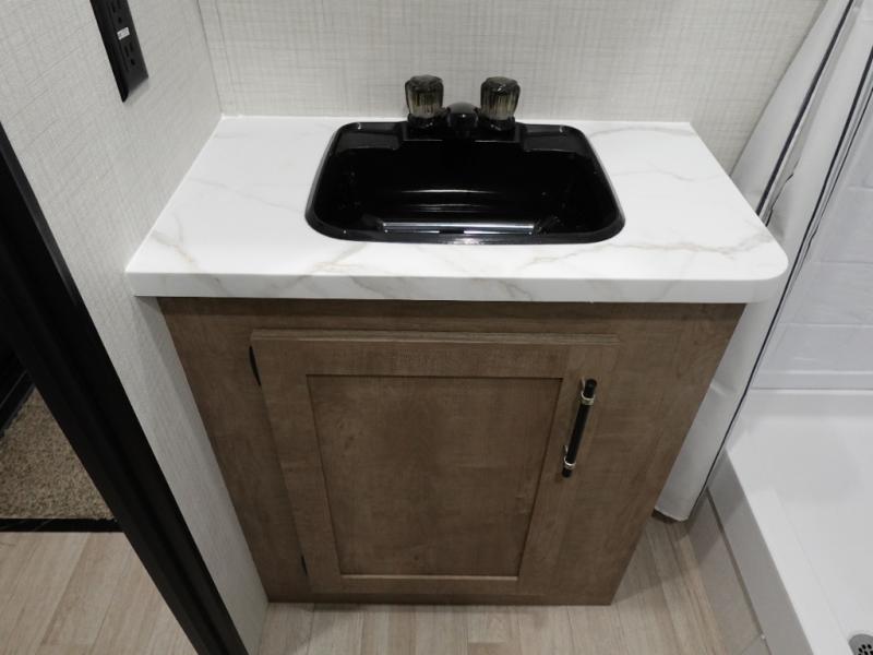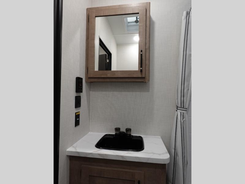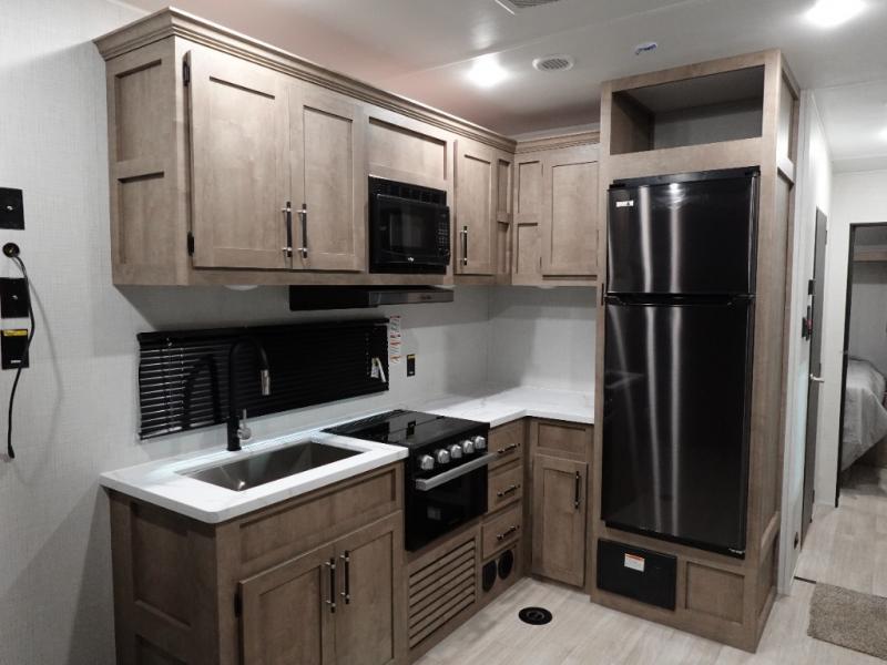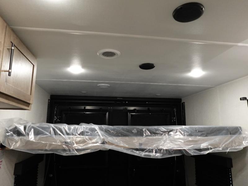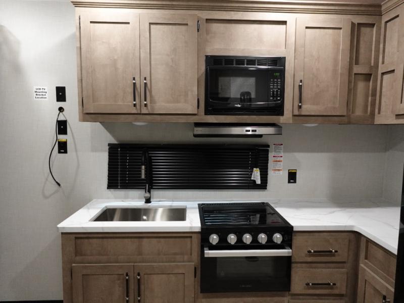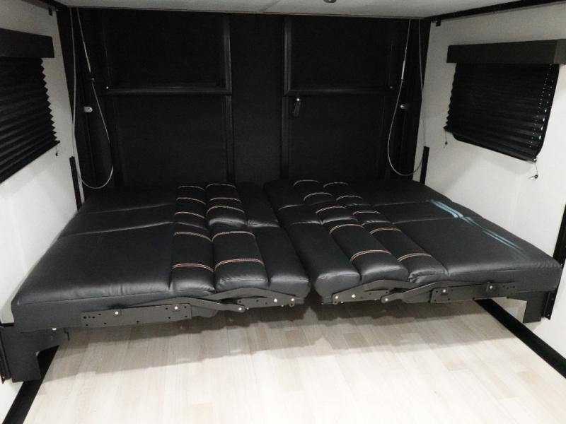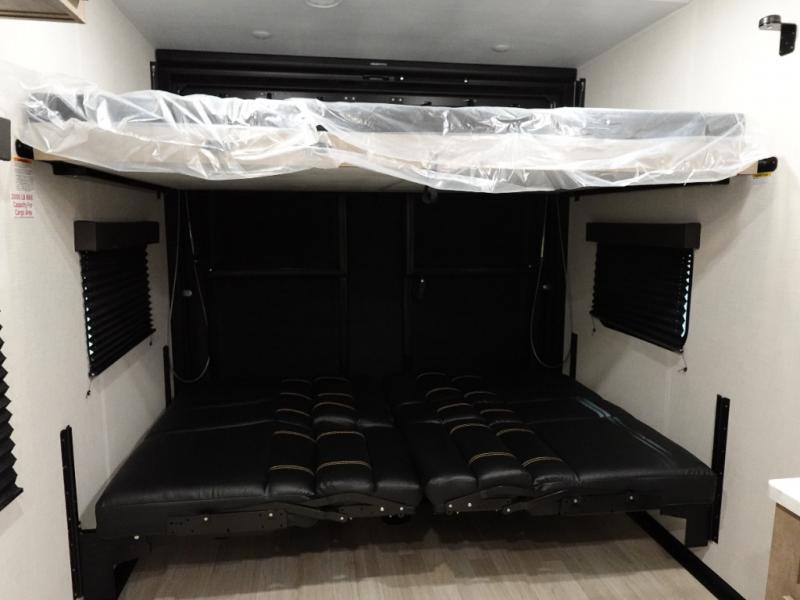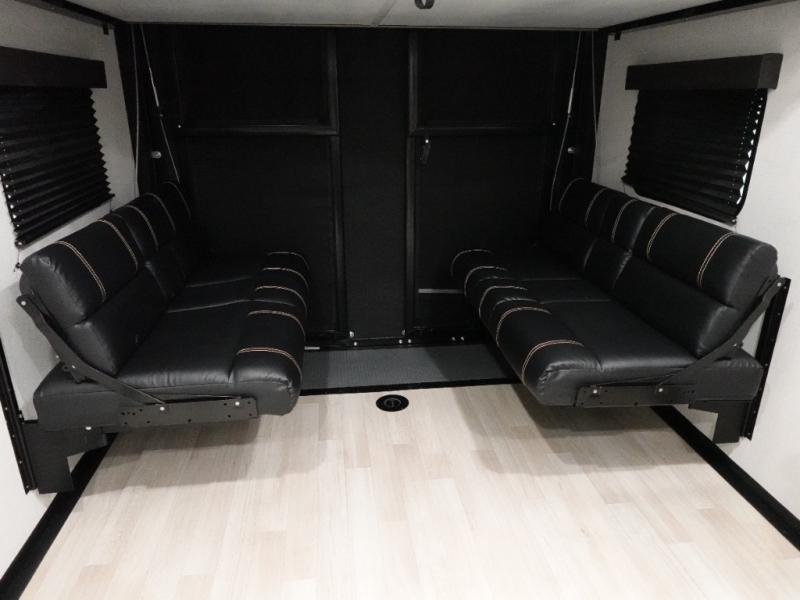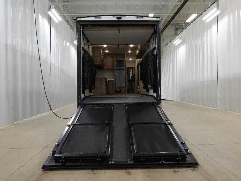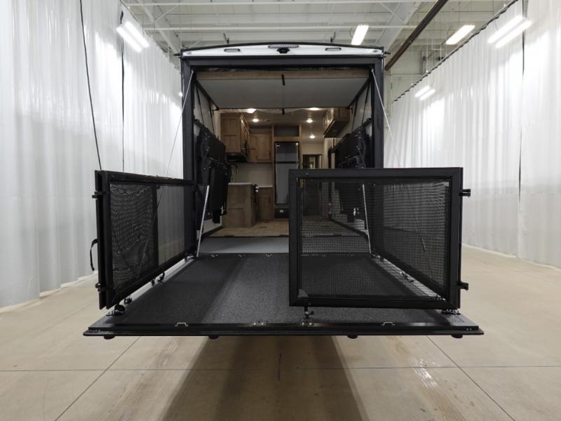 This open concept toy hauler is sure to meet all of your needs. There is a full kitchen with a Furrion three burner gas range and a microwave oven to prepare meals, plus a 10 cu. ft. 12V refrigerator to keep food fresh. You'll find comfortable seating space on the dual opposing sofas with a top queen bed, and there is TV prep if you want to add some entertainment. The RV queen bed in the front master bedroom will bring a great night's rest, and the dual entry bath lets you clean up after trail riding. When you're ready to head home, the 13' 4" garage area includes frame welded tie downs to keep your toys secure.