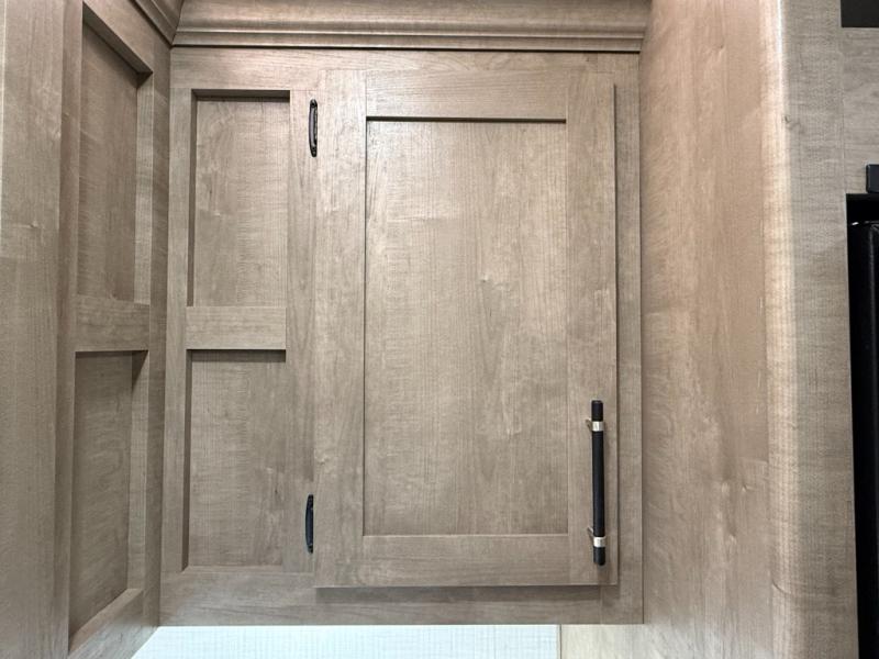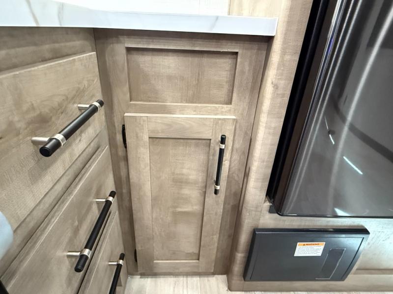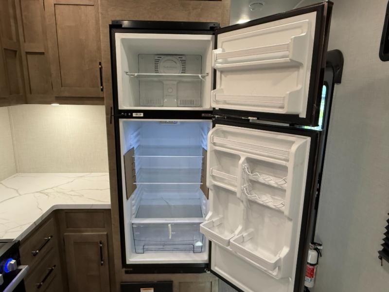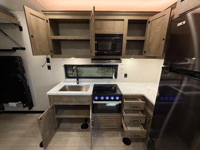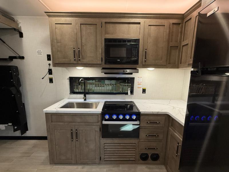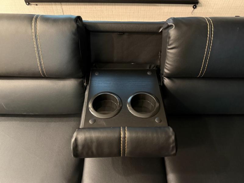 Central Living/Kitchen: Open concept with full kitchen featuring 10cuft 12V refrigerator, 3-burner Furrion range, microwave, plus convertible sofas.